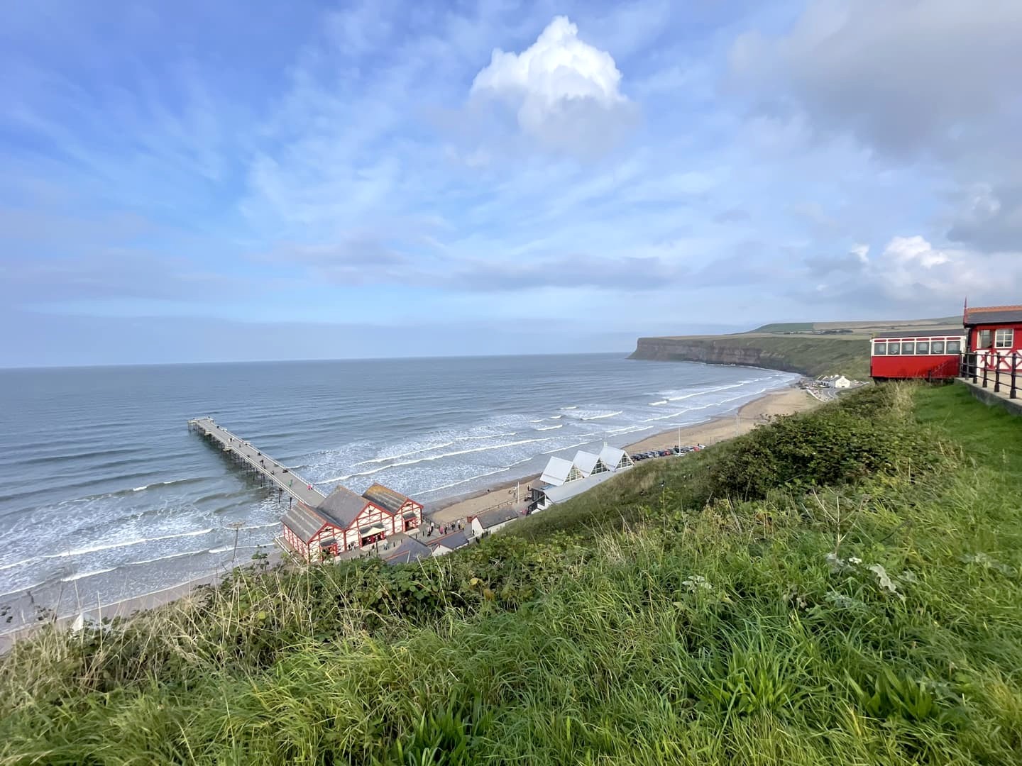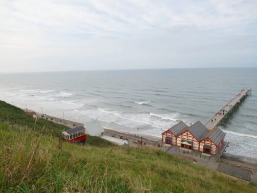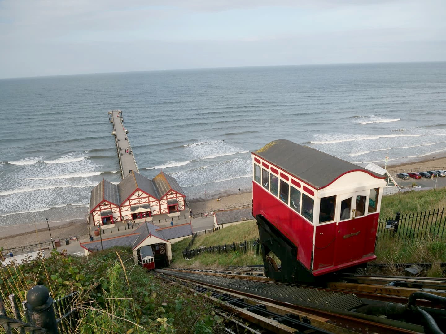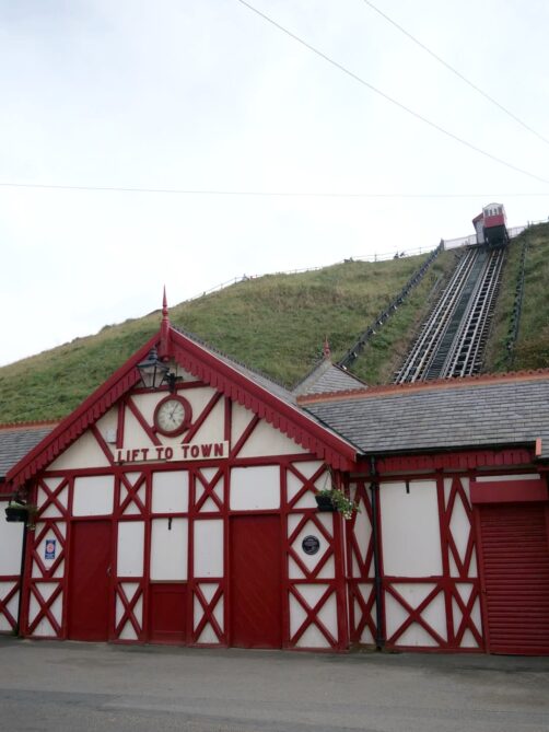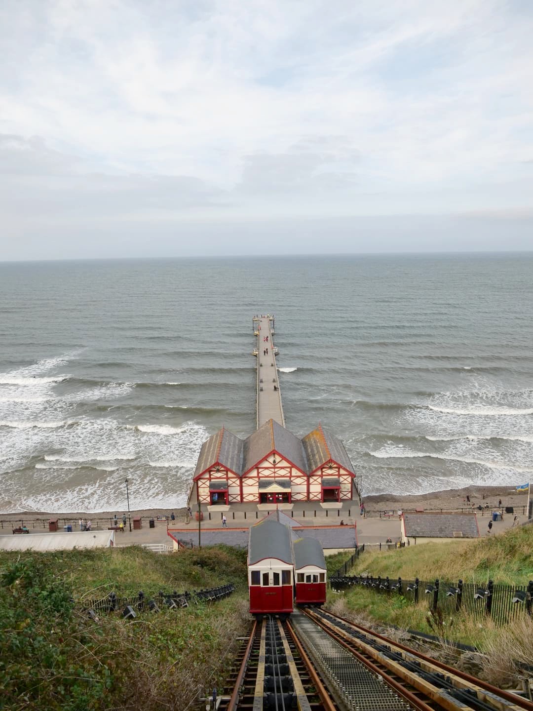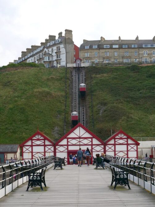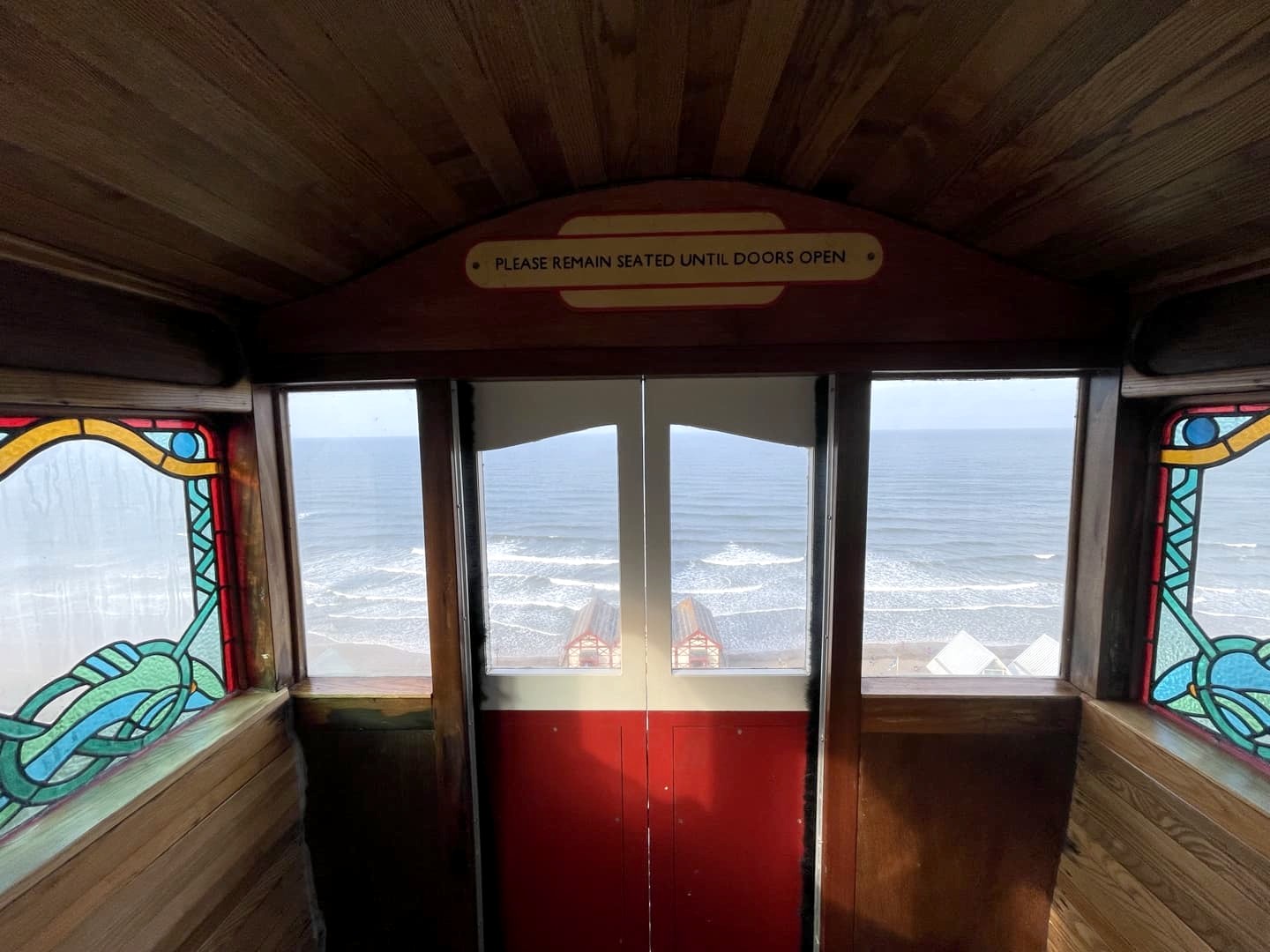 Staithes était notre dernier arrêt dans le parc de North York Moors, mais j’avais repéré un dernier arrêt en continuant à longer la côte encore un peu plus vers le nord : Saltburn-by-the-Sea, une très charmante petite station balnéaire victorienne. Ce qui fait sa particularité, c’est son funiculaire (Saltburn Funicular Railway), construit en 1884, qui est le plus vieux funiculaire fonctionnant à l’eau (oui !) du Royaume-Uni, et au monde. Si vous aimez les endroits qui vous font remonter le temps, vous allez adorer cette expérience ! Les cabines sont toujours celles d’origine, avec de superbes vitraux.