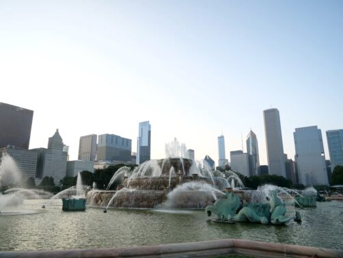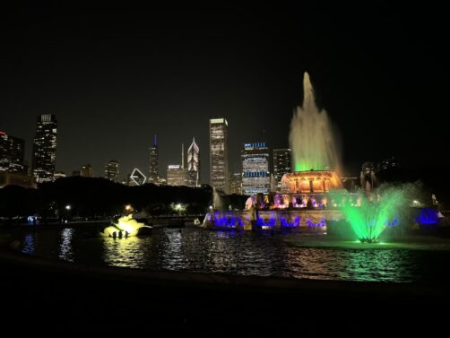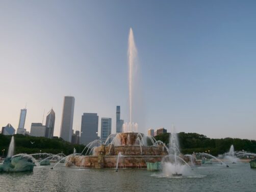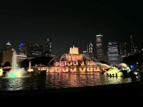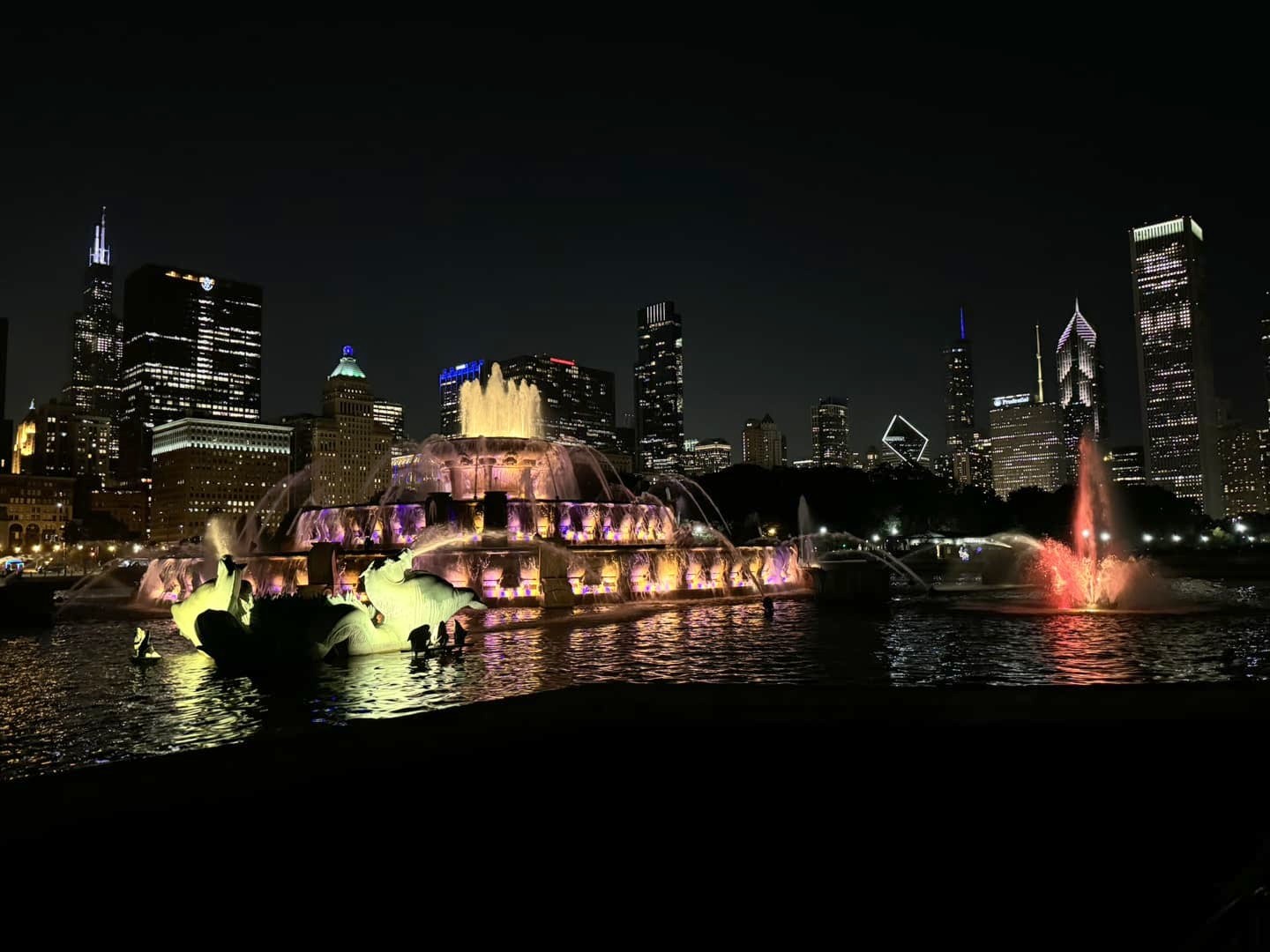 Le parc voisin abrite une autre « attraction » populaire, la Buckingham Fountain. Cette énorme fontaine, qui serait inspirée par celles de Versailles, offre le soir un « spectacle sons et lumières ». En tout cas, c’était ce que j’avais lu sur papier, car il n’y avait aucun son ce jour-là, et le jeu de lumières était assez limité. L’endroit est tout de même sympa car il offre une belle vue sur les gratte-ciel de Chicago en arrière-plan, mais ne vous attendez pas non plus à un spectacle grandiose le soir.
