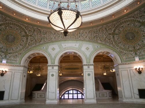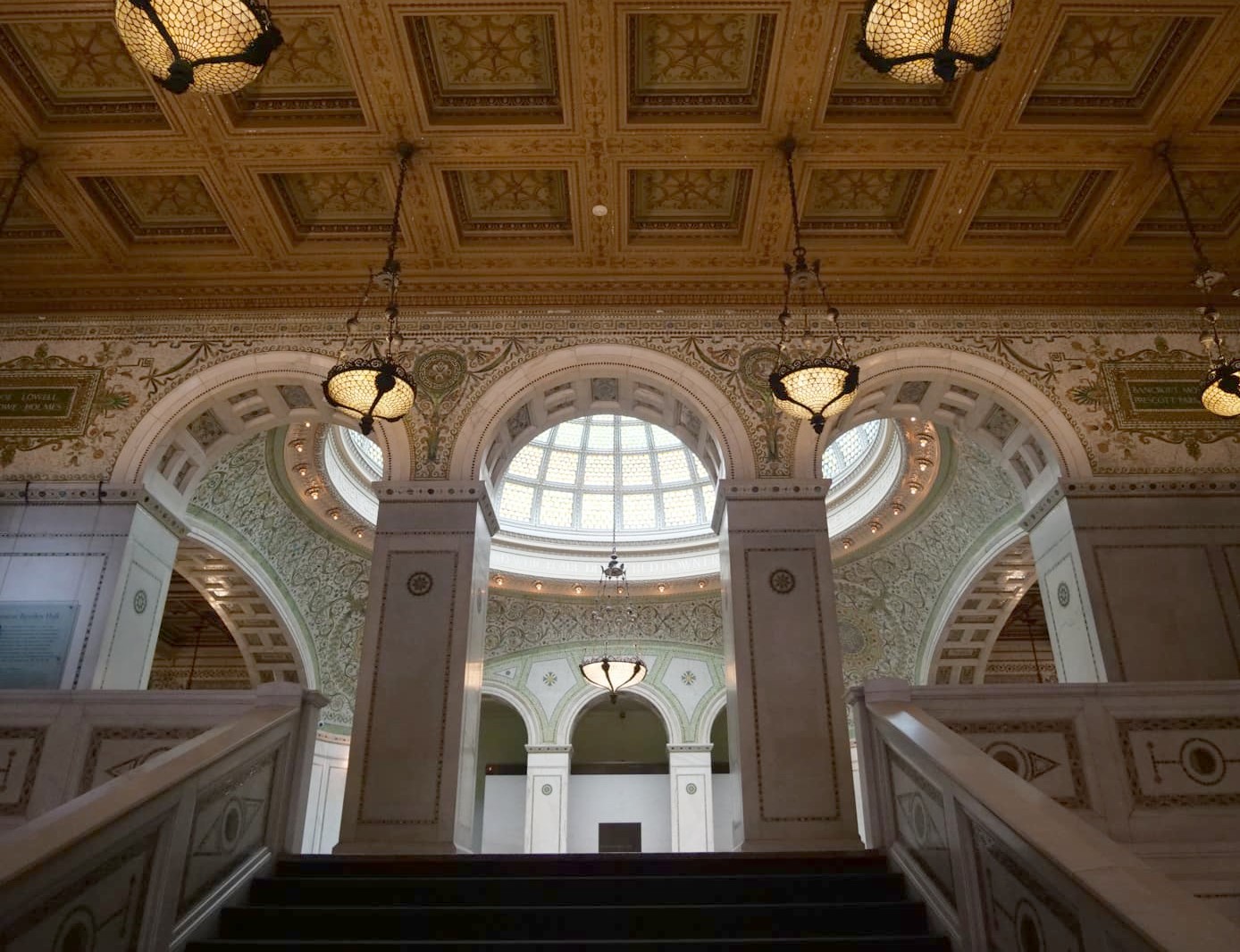 Mais le plus bel intérieur du quartier, c’est sans aucun doute celui du Chicago Cultural Center, accessible gratuitement. En montant les escaliers, vous découvrirez le plus grand dôme en verre Tiffany au monde, vraiment splendide ! On pourrait passer à côté si l’on ne sait pas qu’il est là, mais ne faites pas cette erreur.