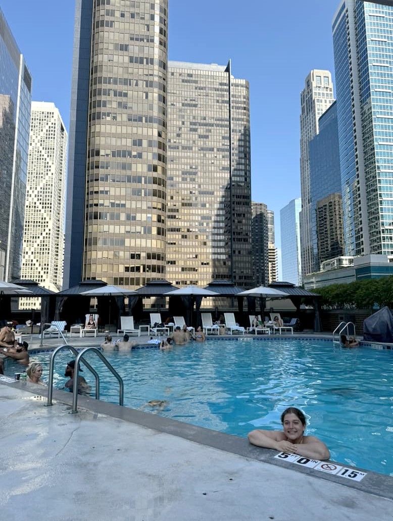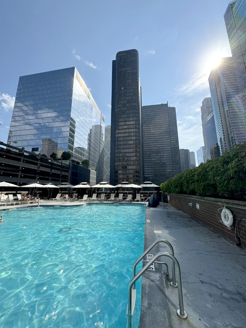 J’ai séjourné à proximité du Magnificent Mile (côté Streeterville) au Hilton Grand Vacations Club Chicago Magnificent Mile, qui partage le même bâtiment que le DoubleTree by Hilton Hotel Chicago Magnificent Mile. La différence entre les deux parties, c’est la gamme des chambres : la partie Grand Vacations est plus luxueuse, et a été récemment rénovée, les chambres du DoubleTree sont plus moyen de gamme (mais aussi bien plus abordables). Notre chambre se situait au 25ème étage (avec une vue partielle sur le lac), le lit était immense et très confortable, et il y avait même un mini espace « cuisine » avec frigo, évier et micro-ondes. A part ça, vous aurez accès aux mêmes espaces communs, à savoir en particulier le très agréable espace piscine, raison principale pour laquelle j’avais choisi cet hôtel ! Et je peux vous dire que la baignade en pleine canicule, après une journée de visites, était vraiment très agréable ! La piscine était très propre et bien assez chaude en été.
