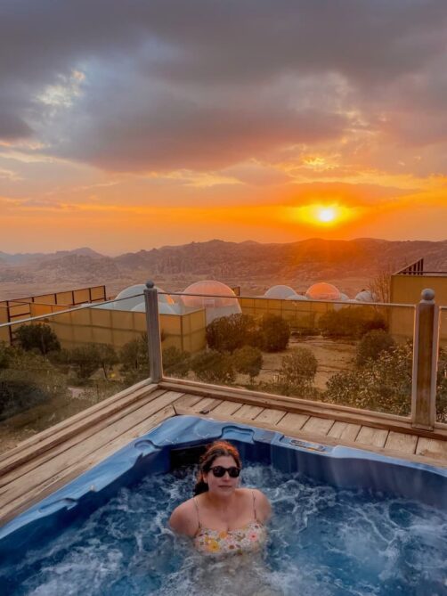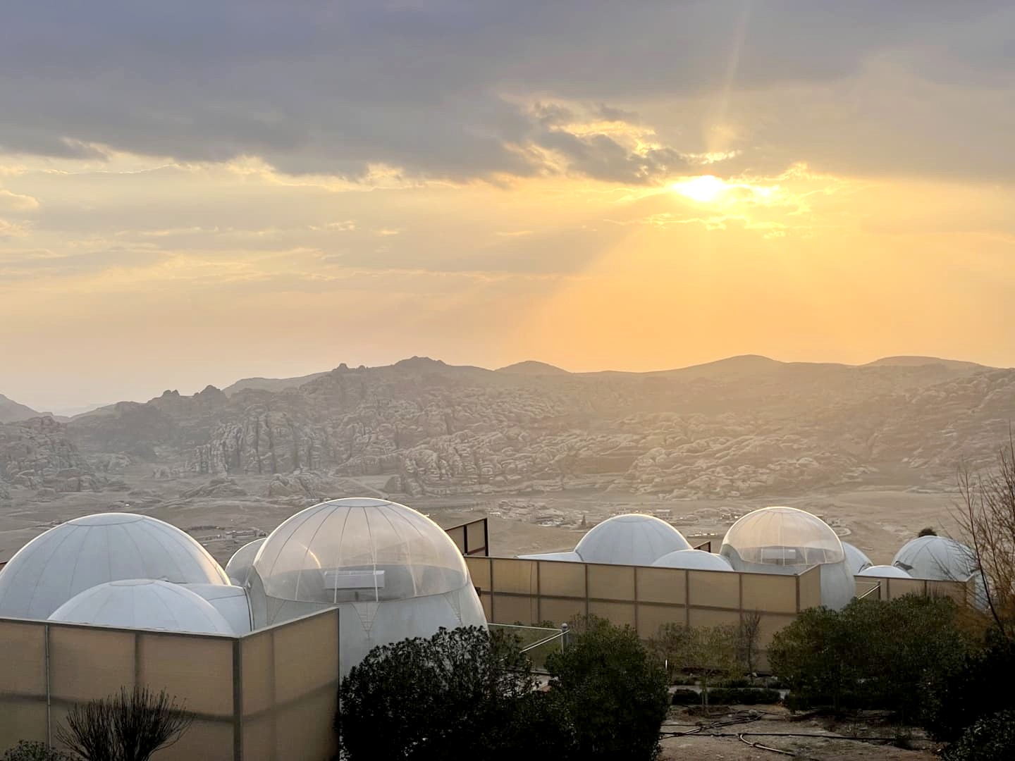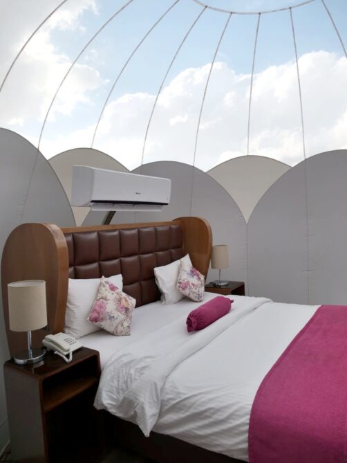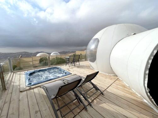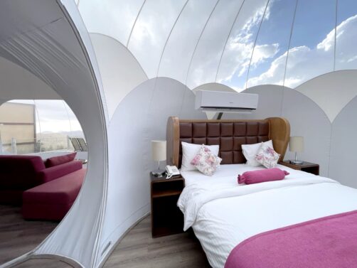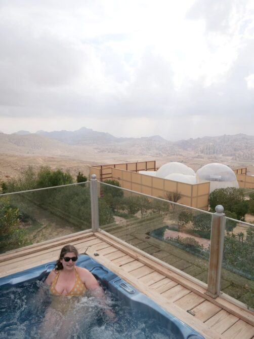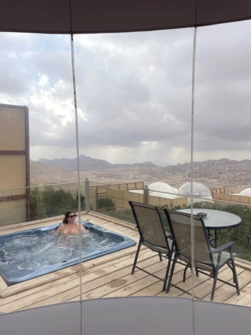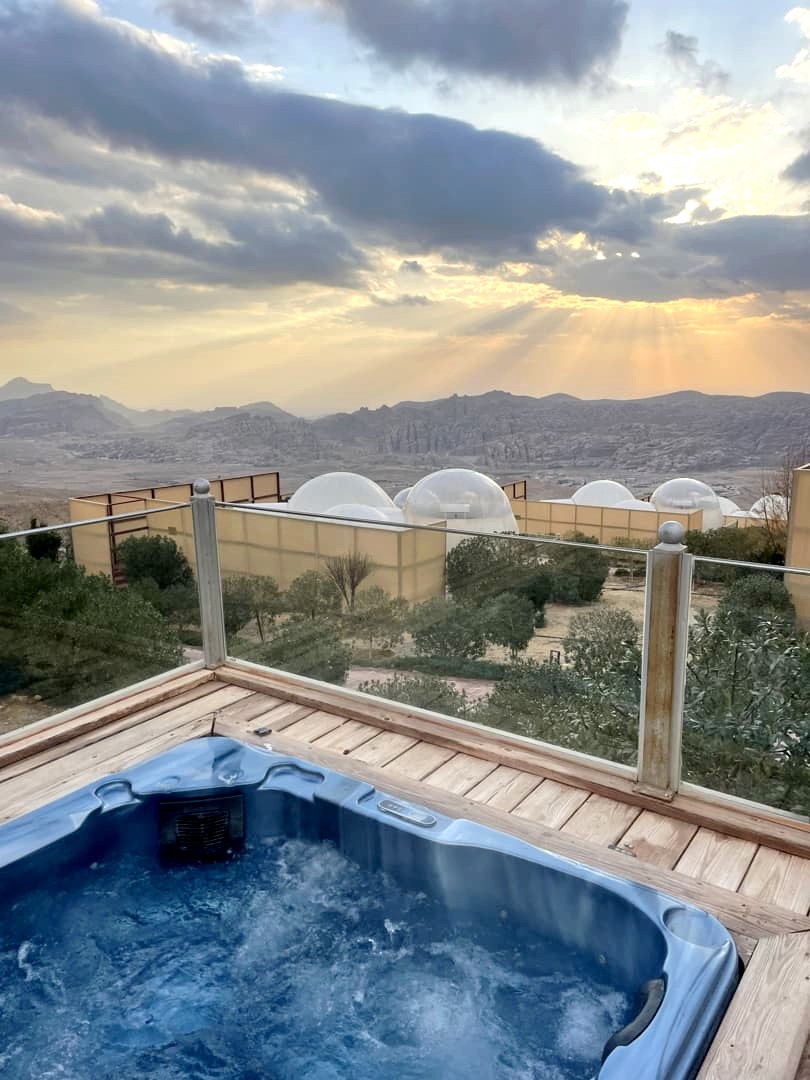 Comme nous avions opté pour des hébergements plutôt abordables durant le reste de notre voyage, nous avons décidé de nous faire plaisir pour nos deux dernières nuits en Jordanie, avec l’option glamping la plus luxueuse des environs de Petra : le Petra Bubble Luxotel, situé à proximité du site de Little Petra. Le cadre au milieu de nulle part est splendide, encore plus au lever et au coucher du soleil !