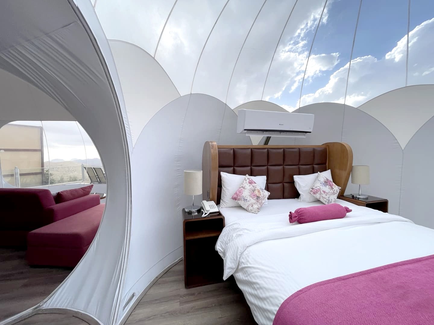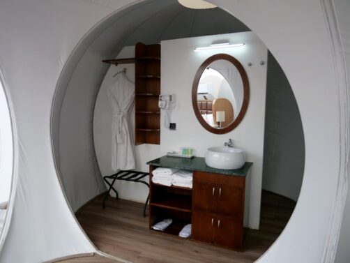 Ce qui rend cet endroit unique, ce sont ses hébergements en bulles (semi-)transarentes, très spacieuses et avec chacune leur jacuzzi privé sur la terrasse – un très grand luxe ! Surtout qu’ici, pas de problème de propreté puisqu’il sera rempli pour vous chaque jour à l’heure que vous le souhaitez (il suffit juste de les prévenir un peu à l’avance !). L’intérieur de la bulle est très confortable, puisqu’il s’agit en réalité de « doubles » bulles, avec un premier espace salon, à l’arrière duquel se trouve la salle de douche, puis l’espace chambre, avec un lit bien confortable.