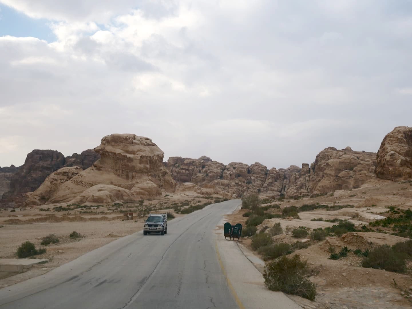 Pour la navette 4×4, ça ne sert à rien d’arriver trop tôt car elle ne part que lorsqu’elle est remplie (ça peut prendre un peu de temps…) : officiellement, elles partent de 7h30 à 15h. On ne peut pas non plus réserver : vous payez sur place 5 JOD par personne au guichet qui se trouve à l’entrée de Little Petra. Nous avions lu que certains taxis acceptaient de vous déposer au même endroit que la navette, alors que c’est théoriquement interdit, mais il semblerait que les contrôles se soient renforcés car plus aucun taxi ne semble accepter de le faire. La navette partagée est donc la seule option disponible pour ne pas marcher toute la distance.
