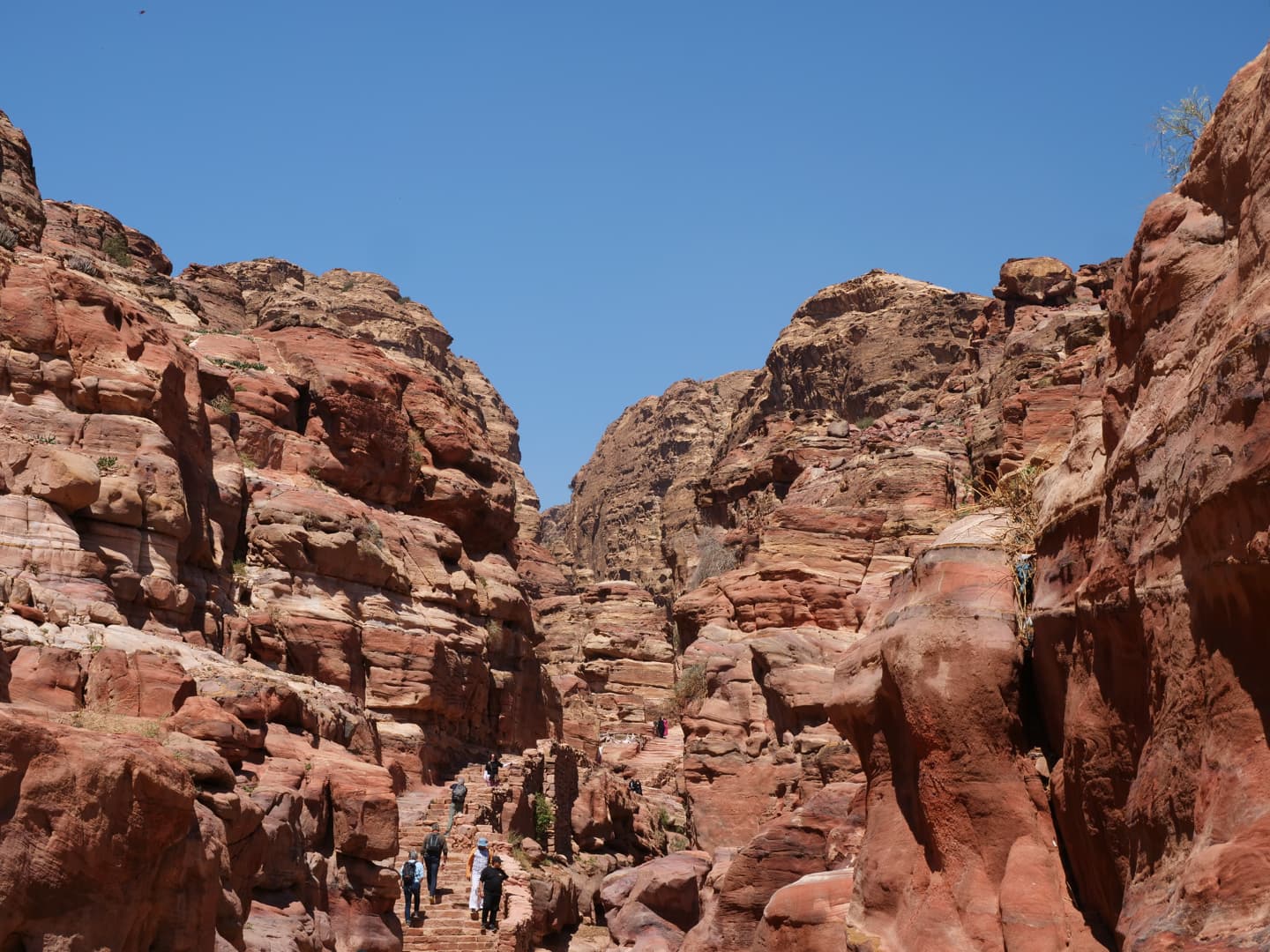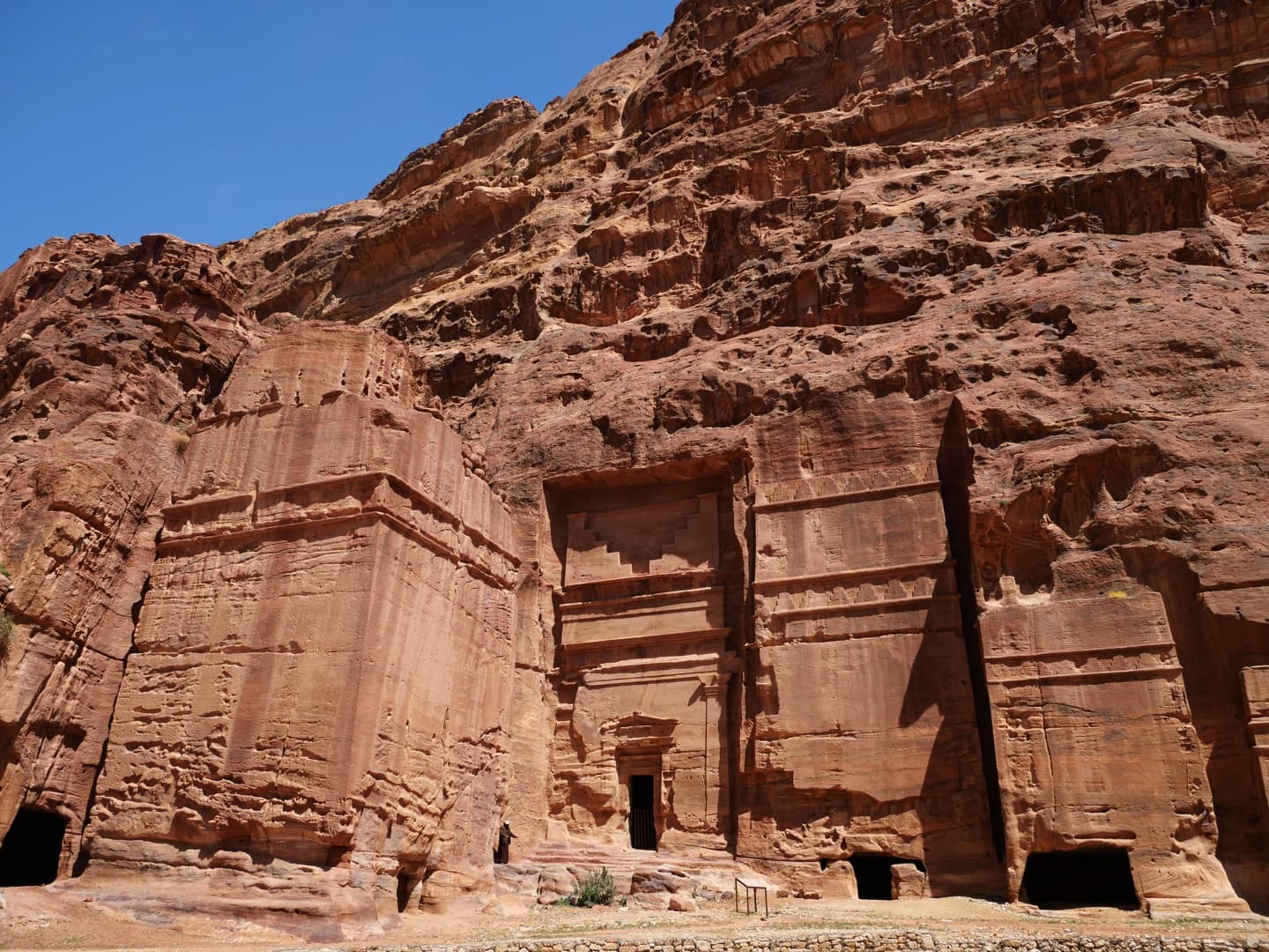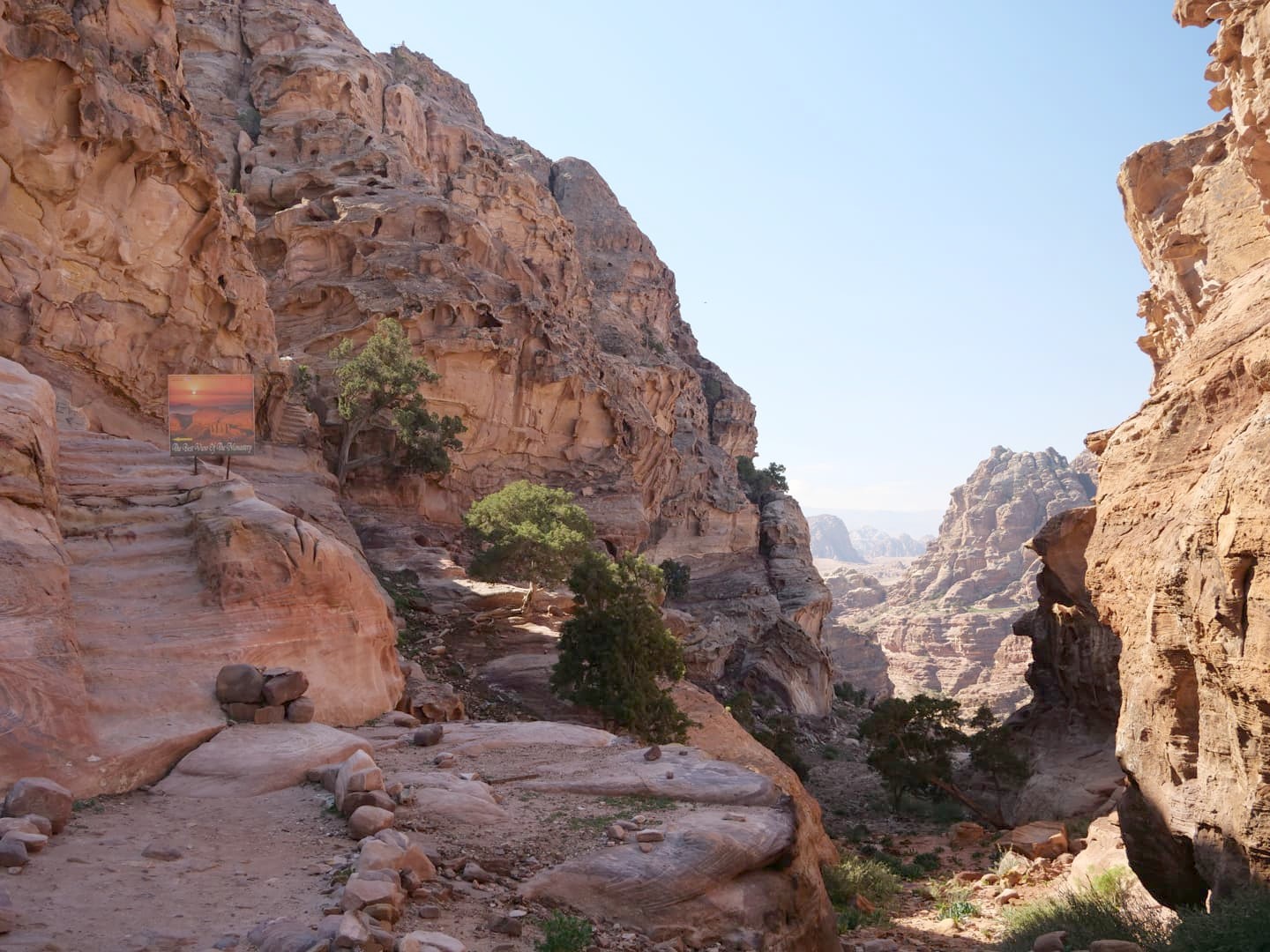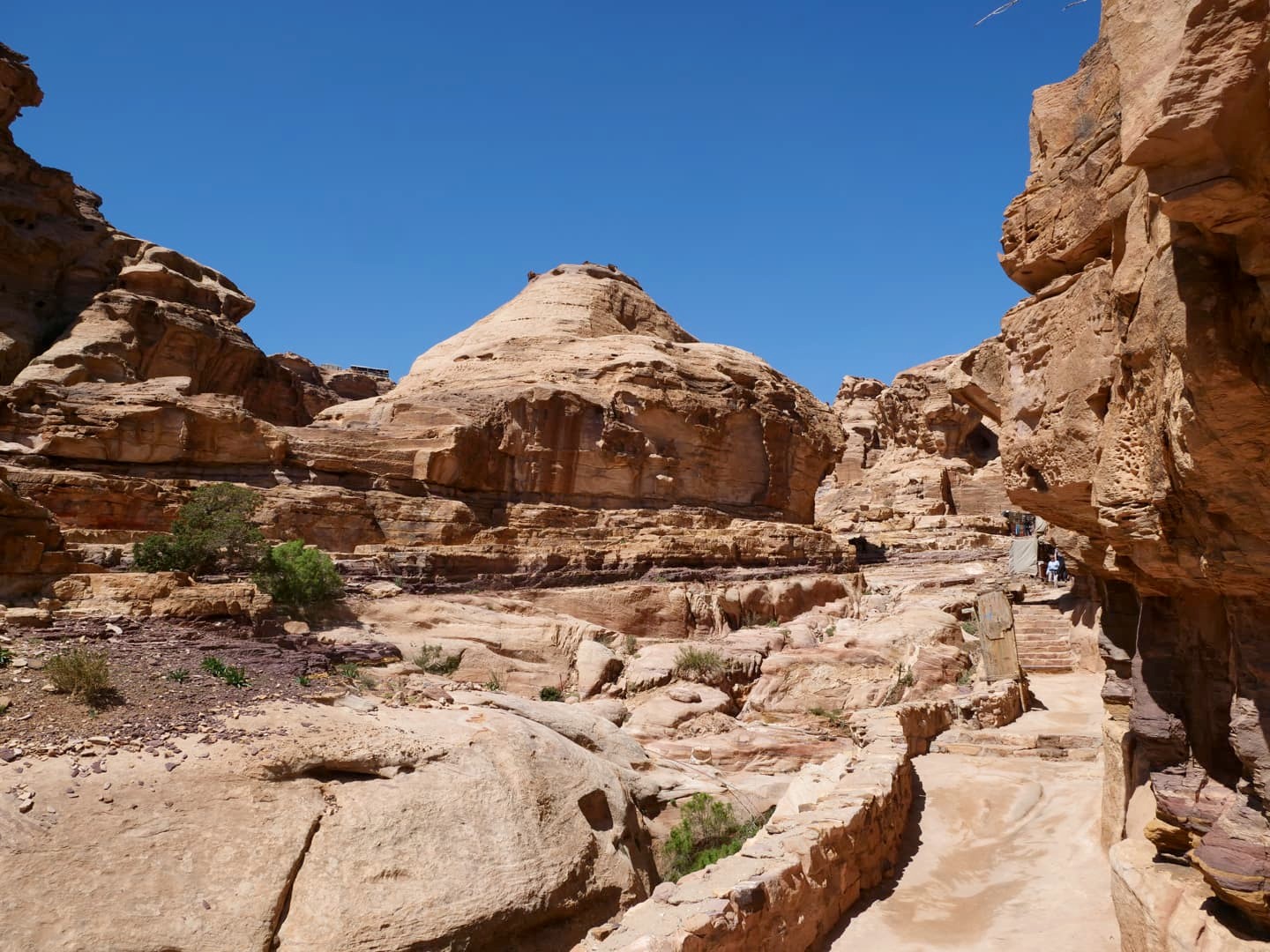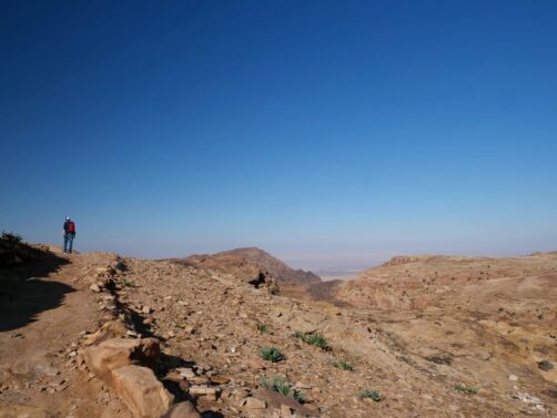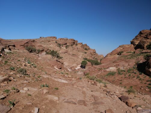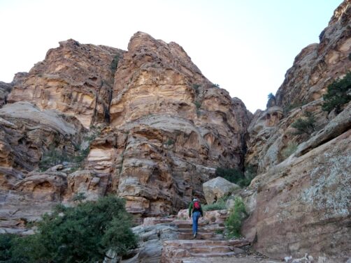 Depuis le chemin principal qui traverse la ville basse, il y a quelques petites randonnées qu’il est possible de faire vers des endroits encore plus reculé : outre le sentier menant au point de vue sur le Trésor (qui était donc fermé), il y a aussi le sentier qui permet de grimper jusqu’au « High Place of Sacrifice », un ancien autel nabatéen qui offre des vues en hauteur sur le site (nous l’avions gardé pour la fin si nous avions encore le courage après avoir vu le reste, mais finalement nous avions déjà trop marché !). On a préféré se contenter d’une petite boucle tout de même sympa qui part au niveau du Qasr al-Bint (cherchez les escaliers dans la roche un peu à l’arrière).