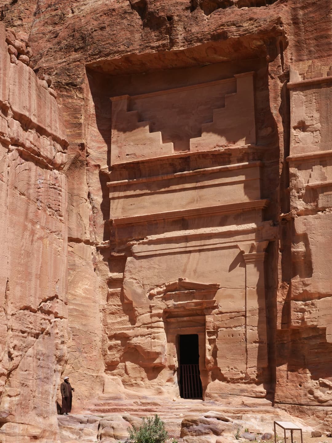 Vous avez sans doute vu des photos en hauteur face au Trésor : je tiens à préciser que tous les sentiers qui menaient aux vues surélevées sur le Trésor étaient fermées lors de notre voyage. Si j’ai bien compris, il s’agissait surtout d’un conflit entre le site et les Bédouins qui y « vivent » (alors que c’est interdit depuis le classement UNESCO), puisque ceux-ci demandent aux touristes qui y accèdent de payer un droit de photo, alors que l’entiereté du site est sensée être gratuite après avoir payé l’entrée. N’hésitez pas à nous prévenir en commentaire si ces spots sont à nouveau accessibles si vous visitez Petra après avoir lu cet article ! Si c’est ouvert, il y a en réalité deux spots : le moins élevé (mais moins « officiel ») en crapahutant sur la gauche quand vous faites face au Trésor, et le plus elevé accessible par un escalier (qui était fermé par des grilles) qui se situe à la fin des Tombes Royales (Al-Khubtha Trail).
