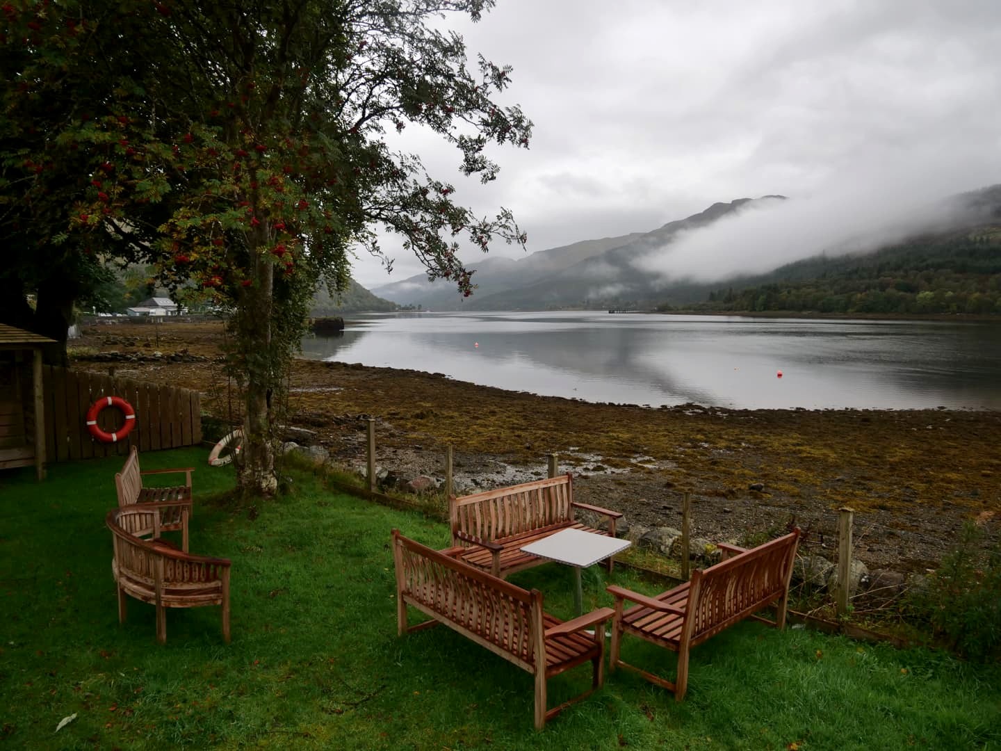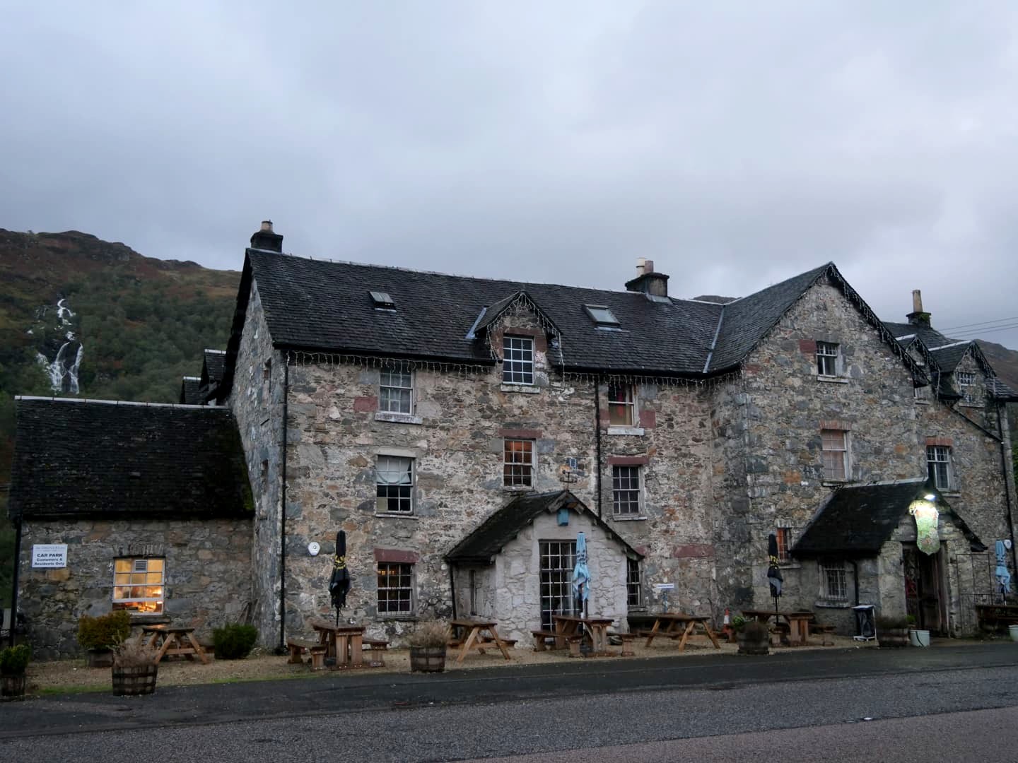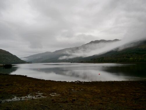 Pour la nuit du retour, nous avons séjourné à Arrochar, un petit village qui se trouve à l’intérieur du parc national, le long du Loch Long, qui n’est pas un lac mais un « fjord » d’eau salée (le mot loch peut désigner les deux). Si nous avions choisi ce village, c’est parce qu’il s’est trouvé au coeur de l’intrigue d’un des épisodes de la série « Black Mirror » qui m’a le plus marquée. C’est en effet ici qu’a été tourné l’épisode « Loch Henry » (Saison 6 Episode 2), en particulier au pub de la Village Inn (qui fait aussi hôtel). On a préféré dormir à la Lochside Guest House, moins chère et avec des chambres avec vue directe sur le loch (sublime au petit matin !).