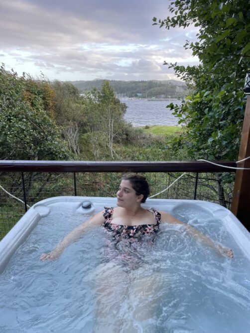 Pour notre seconde nuit, nous avons logé dans l’un des villages les plus « animés » (bon, tout est relatif) de l’ouest, Lochinver. Il est entouré de plusieurs jolies plages et on y a trouvé les meilleures tourtes d’Écosse (voir plus bas), donc à nouveau ce fut une base parfaite ! Nous y avons logé dans un autre hébergement de glamping, le Mountview Pod, qui est une véritable pépite ! On trouve rarement des pods avec jacuzzi aussi confortables à un prix aussi correct que celui-ci en Ecosse. C’est assez petit mais super cosy et très bien agencé. Et la terrasse avec le jacuzzi avec vue sur la mer est juste incroyable…