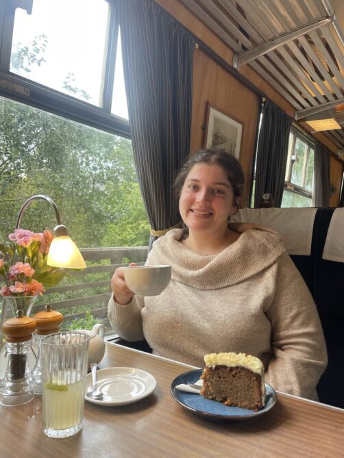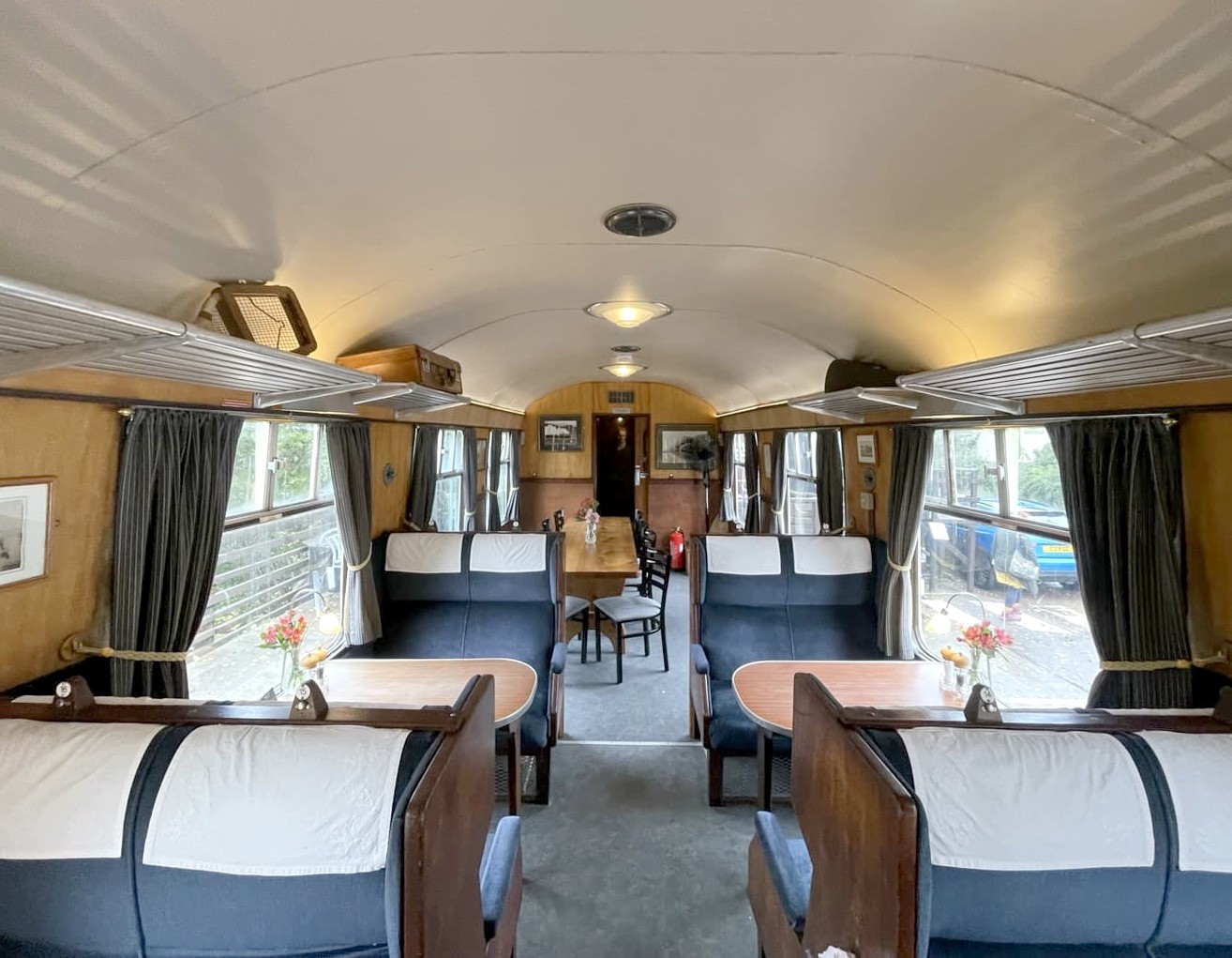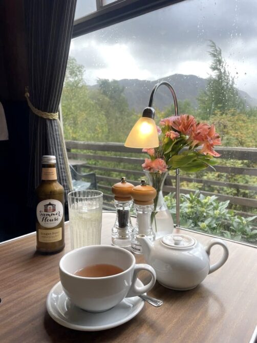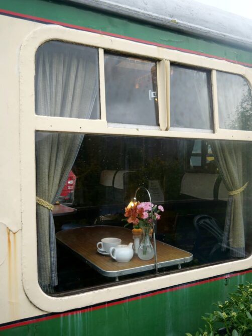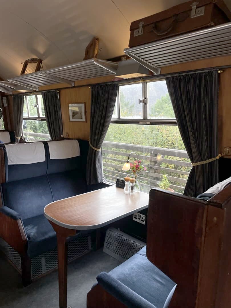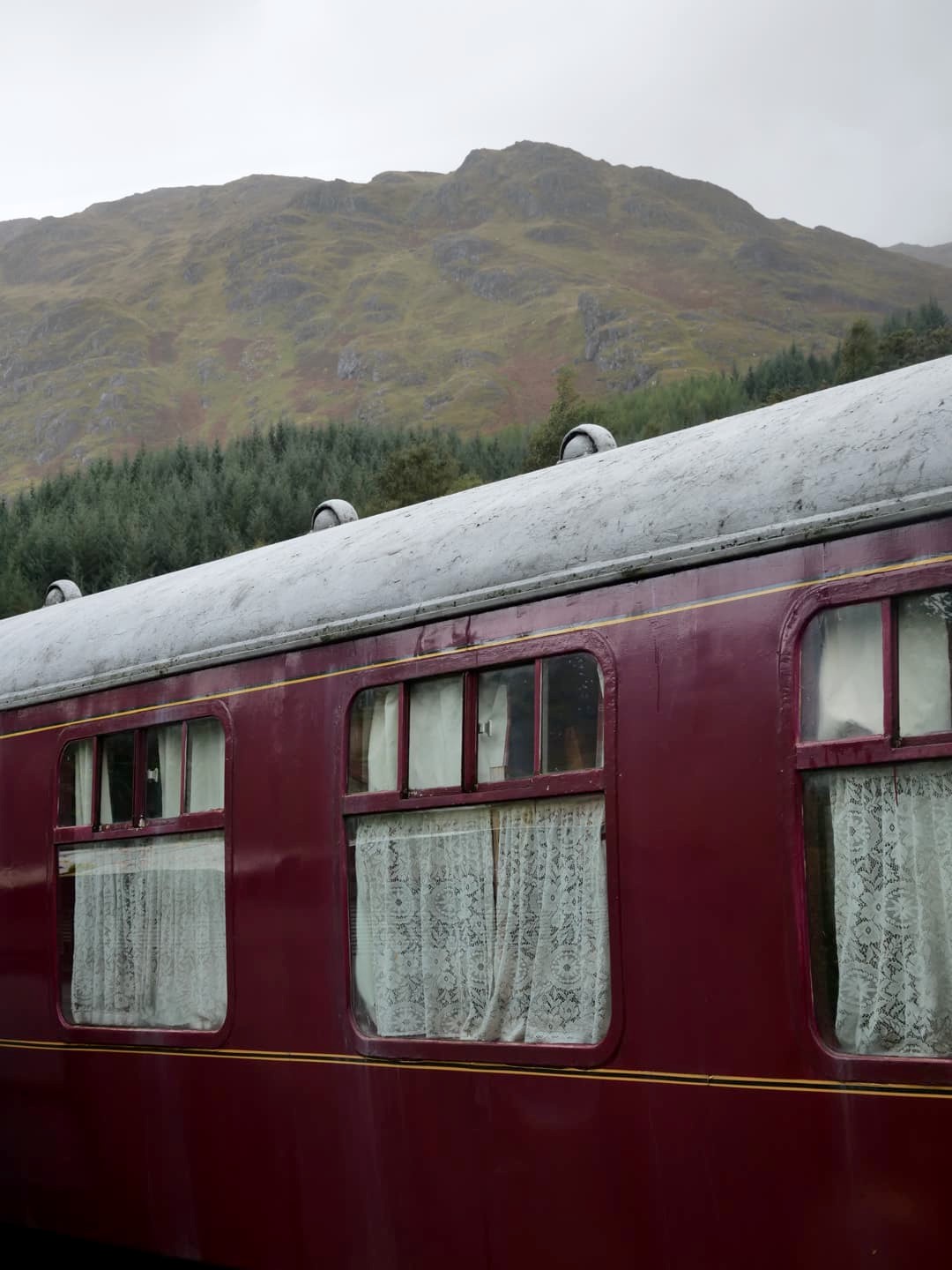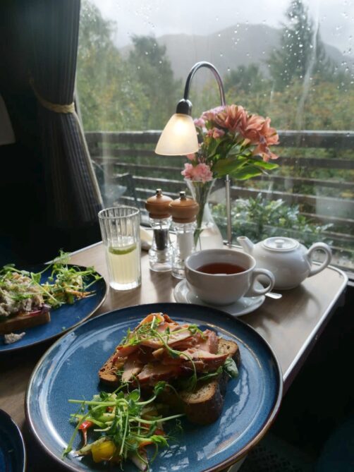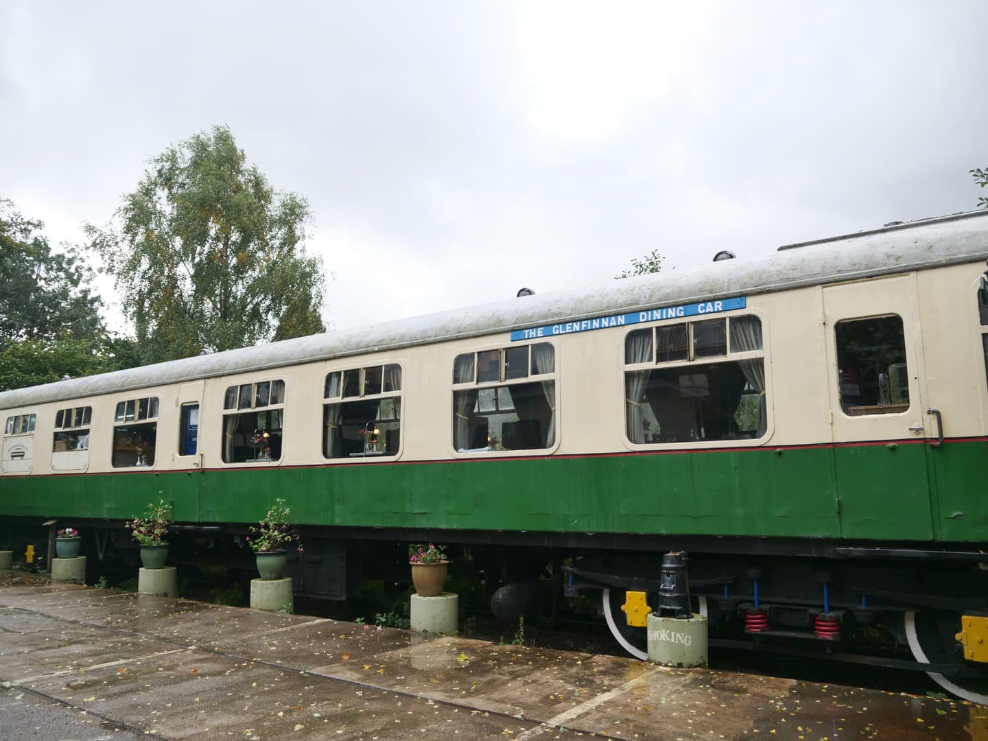 Ce que la plupart des touristes qui viennent voir passer le train ne savent pas (et c’est une grande erreur !), c’est qu’à la gare de Glenfinnan, juste à côté, il est possible de manger dans un vieux train ! Si vous ne pouvez pas monter à bord du Jacobite Steam Train, c’est l’alternative parfaite : le cadre est tout aussi charmant et rappelle aussi le Poudlard Express, c’est beaucoup plus pratique, et ça coûte moins cher !