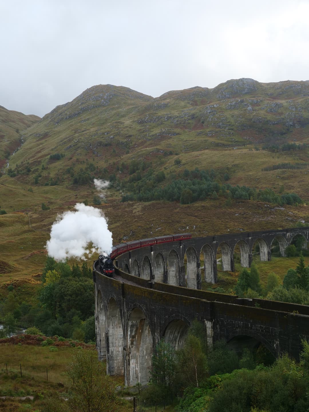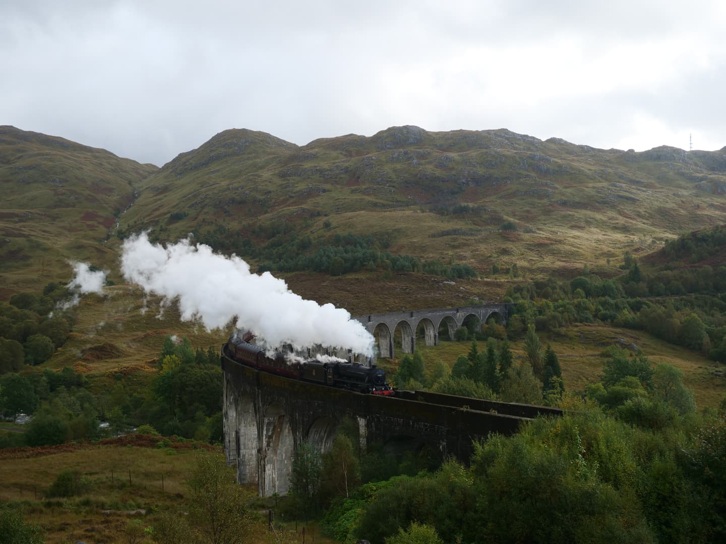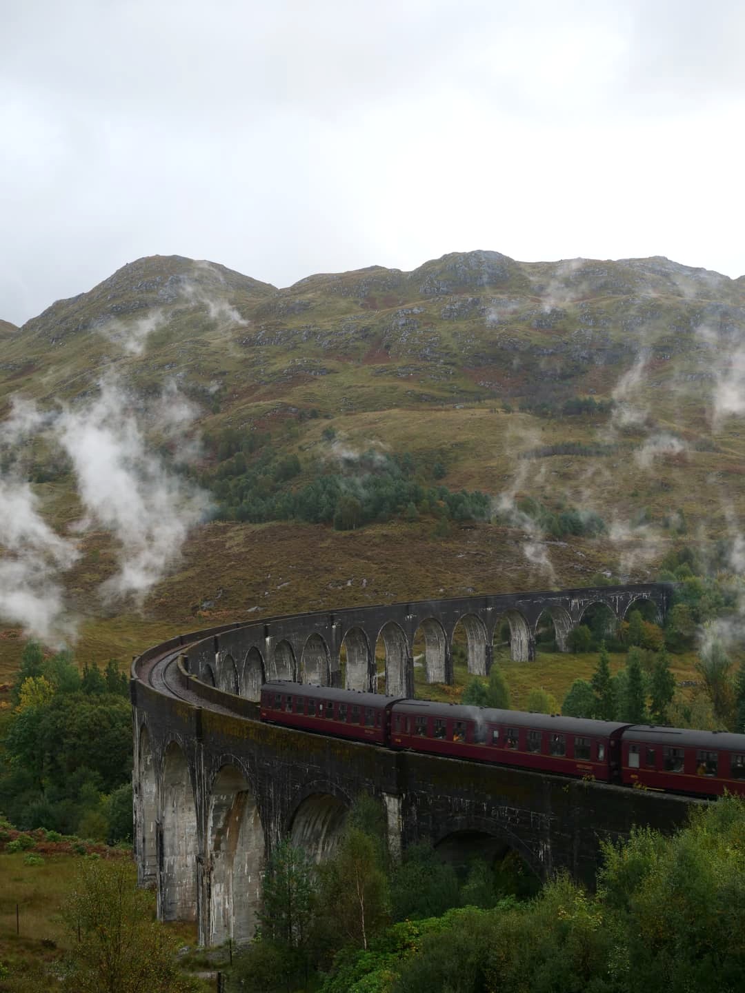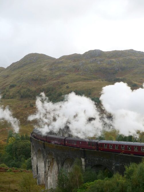 Le Glenfinnan Viaduct est emprunté par plusieurs trains, mais pour avoir le train à vapeur comme dans Harry Potter, vous devez y aller pour le passage du Jacobite Steam Train, son équivalent bien réel, qui y passe deux fois par jour en haute saison. Celui-ci relie Fort William à Mallaig, et s’il est assez difficile (et cher) de monter à bord de celui-ci, ne vous inquiétez pas, j’ai une super alternative pour parfaire votre expérience après l’avoir vu passer sur le viaduc (voir un peu plus bas)…