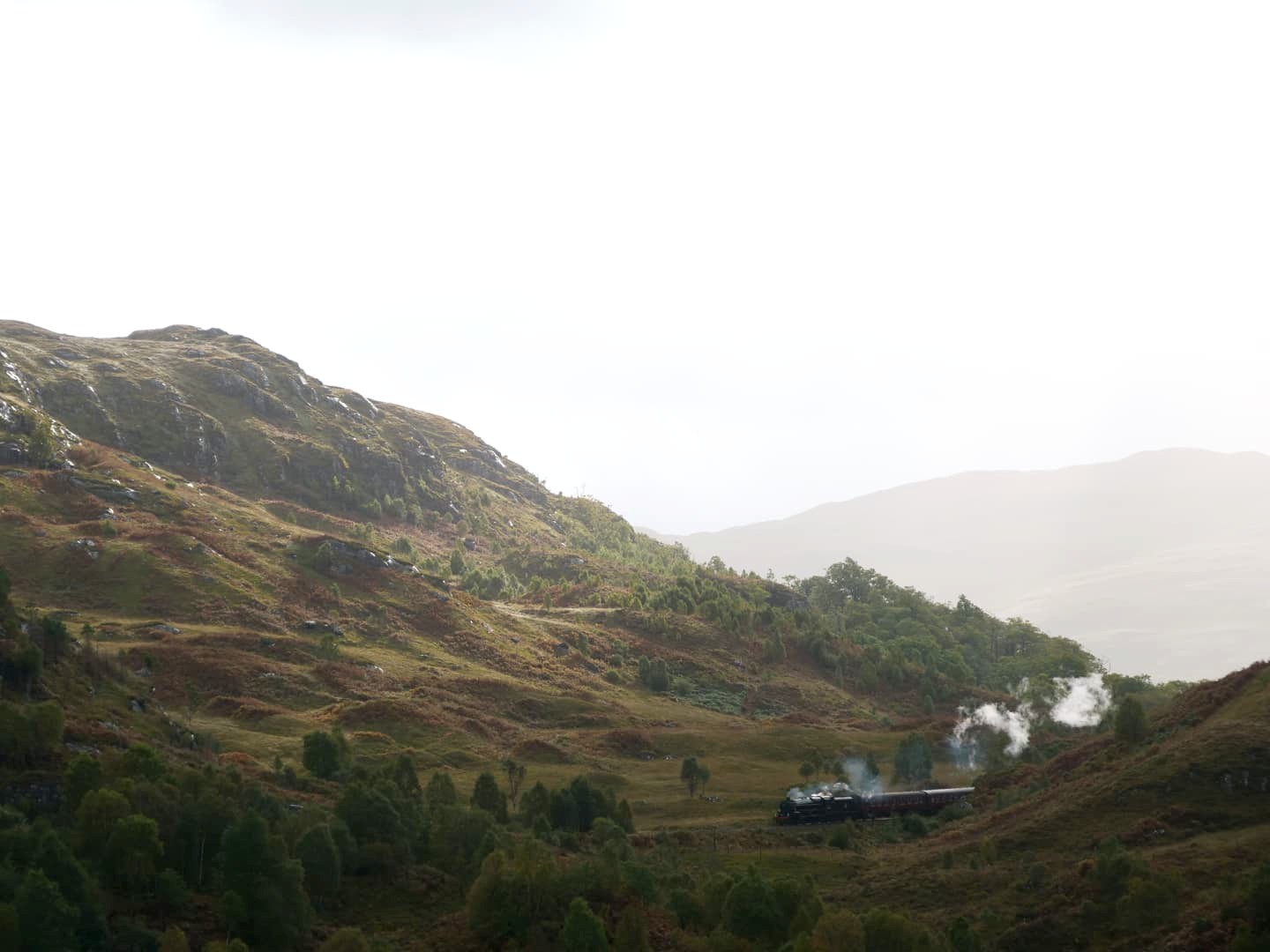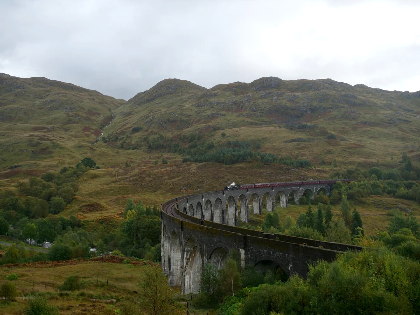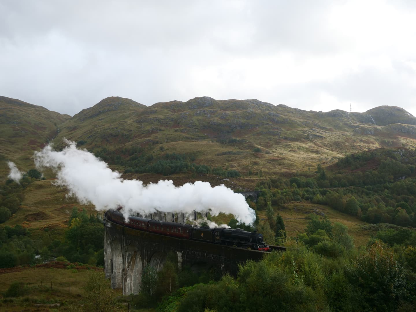 Le Glenfinnan Viaduct est emprunté par plusieurs trains, mais pour avoir le train à vapeur comme dans Harry Potter, vous devez y aller pour le passage du Jacobite Steam Train, son équivalent bien réel, qui y passe deux fois par jour en haute saison. Celui-ci relie Fort William à Mallaig, et s’il est assez difficile (et cher) de monter à bord de celui-ci, ne vous inquiétez pas, j’ai une super alternative pour parfaire votre expérience après l’avoir vu passer sur le viaduc (voir un peu plus bas)…