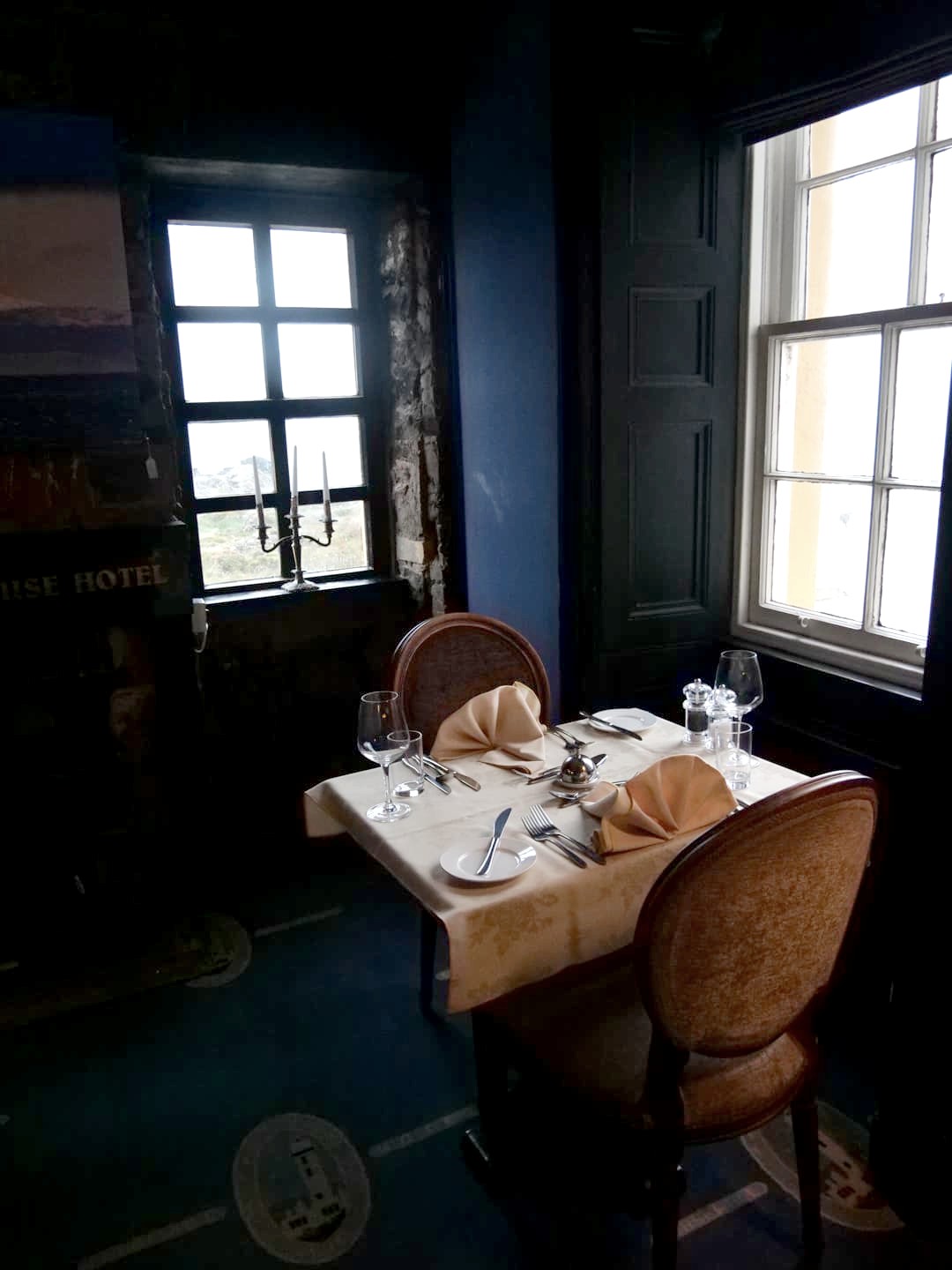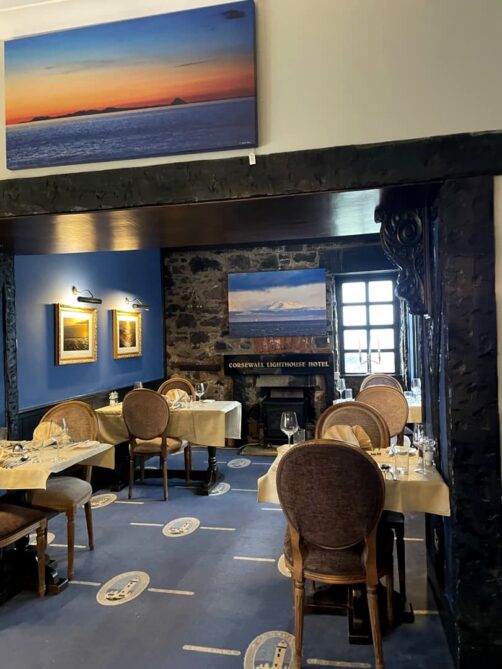 La Corsewall Lighthouse Hotel and Restaurant se trouve dans un cadre on ne peut plus paisible, à l’extrémité ouest de l’Écosse, face à Belfast, de l’autre côté de la Mer d’Irlande. C’est une région de pâturages, et à part des moutons, nous ne croisons quasiment personne sur la route qui nous y emmène !