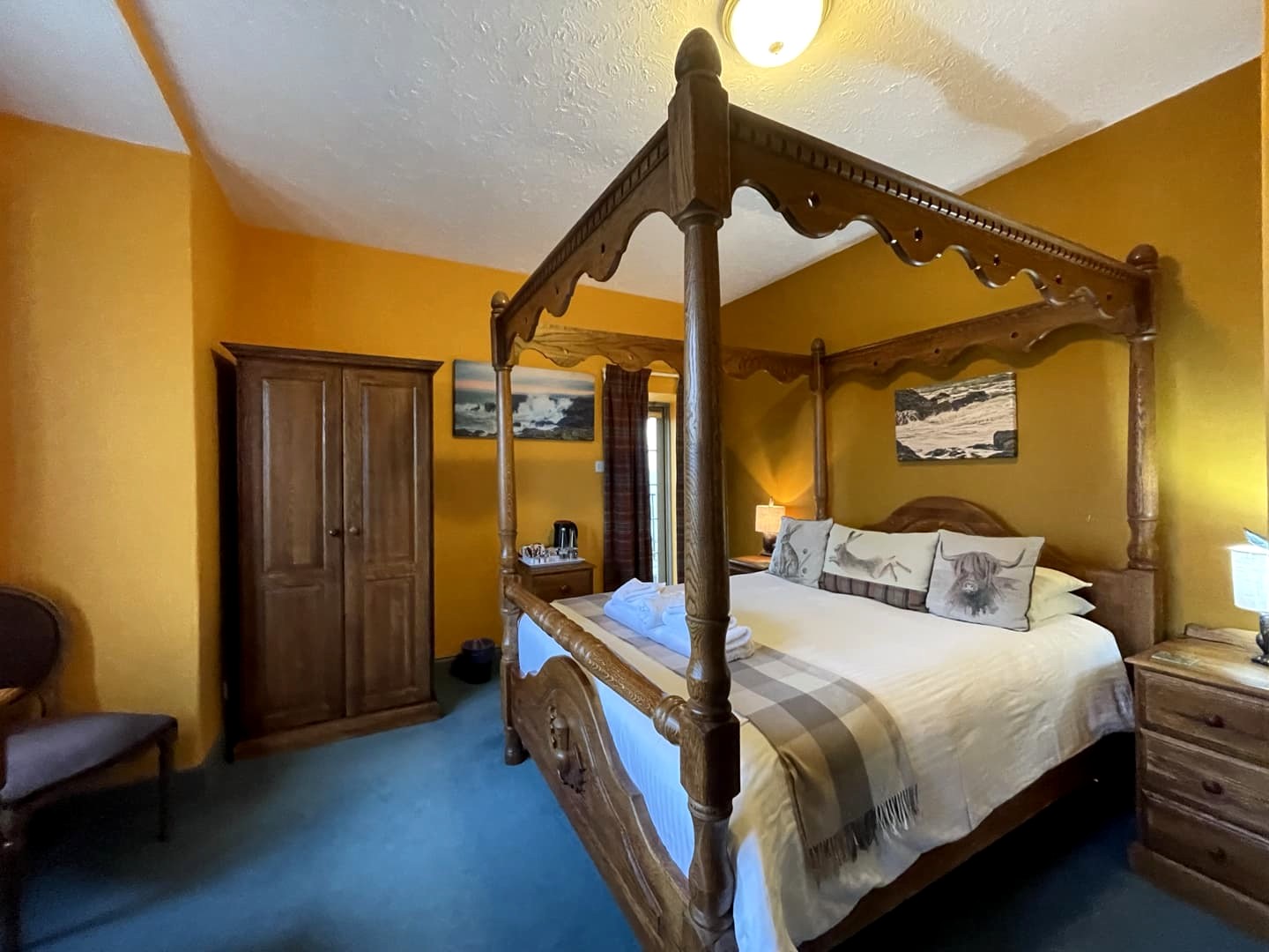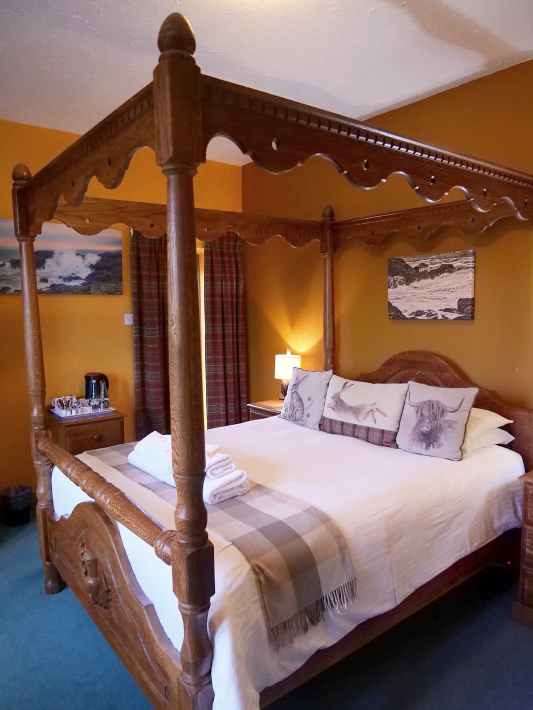 Nous avons logé dans la chambre « Firth of Cromarty », qui est l’une des plus chères, mais j’ai craqué pour le grand lit à baldaquin et surtout sa grande terrasse privée avec vue sur mer !