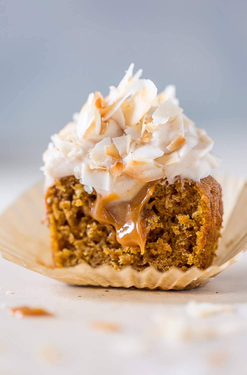 Aren’t these so pretty?! These pumpkin cupcakes are stuffed with creamy dulce de leche and topped with cinnamon cream cheese frosting and toasted coconut!