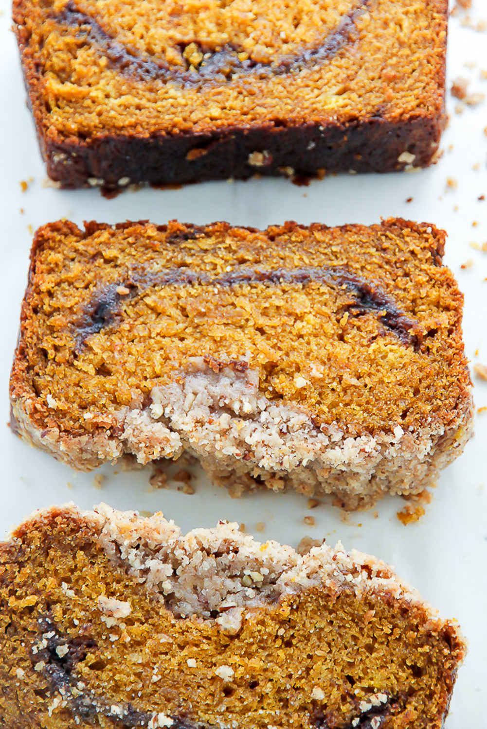 Regular pumpkin bread is good… but cinnamon swirl pumpkin bread is GREAT! Topped with buttery crumbs, this cake is moist, flavorful, and so much fun!