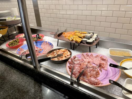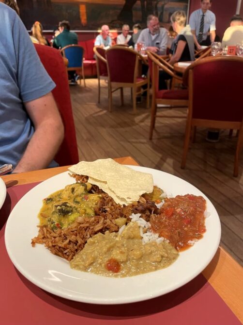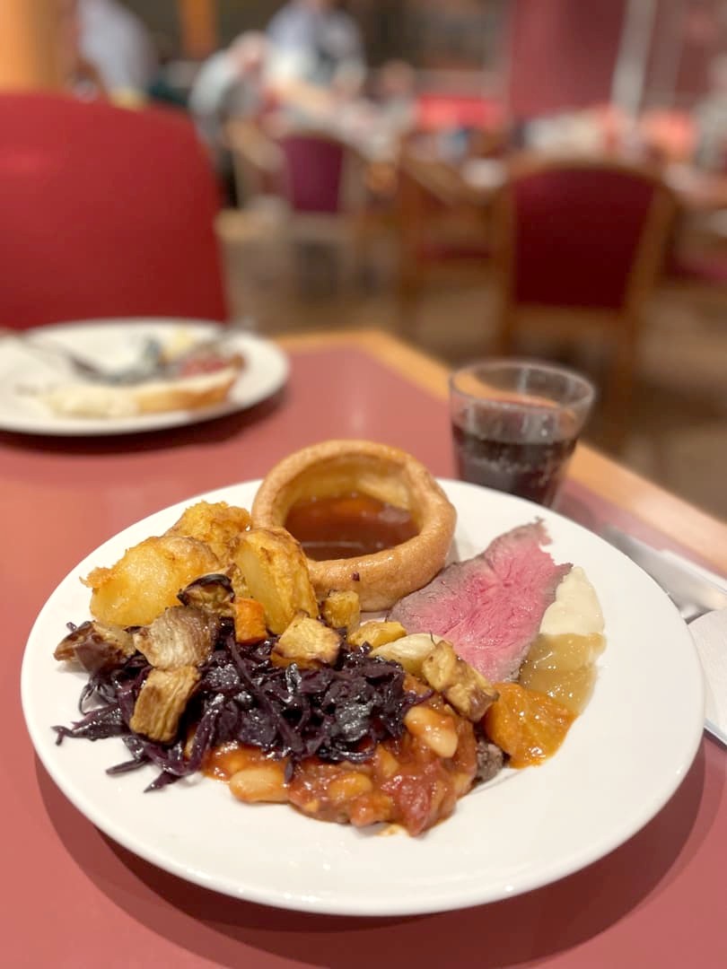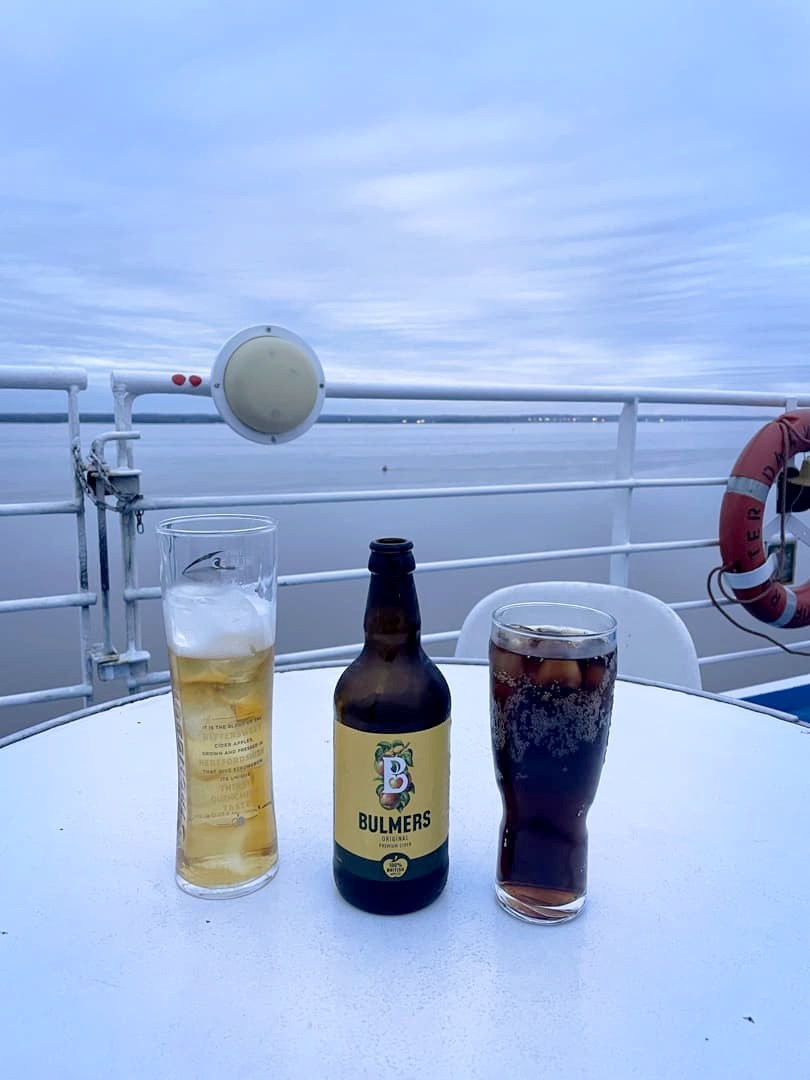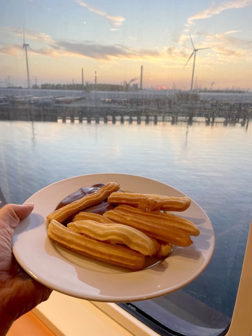 Au niveau des repas, à l’aller, nous avons été manger avant même d’avoir quitté le port (moins de monde de cette manière) dans le restaurant buffet « all you can eat ». Et je dois dire que pour le prix, c’est vraiment pas mal. Tout ce qui est typiquement anglais, comme le « Sunday roast », était vraiment bon. Les plats de cuisine du monde et notamment indiens étaient beaucoup plus fades. J’ai même pu terminer avec quelques churros face au coucher du soleil ! Au retour, nous avions pris avec nous de quoi manger, donc nous avons simplement été boire un verre sur le deck supérieur (il y a même une partie extérieure).