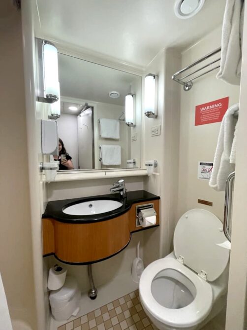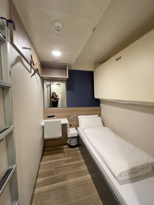 Les cabines sont étroites mais au final plutôt bien agencées. Nous avions des lits superposés, déjà faits à notre arrivée, et assez confortables. La petite salle de douche est bien équipée, avec une vraie toilette et une douche un peu étroite, mais j’ai déjà vu bien pire.
