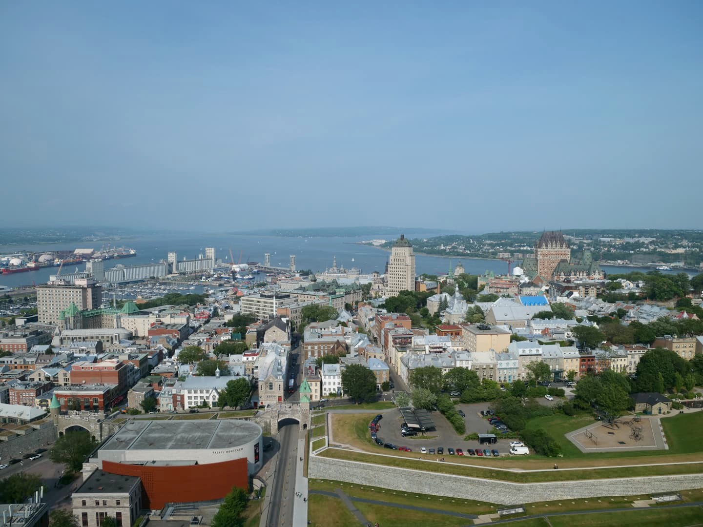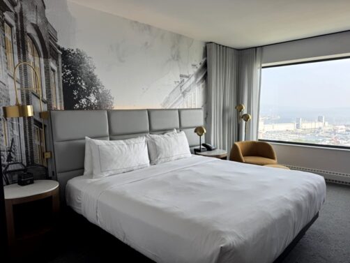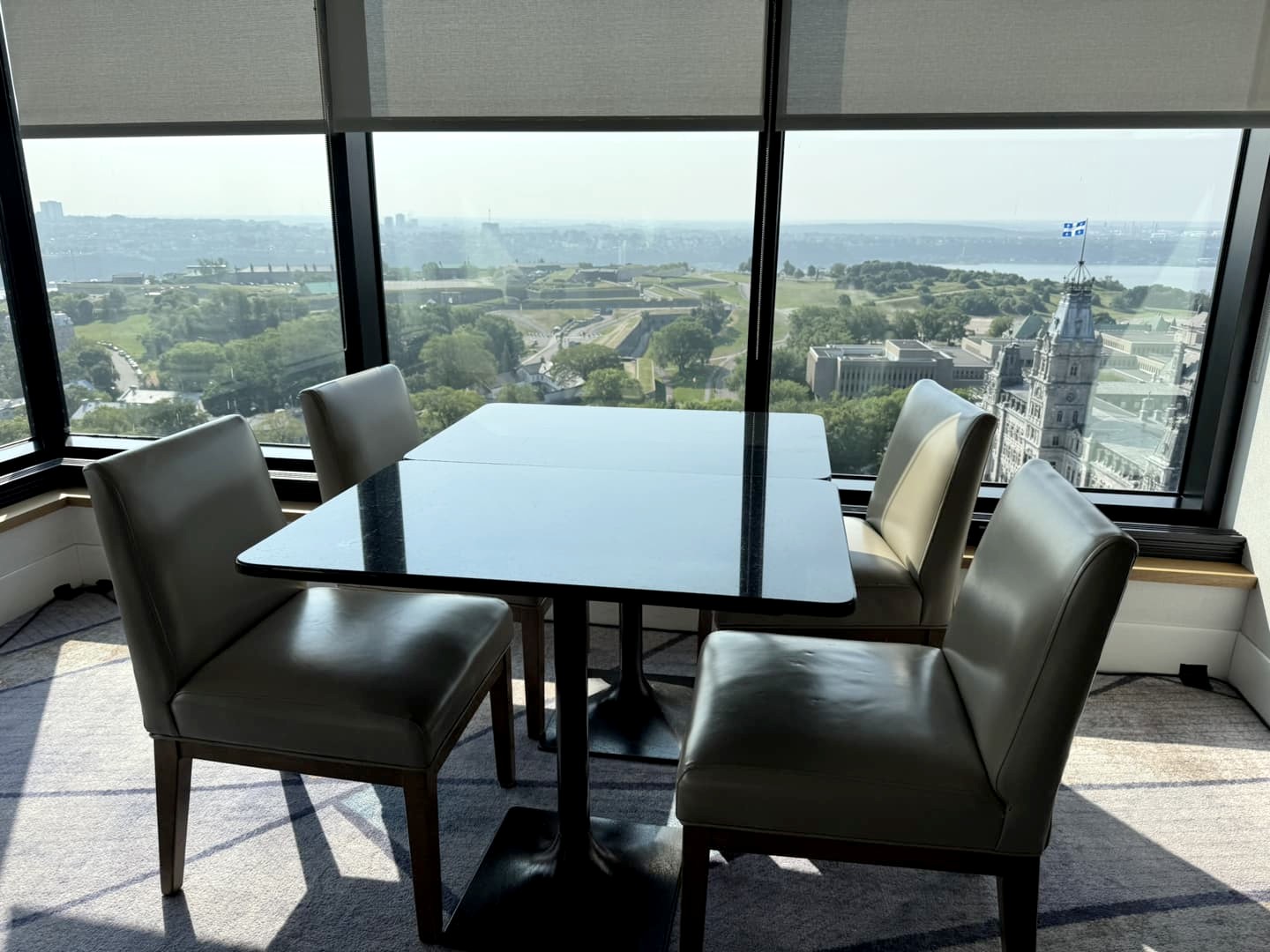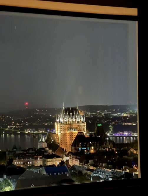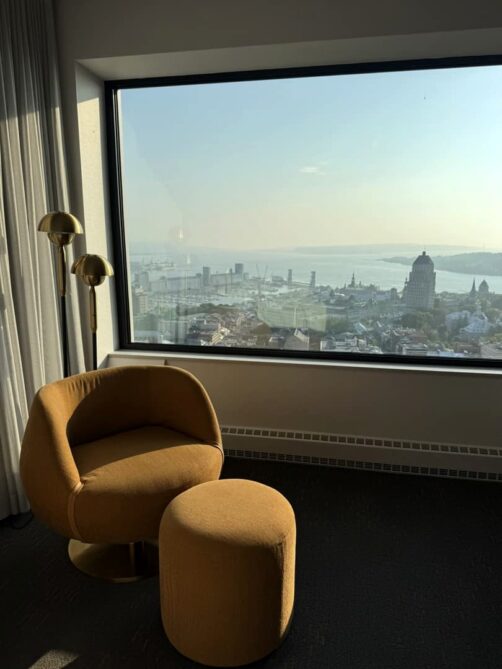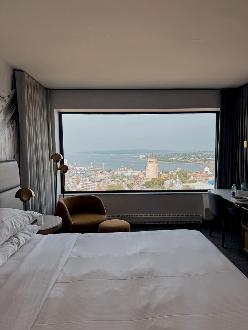 Nous avons eu la chance de dormir durant ce séjour au Hilton Québec, l’hôtel qui possède probablement la plus belle vue de toute la ville ! L’hôtel se trouve à quelques pas des remparts et du Vieux-Québec, et la vue depuis les derniers étages de l’hôtel, occupés par les chambres excécutives, est patticulièrement incroyable ! Du lever au coucher du soleil, nous nous sommes régalés de ce panorama urbain que nous pouvions observer directement depuis notre lit.