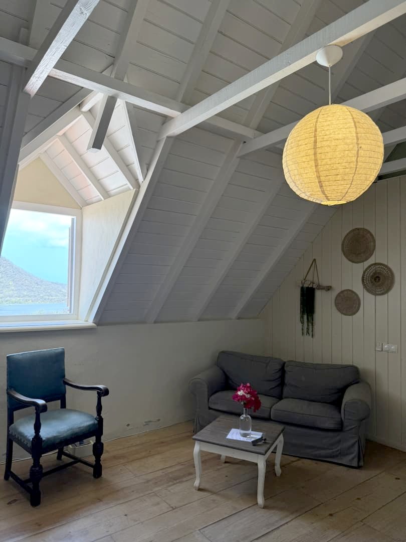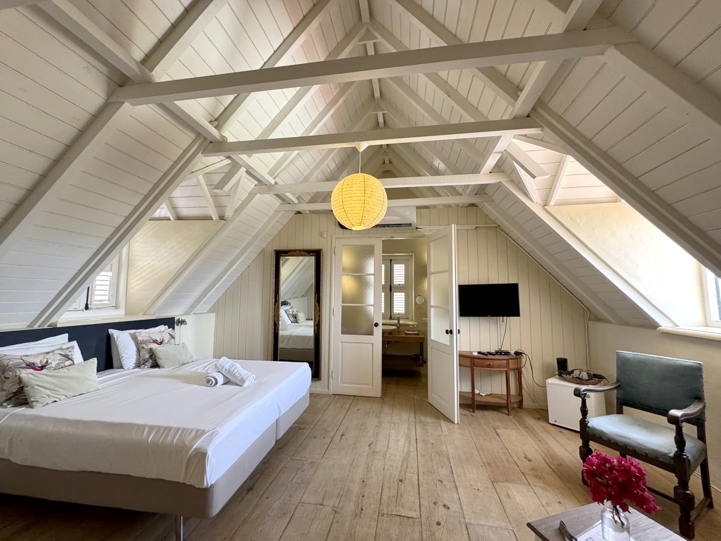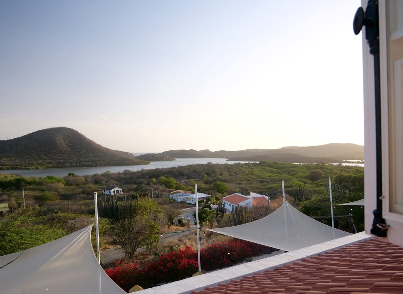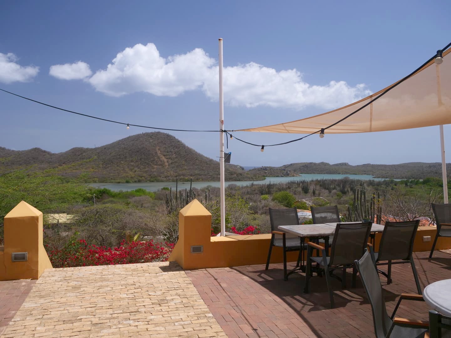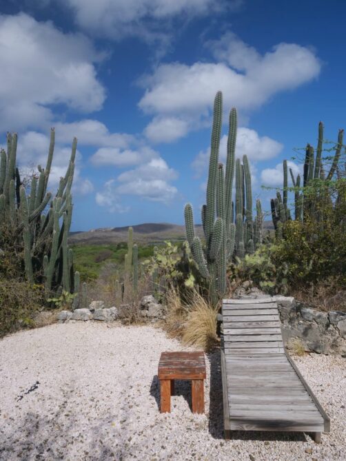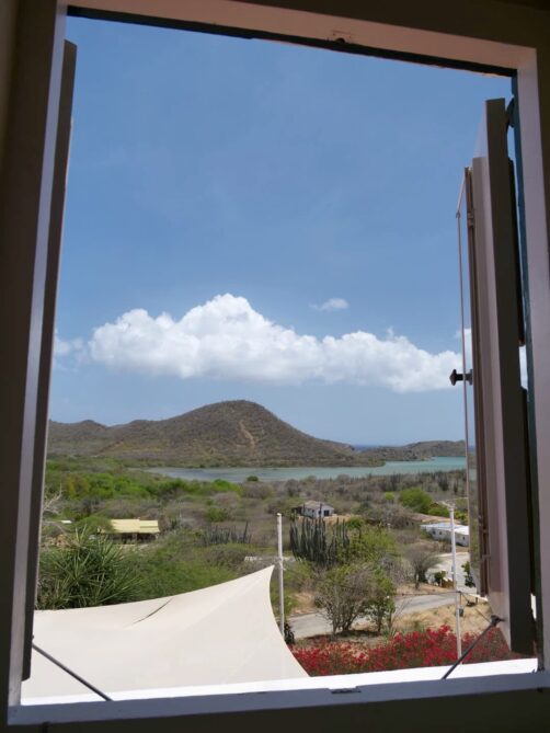 J’ai logé dans l’une des deux suites qui se trouvent à l’étage de la Landhuis, les plus belles chambres du lieu ! La chambre était ultra spacieuse, avec un bel espace salle de bain également. Les (petites) fenêtres s’ouvrent sur les paysages environnants, avec notamment une superbe vue sur la Baie de Santa Martha. Ajoutez à ça une petite piscine extérieure qui est parfaite pour se rafraîchir un peu, et une superbe vue sur le coucher du soleil, derrière les cactus. C’est un vrai petit paradis !