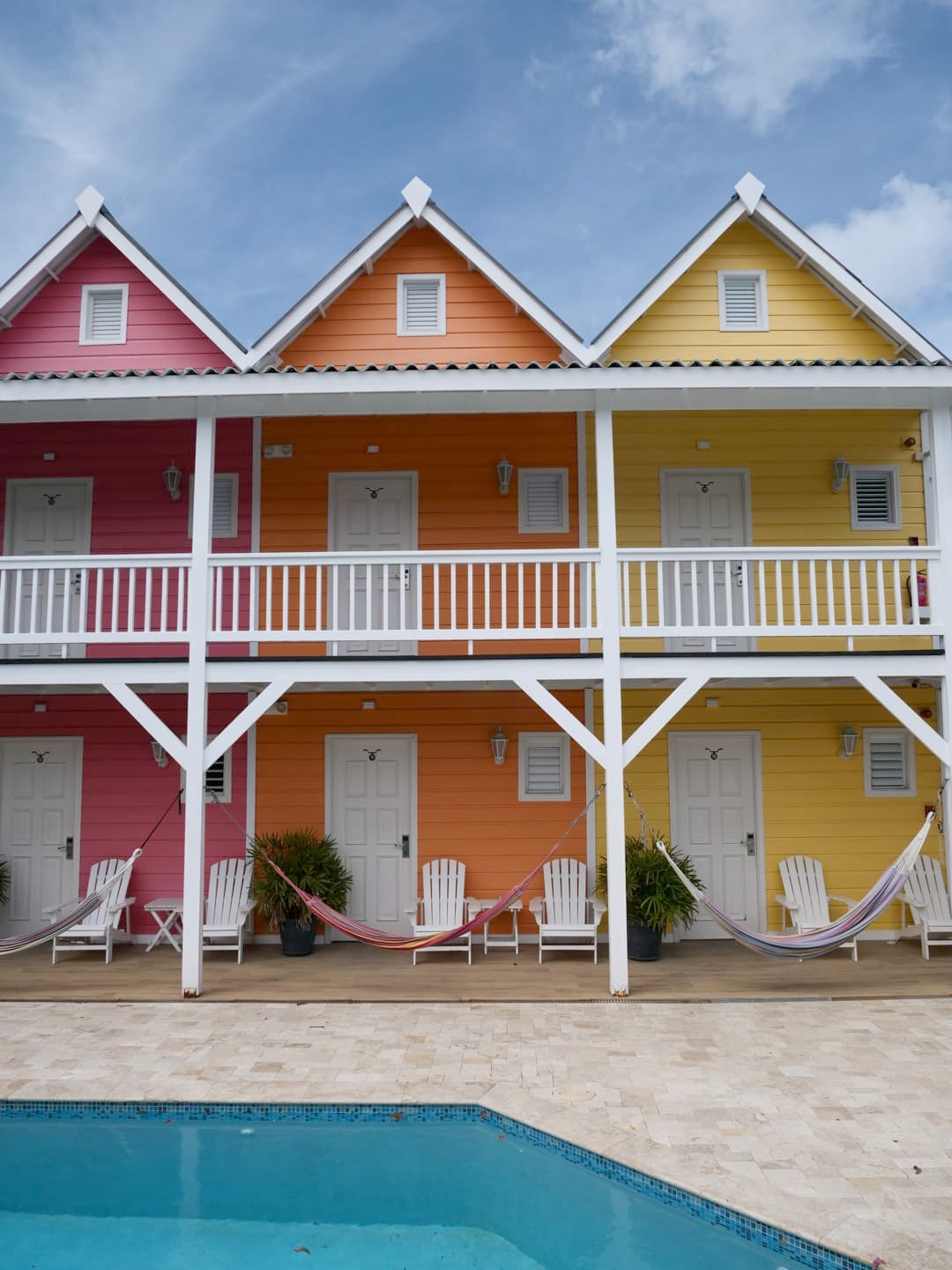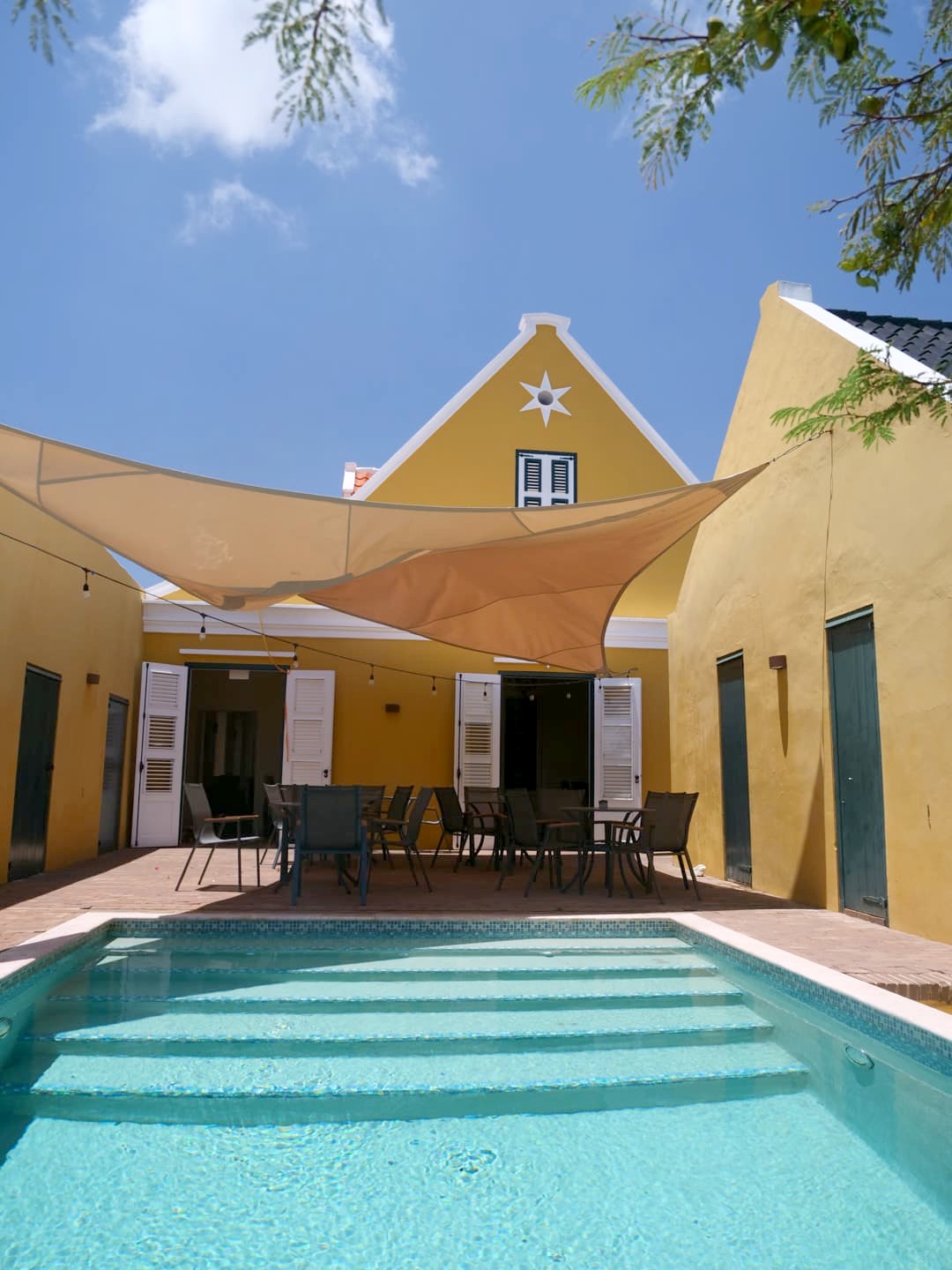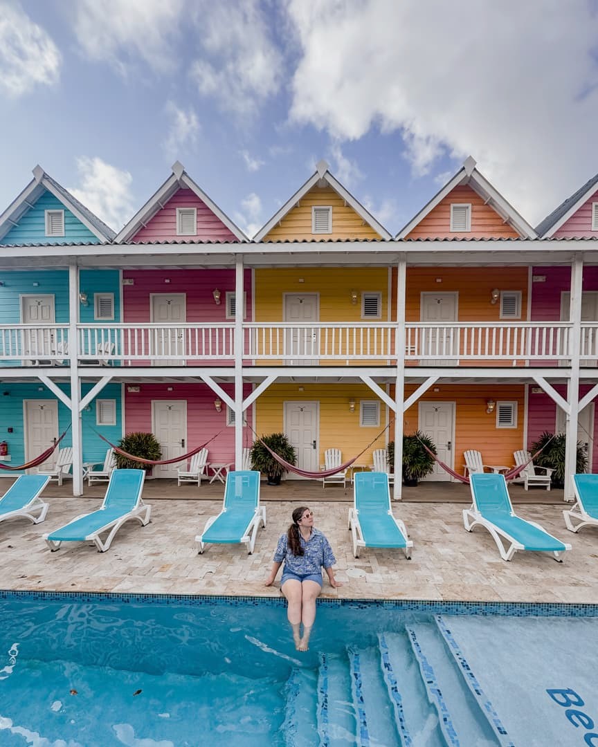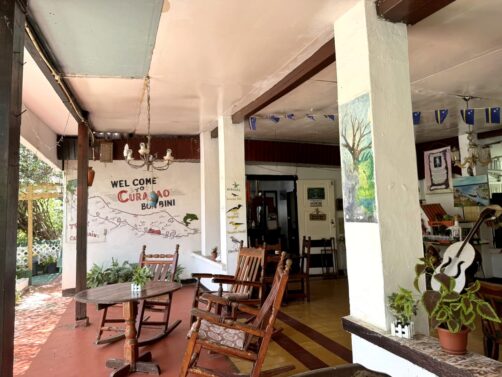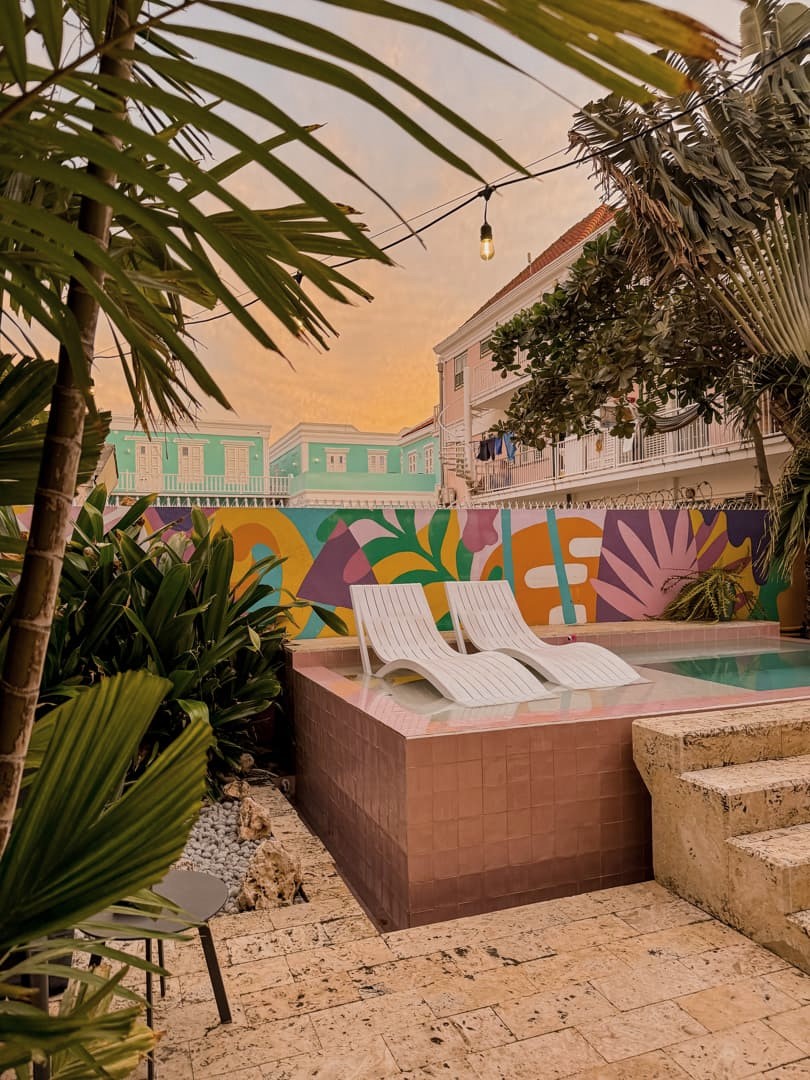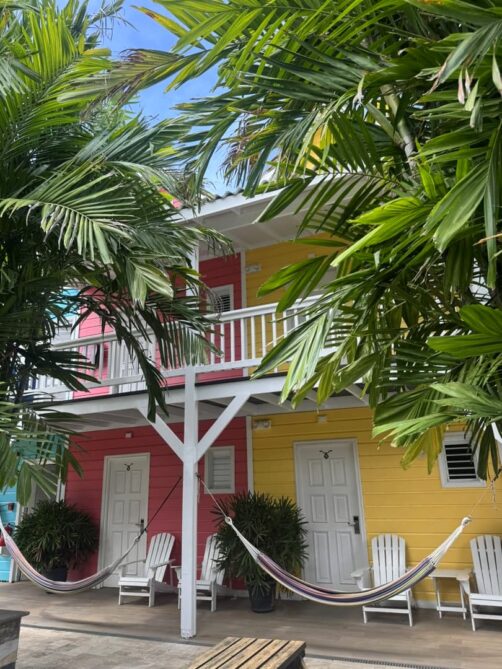 Il s’agissait à nouveau d’un hôtel très coloré, qui reproduit l’architecture typique de Curaçao, avec une belle piscine centrale. La particularité de cet hôtel, c’est que vous pouvez choisir entre des chambres privées classiques (avec hamac sur la terrasse, vraiment sympa !) ou la partie auberge de jeunesse avec des dortoirs. Les chambres privées sont assez abordables, mais si vous avez un très petit budget, cela peut être une très bonne option (une amie à moi y a été en auberge et a été ravie aussi). Quel que soit le type de chambre que vous choisissez, vous aurez accès à tous les espaces communs, et notamment une énorme cuisine commune, ce qui peut être utile si vous voulez économiser un peu sur la nourriture.