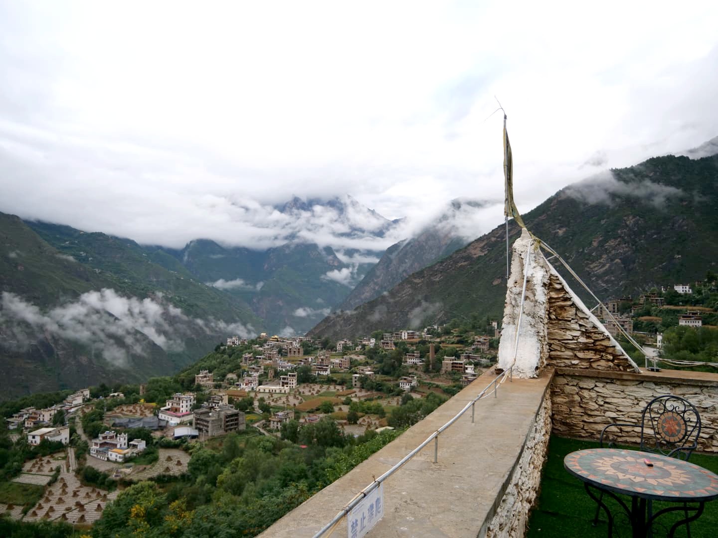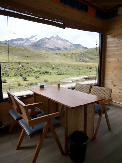 Hébergement : 1 nuit au Zeba Village au 山屿民宿 (Shanyu Guesthouse) – un « motel » à la chinoise très récent, avec vue sur les montagnes et le glacier ! Nous avions à nouveau une alimentation en oxygène dans la chambre, qui m’a été très utile après la randonnée…
