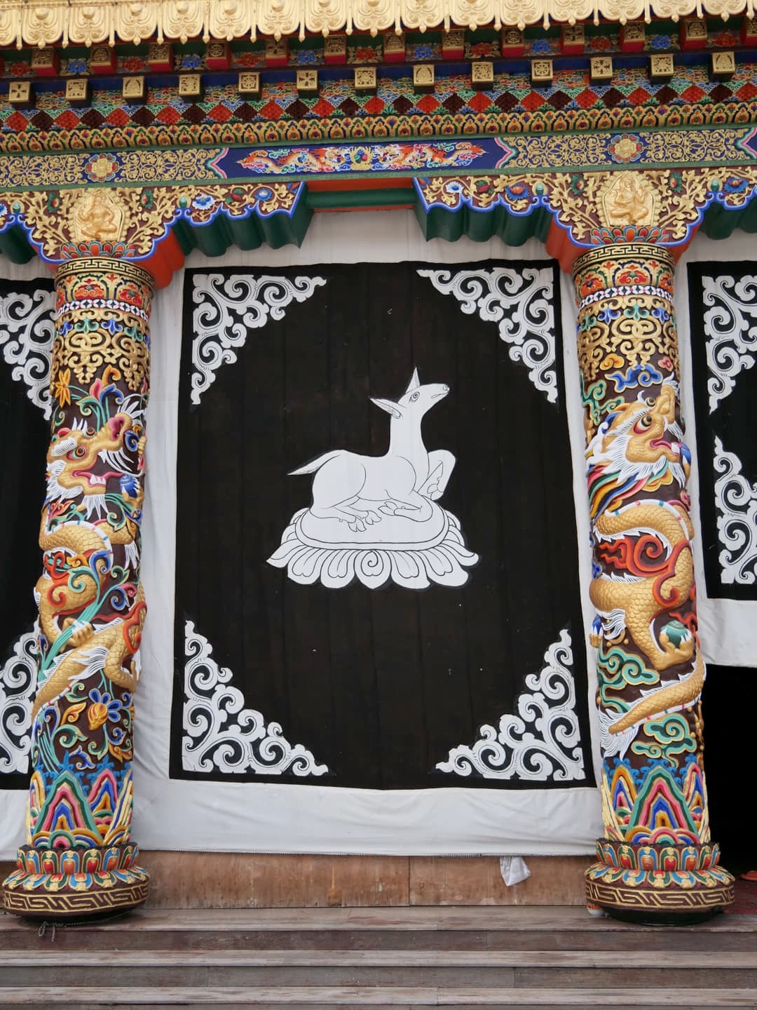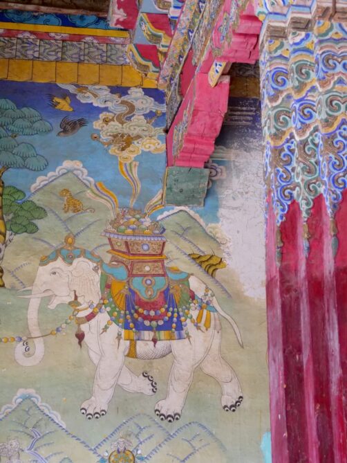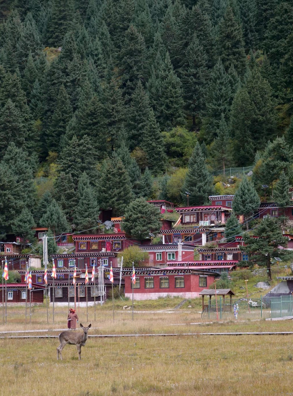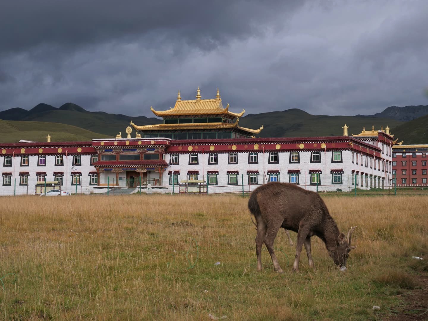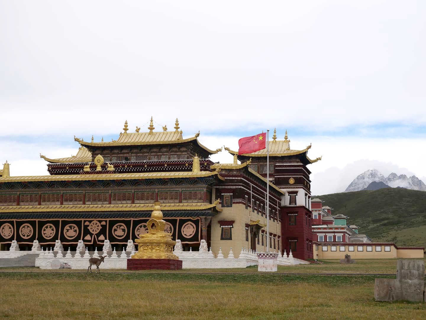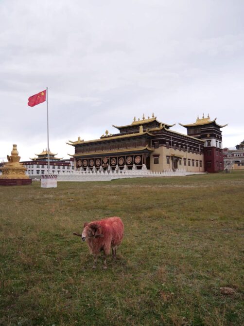 Autre monastère à découvrir absolument à Tagong, le Monastère de Muya fut l’un de mes préférés de ce voyage. Niché dans un cadre incroyable, au milieu de plaines sauvages entourée par des sommets montagneux enneigés, c’est vraiment l’un des plus beaux temples bouddhistes tibétains du Sichuan. Le monastère d’origine aurait été établi au 13ème siècle, ce qui en fait l’un des plus vieux de la région. Il appartient à l’école Gelugpa du bouddhisme tibétain et son complexe est aussi un centre important pour l’apprentissage du bouddhisme. On y trouve aussi un institut de médecine tibétaine. L’un de ses grandes particularités est qu’il abrite des animaux sauvages qui ont été sauvés par les moines. En se baladant dans le complexe du monastère, on se retrouve donc entourés de cerfs, singes, chevaux, chèvres, moutons, et plus encore, qui se baladent quasiment tous en liberté.