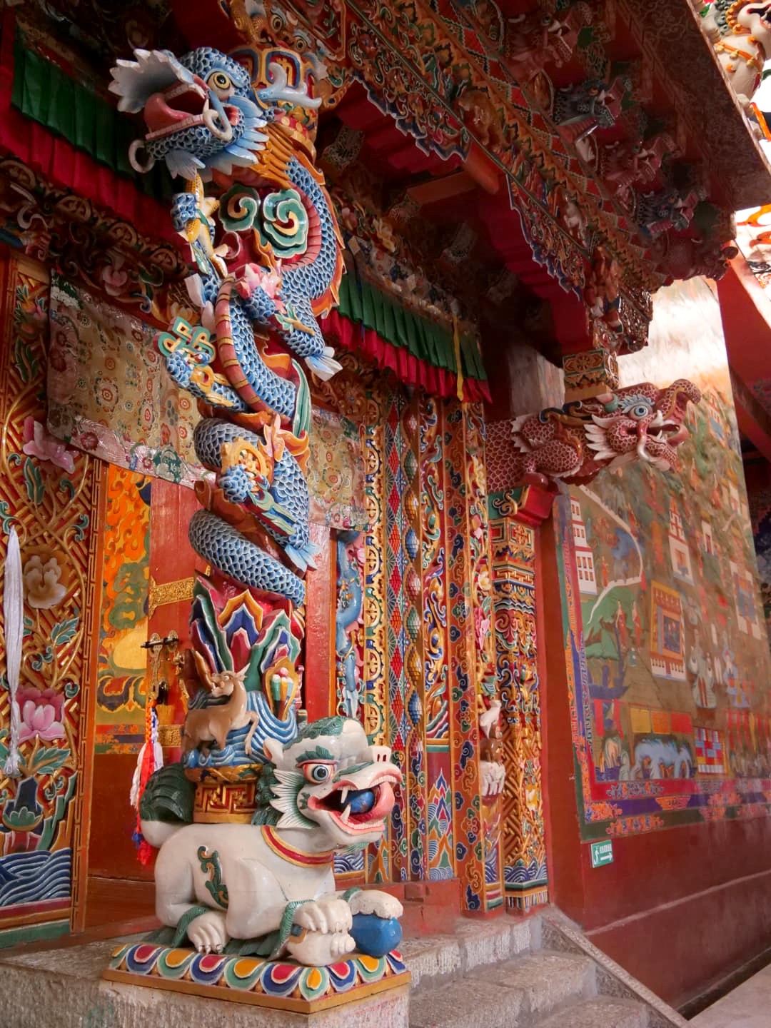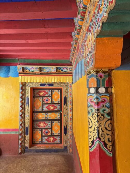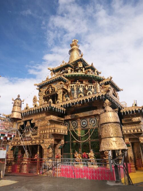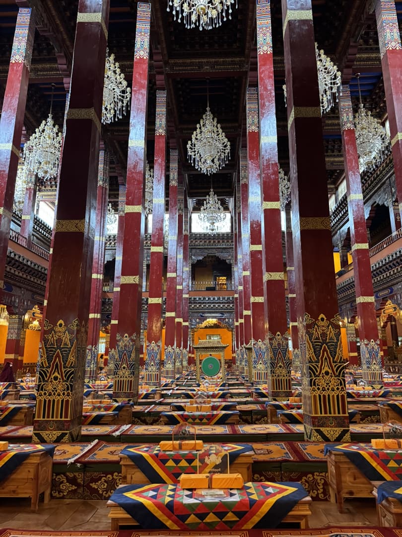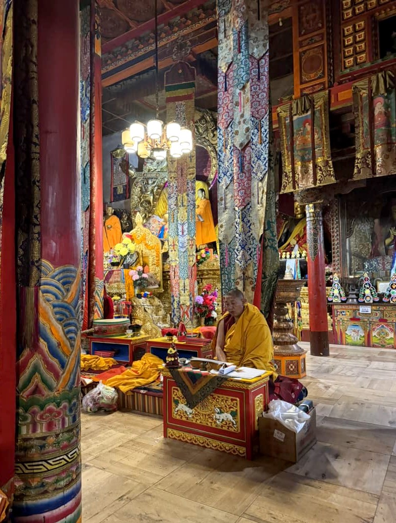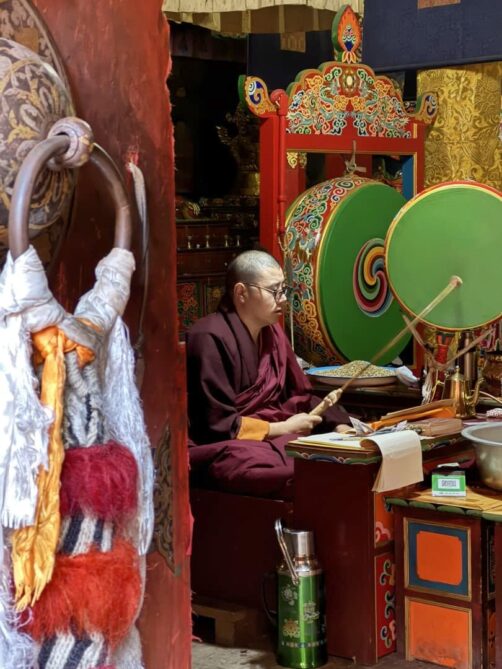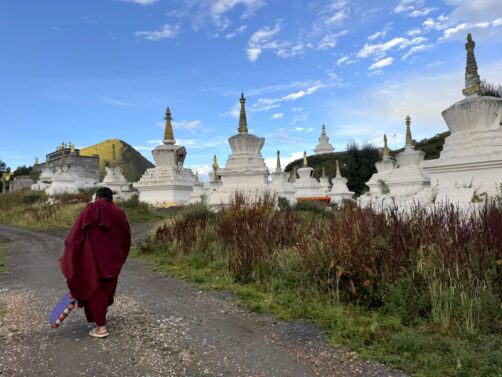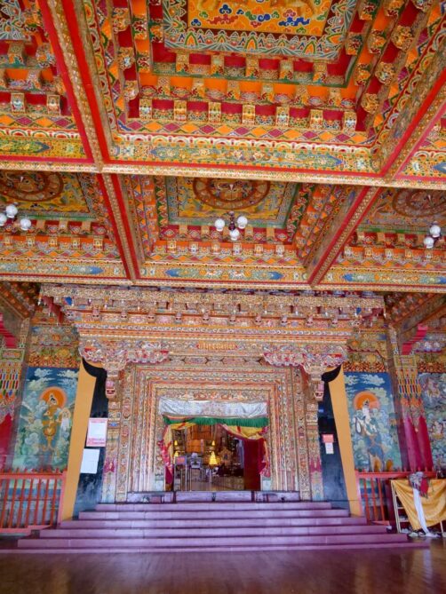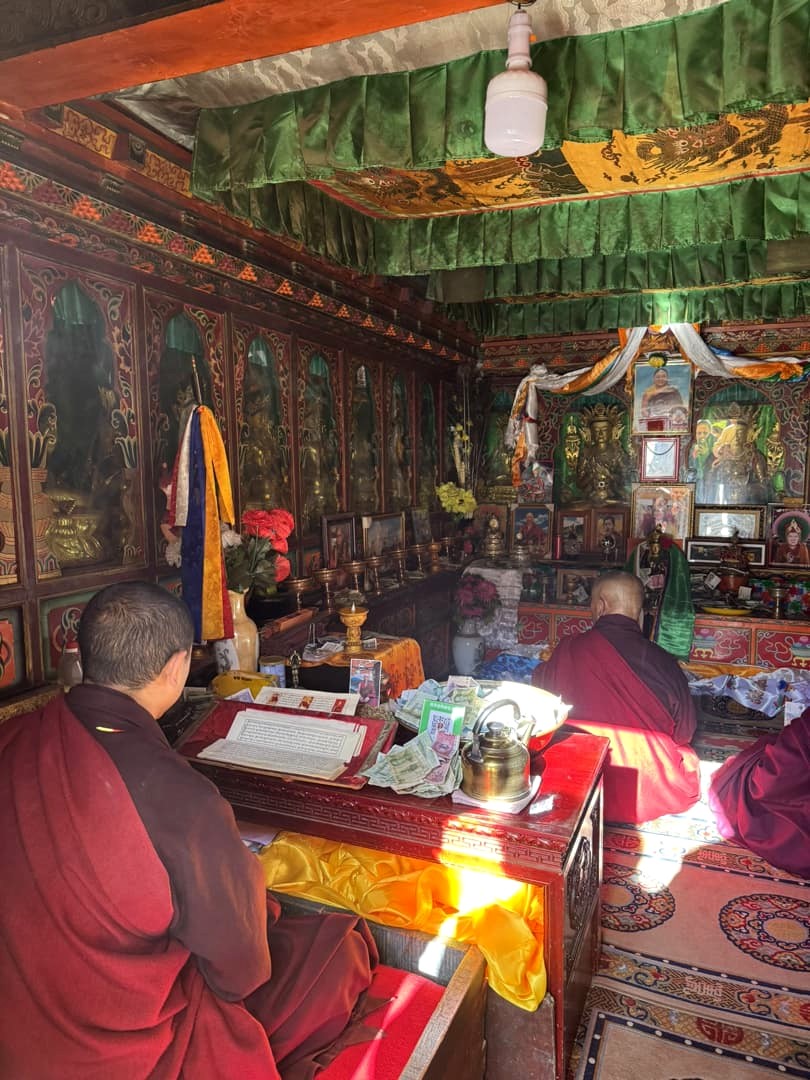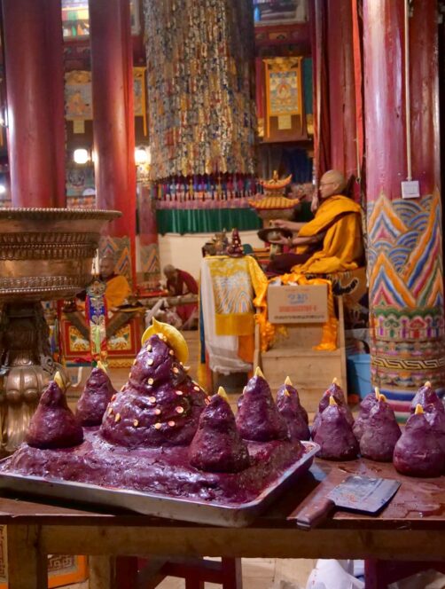 Nous avons visité le temple un jour de festival et avons eu l’occasion d’assister aux prières des moines (avec l’autorisation de pouvoir les photographier, ce qui est assez rare !), puis de participer à la distribution des denrées bénies par les moins, dont le fameux gâteau au beurre de yak, avant de terminer par un moment totalement hors du temps, une intiation à la méditation par l’un de leurs moines, au coucher du soleil, dans leur jardin de stupas. Un moment totalement incroyable !