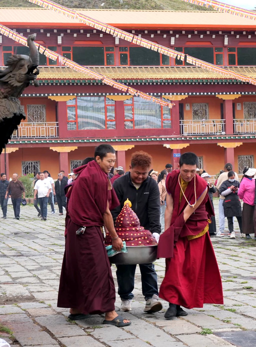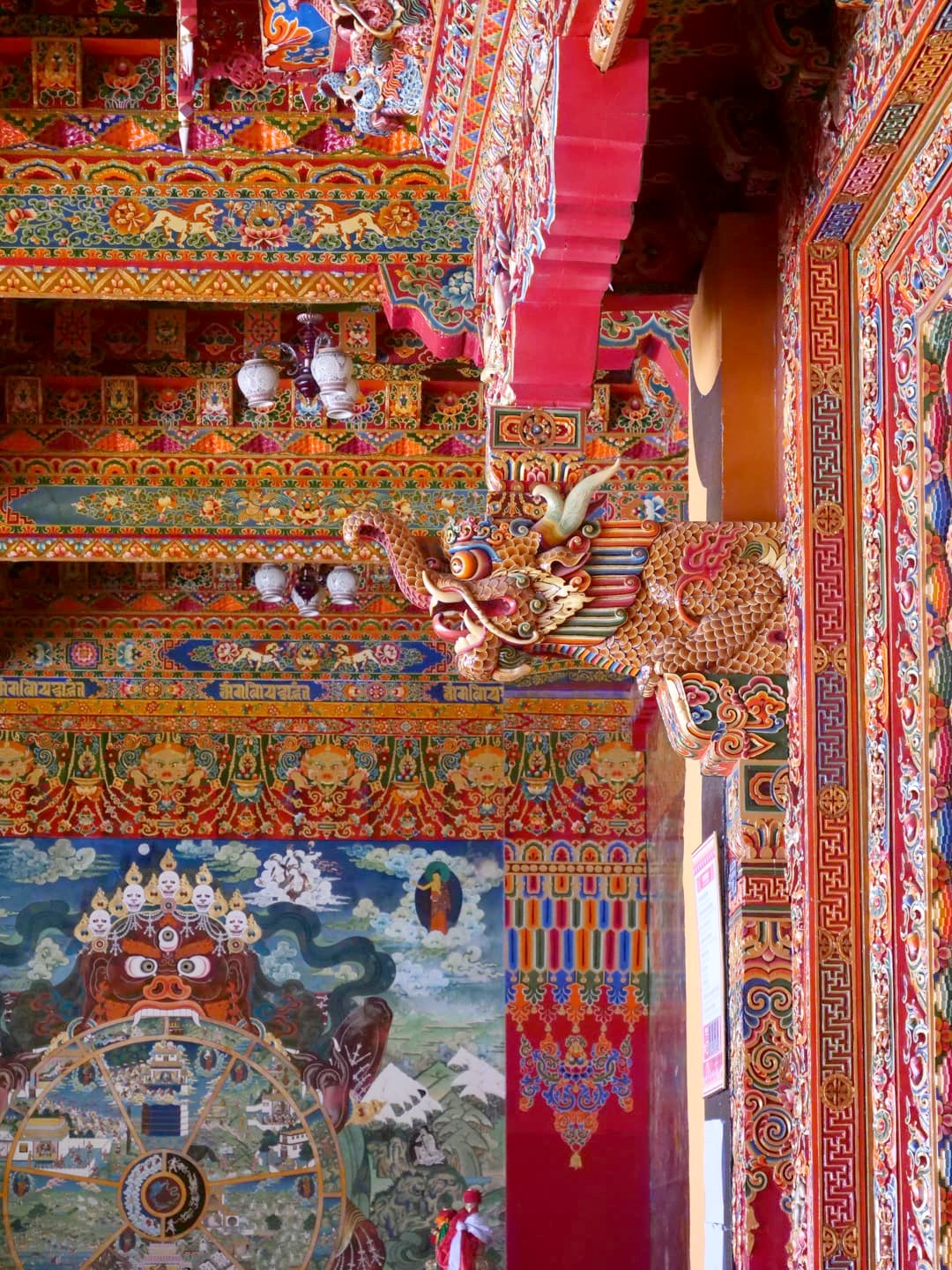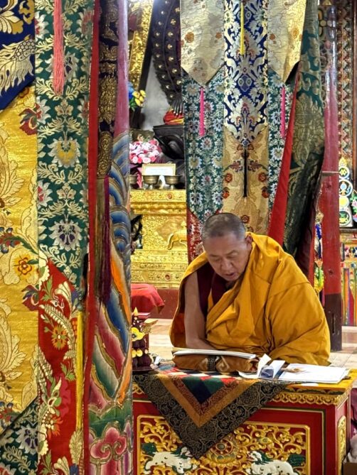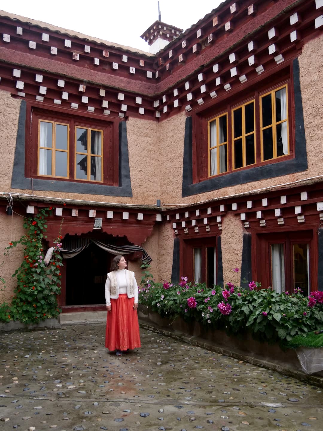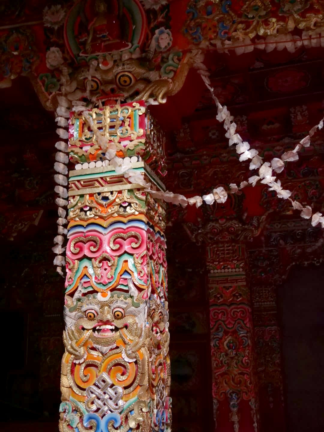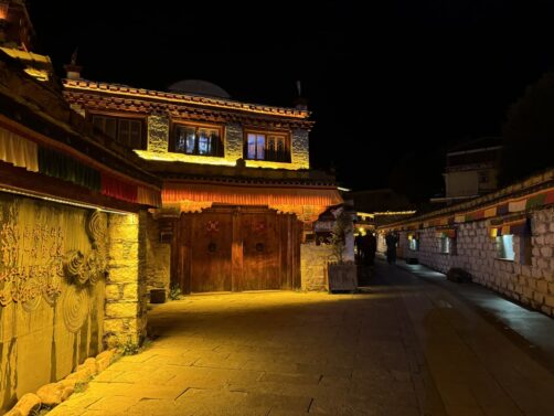 Nous avons visité le temple un jour de festival et avons eu l’occasion d’assister aux prières des moines (avec l’autorisation de pouvoir les photographier, ce qui est assez rare !), puis de participer à la distribution des denrées bénies par les moins, dont le fameux gâteau au beurre de yak, avant de terminer par un moment totalement hors du temps, une intiation à la méditation par l’un de leurs moines, au coucher du soleil, dans leur jardin de stupas. Un moment totalement incroyable !