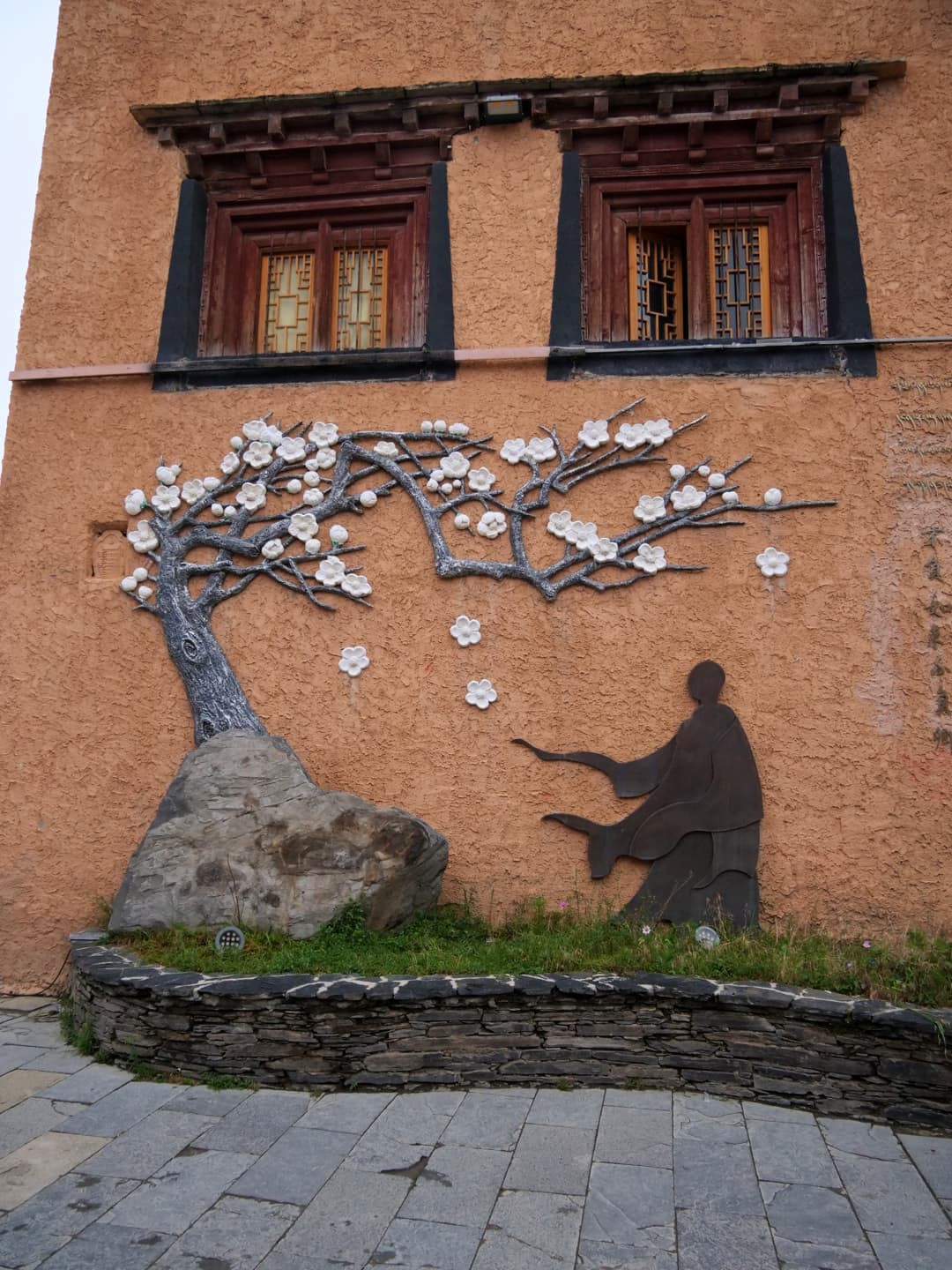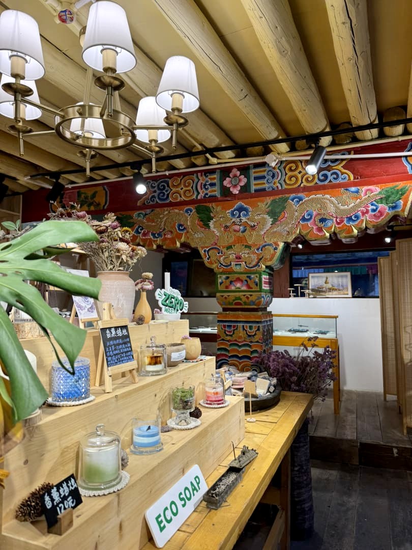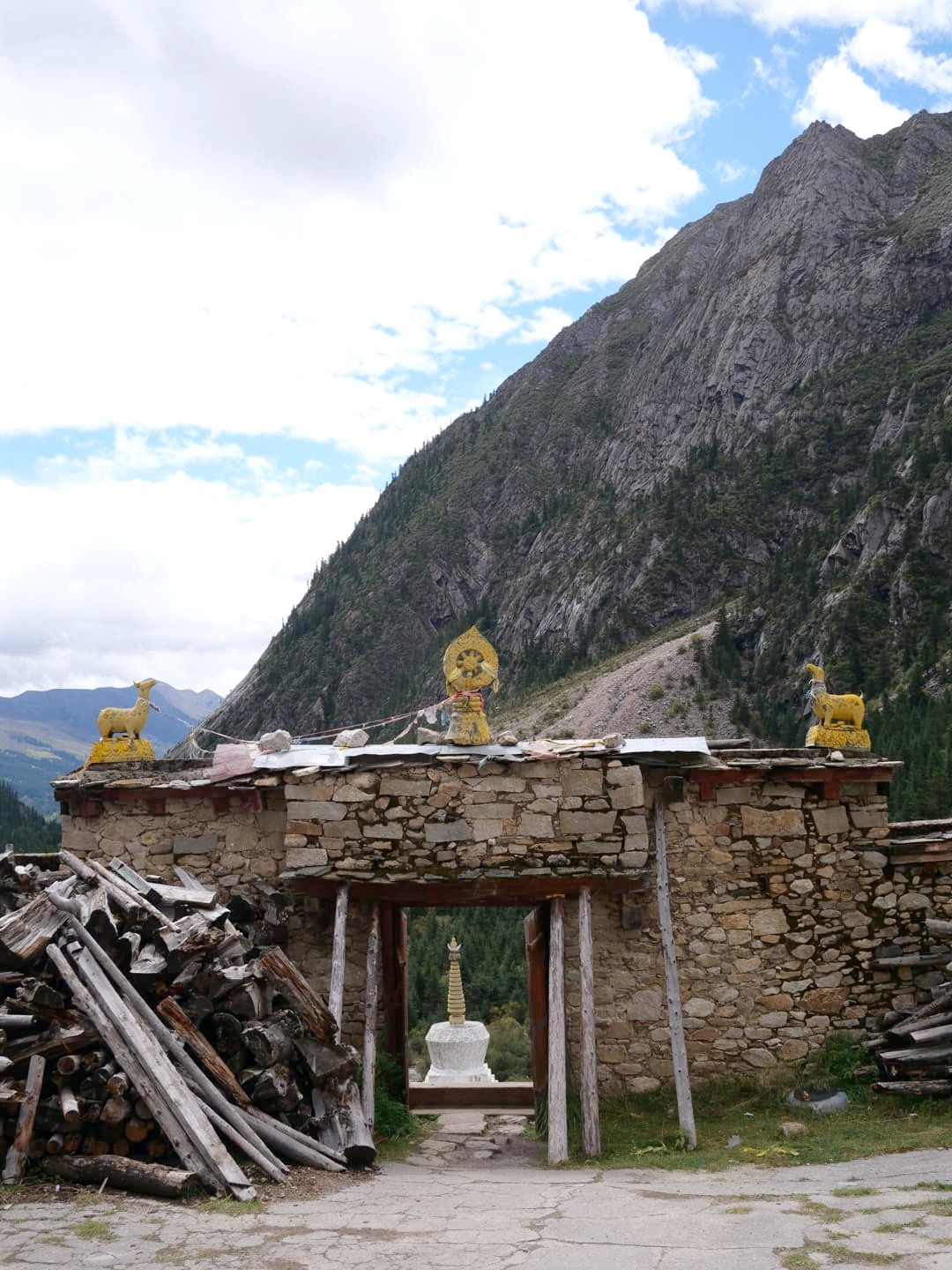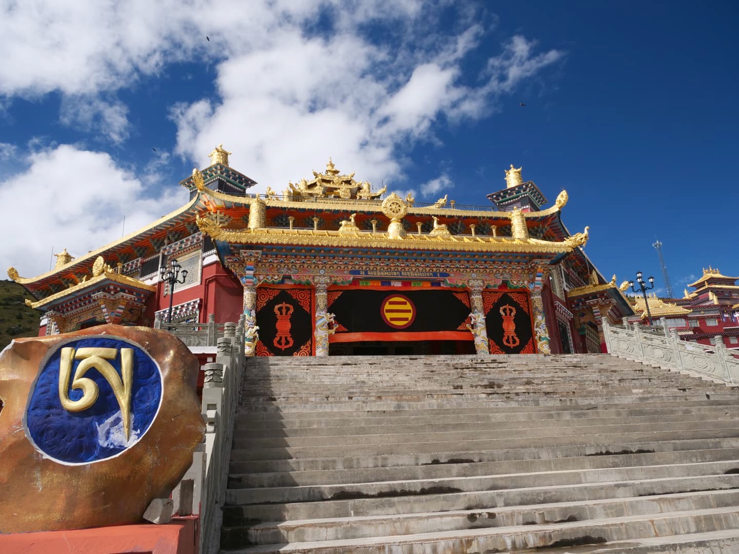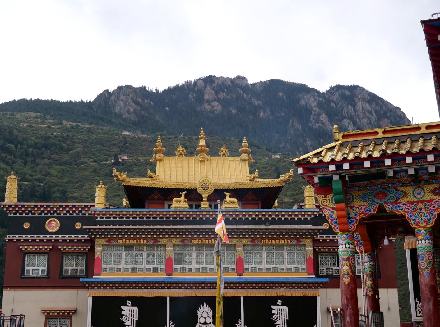 Depuis 2011, un nouveau monastère plus facile d’accès a été construit aux pieds du Mont Genyen, dans un cadre époustouflant. Un des moines nous a guidé pour nous faire découvrir, contre une petite donation, leurs plus grands trésors, appelés les « Trois Trésors sacrés du Mont Genyen » : un coquillage géant tournant vers la gauche (très rare, apparemment), une ramure de biche (tout aussi rare), et le casque légendaire du Roi Gesar (un roi-guerrier tibétain ayant une place importante dans le folklore tibétain). Nous avons aussi pu voir le « Coeur de Genyen », une pierre polie naturellement qui ressemble étrangement à un coeur humain, et qui est vénérée comme « coeur spirituel » de la montagne sacrée.