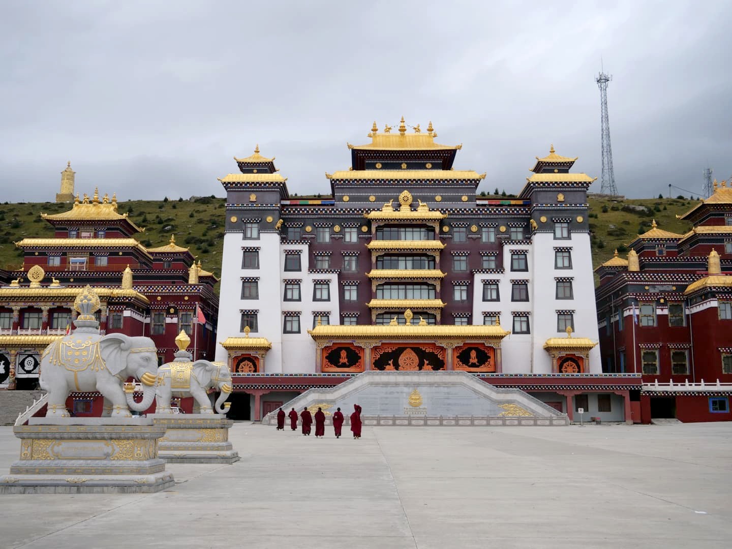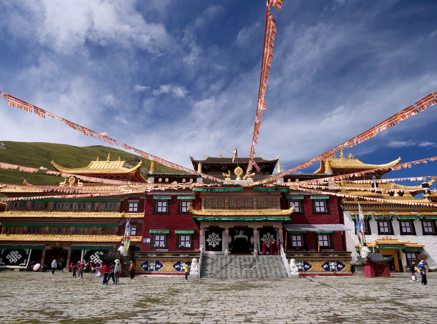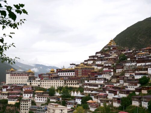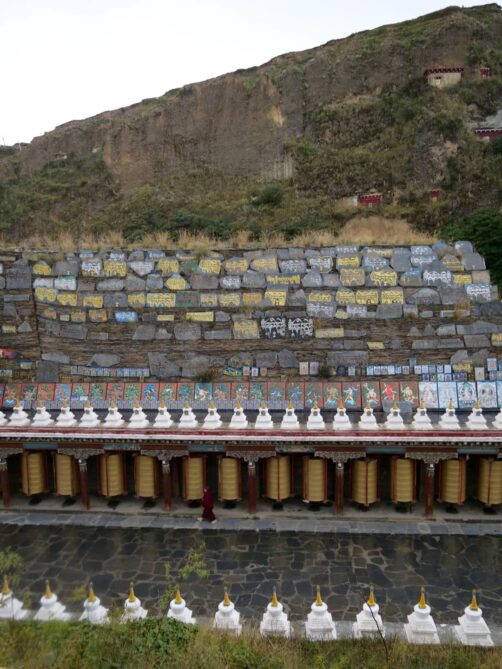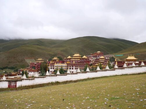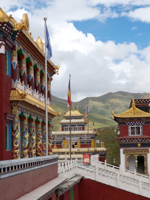 Nous continuons notre tours des monastères tibétains au Monastère de Zhuqing, qui est l’un des plus importants monastères de l’école Nyingma du bouddhisme tibétain. Le complexe du monastère, énorme, s’étend aux pieds du Mont Que’er, à 4000 mètres d’altitude. Un cadre paisible et serein : on comprend directement le choix de ce cadre.