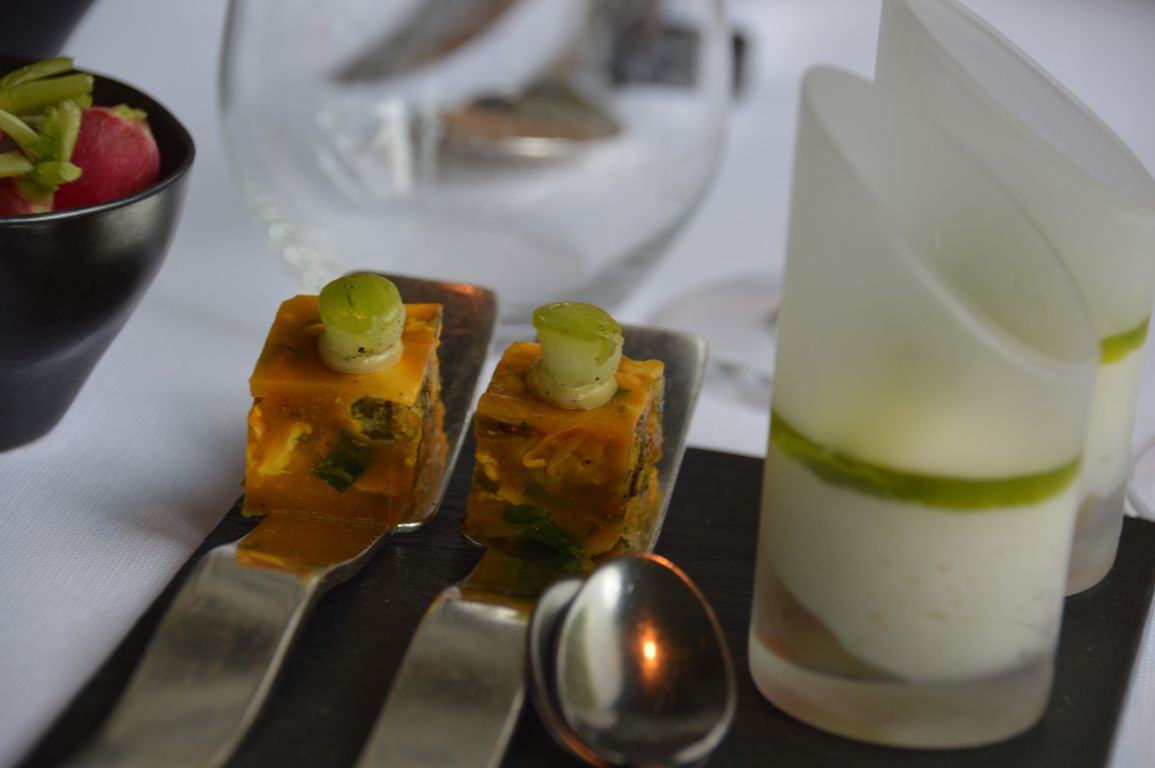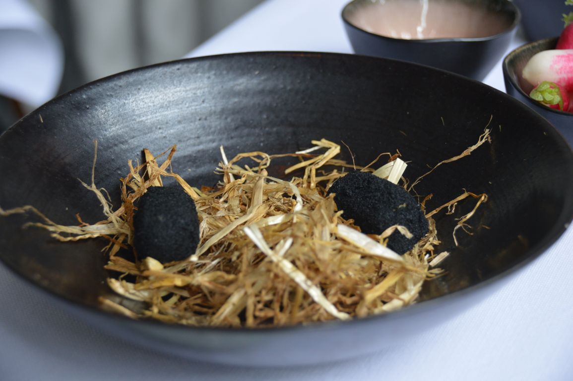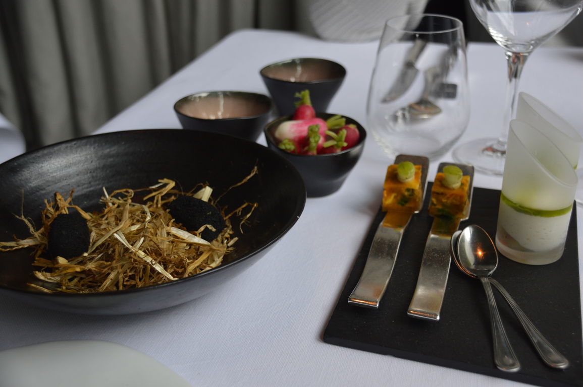 Nous commençons avec une jolie série de mises en bouches qui viennent se rajouter à nos petits radis : charbon de maïs parfumé à la truffe, pressé de moules de Bouchot, et verrine burrata – pastèque – concombre. Bien évidemment, le plus intriguant est le charbon de maïs… pourtant, c’est un vrai régal, avec cette petite pointe de truffe parfaitement dosée.