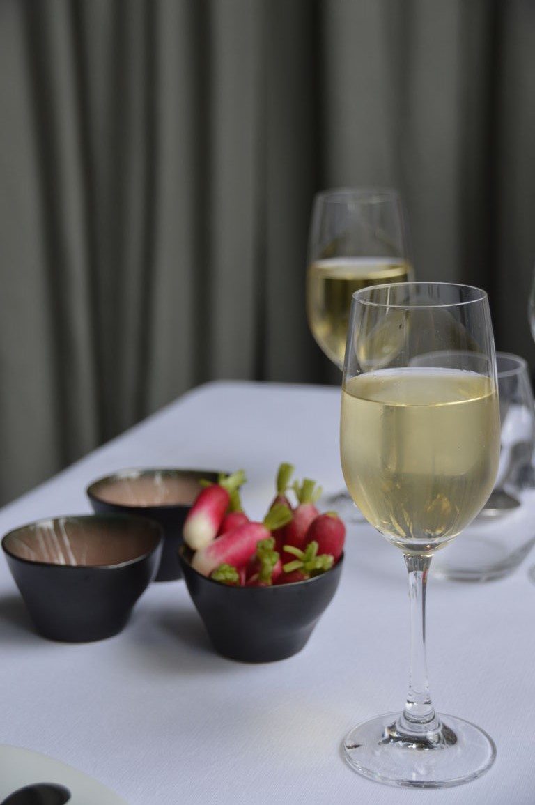 Installés à une jolie table bien au calme près de la fenêtre, un apéritif déjà devant nous (notez les radis en apéro, plutôt original dans un restaurant de ce genre !), nous découvrons le menu du jour.