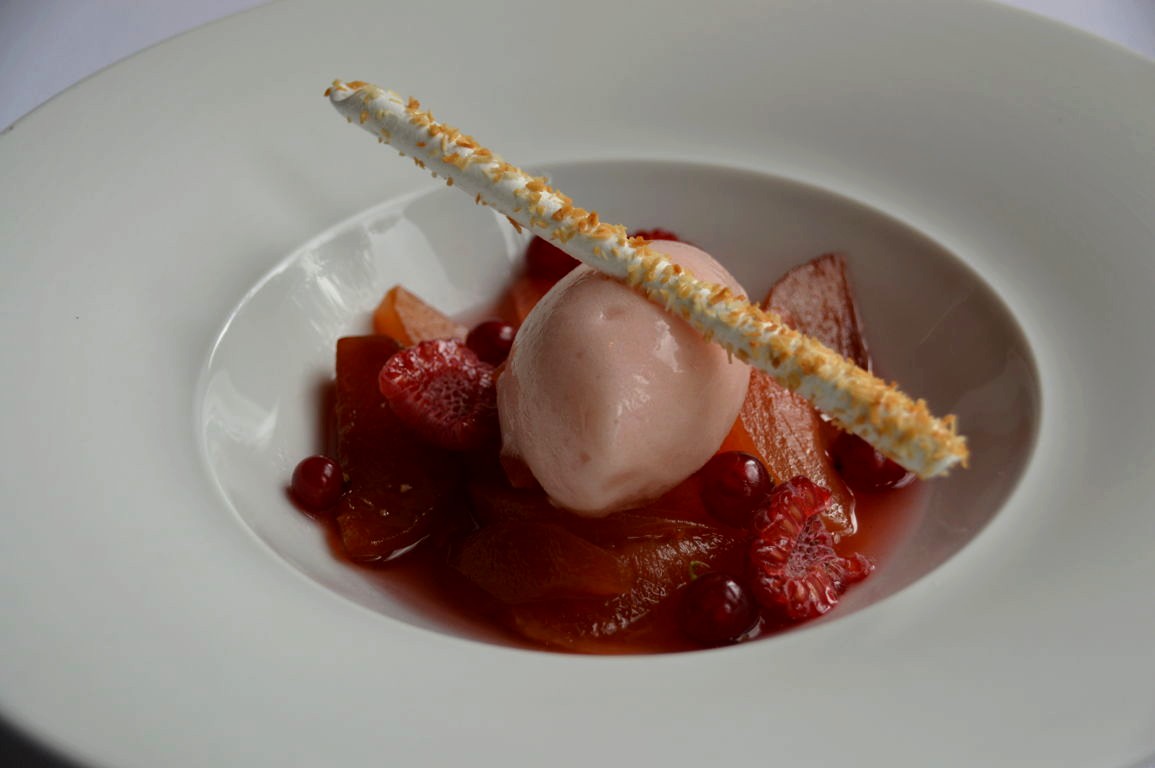 Enfin, nous voici déjà au dessert, une nage de prune et sorbet à la pêche pour finir avec une touche de fraîcheur bien plaisante.