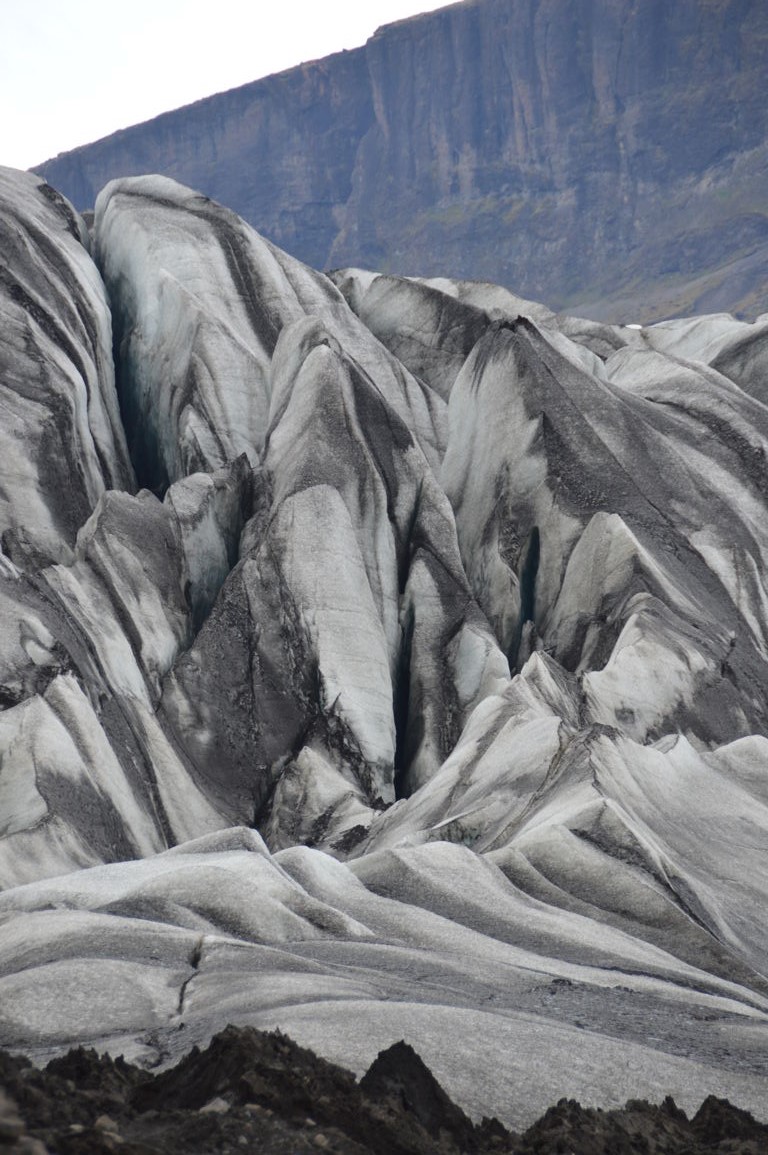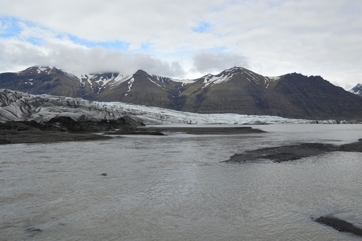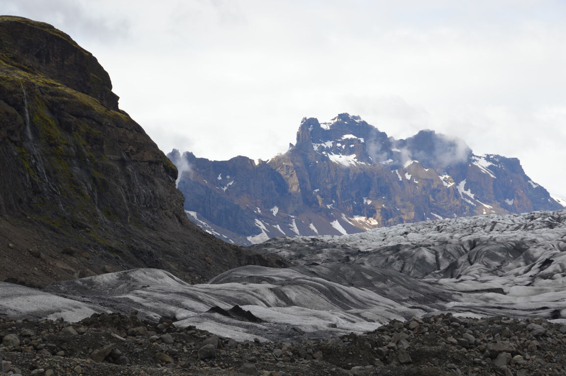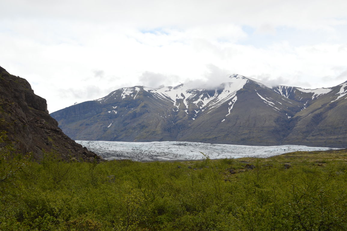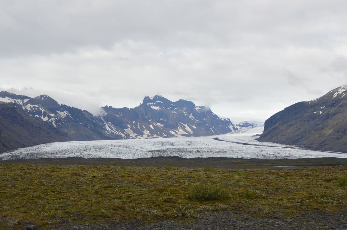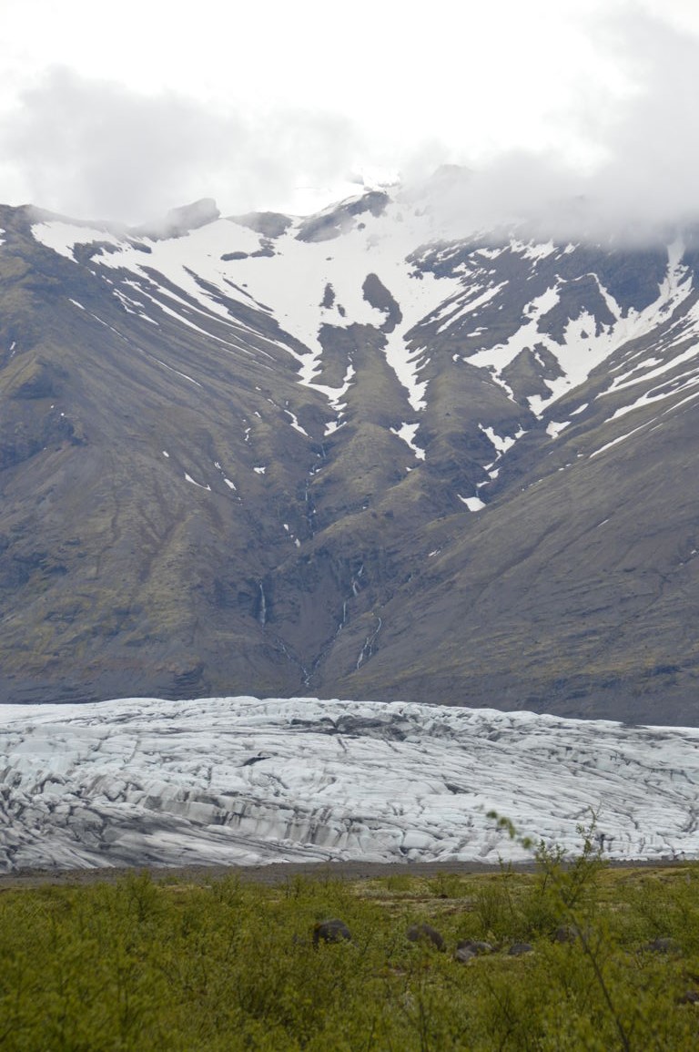 Pour être plus précise Vatnajökull est une immense calotte glacière qui se « divise » en une trentaine de glaciers secondaires (« outlet glaciers » en anglais), comme le « petit » bout que l’on peut voir sur l’image ci-dessous (la calotte glaciaire est elle bien plus haut, au dessus des nuages).