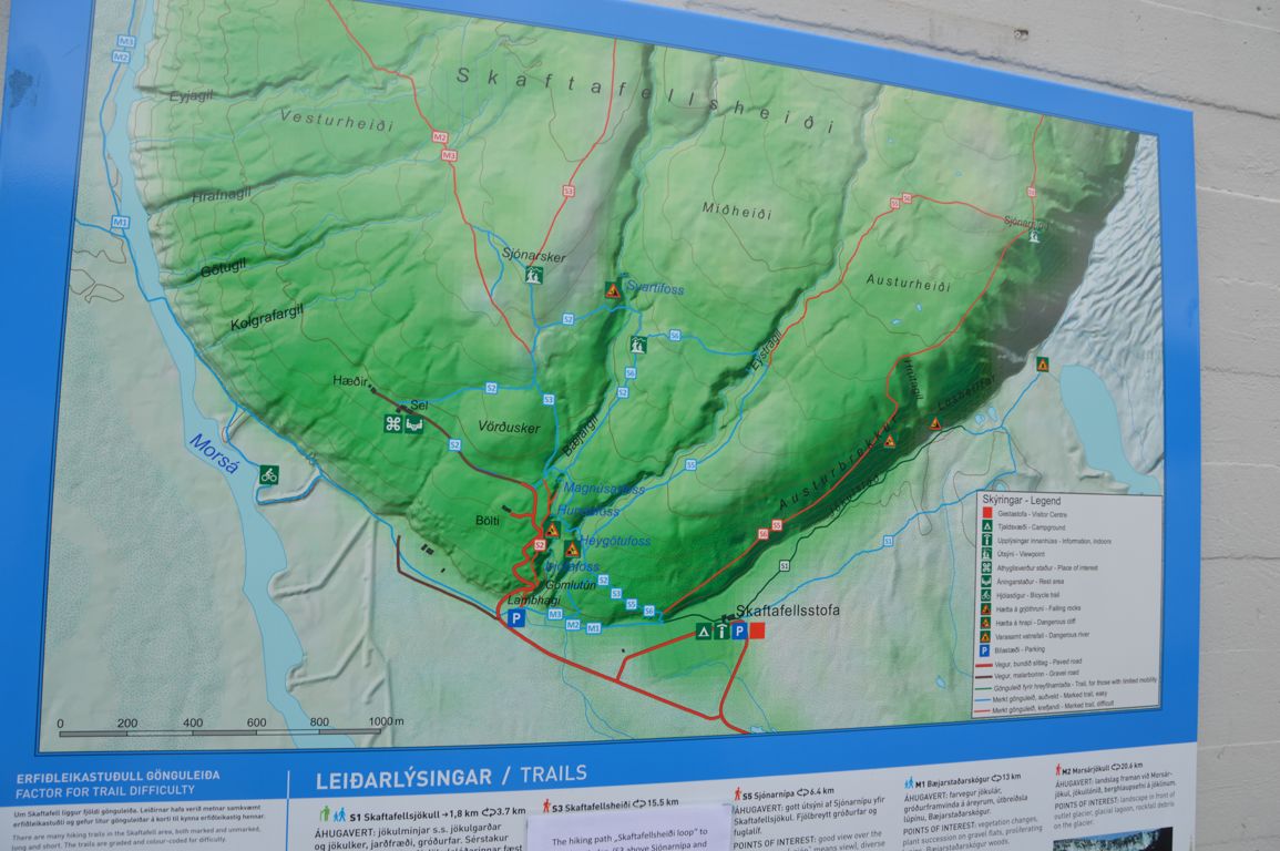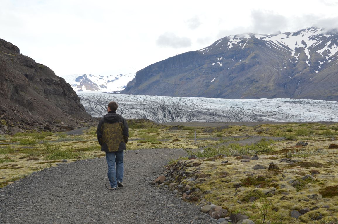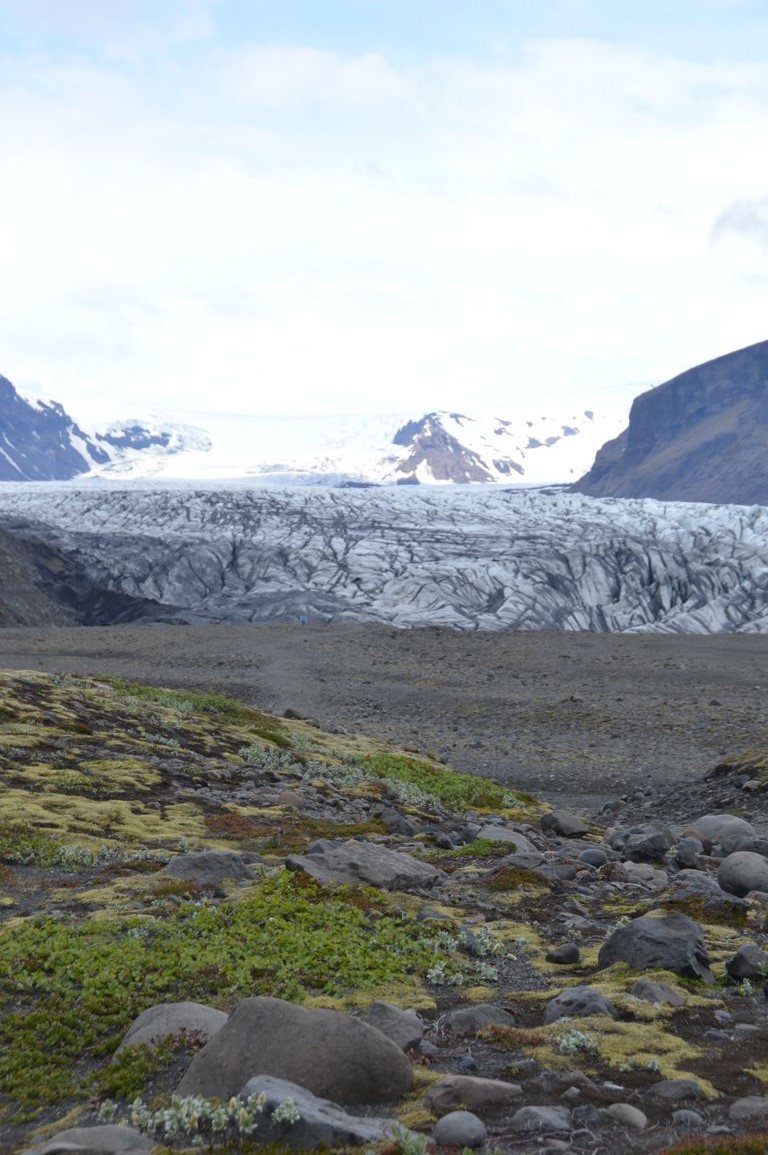 La balade la plus facile (et celle que nous avons faite, faute de temps pour nous aventurer plus loin) est celle qui part du centre touristique jusqu’au glacier de Skaftafellsjökull (à vos souhaits!), comptez une bonne heure aller-retour.