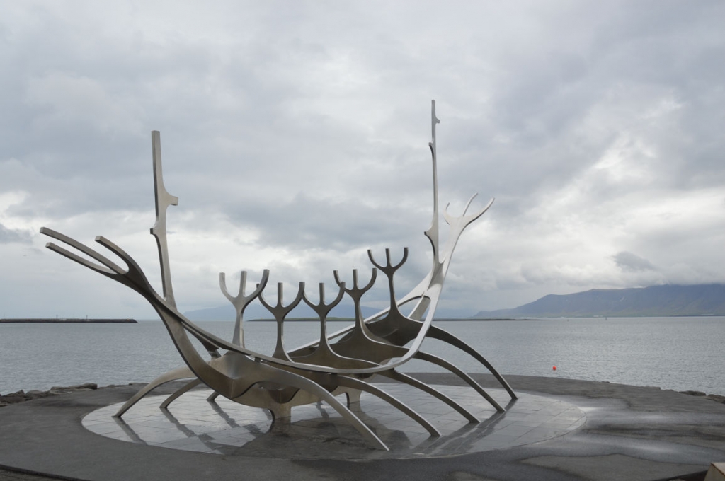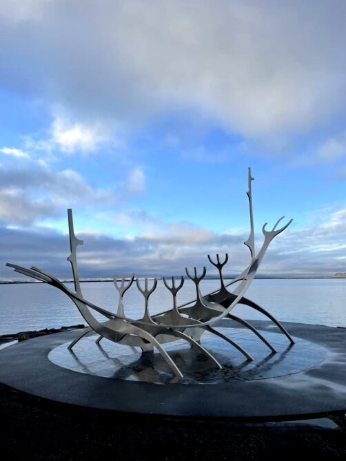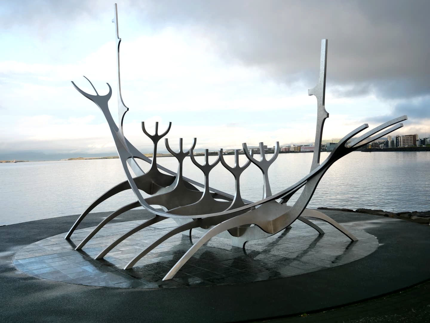 Nous continuons de longer la promenade au bord de l’eau, jusqu’à la sculpture la plus connue de Reykjavik, le Sun Voyager, représentant la silhouette d’un bateau Viking.