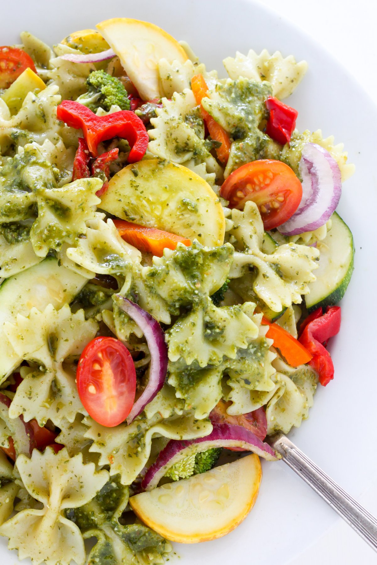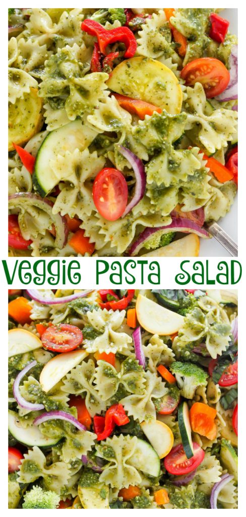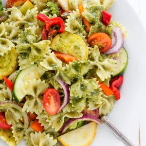 Summer is here and it has me craving all of the veggies and all of the pasta salad recipes! So I decided to combine my cravings and create this epic veggie lovers pasta salad recipe! It’s loaded with fresh veggies and covered in flavorful pesto! This recipe is so flavorful and always a hit at parties!