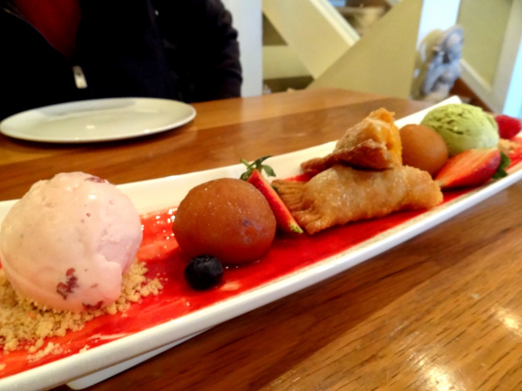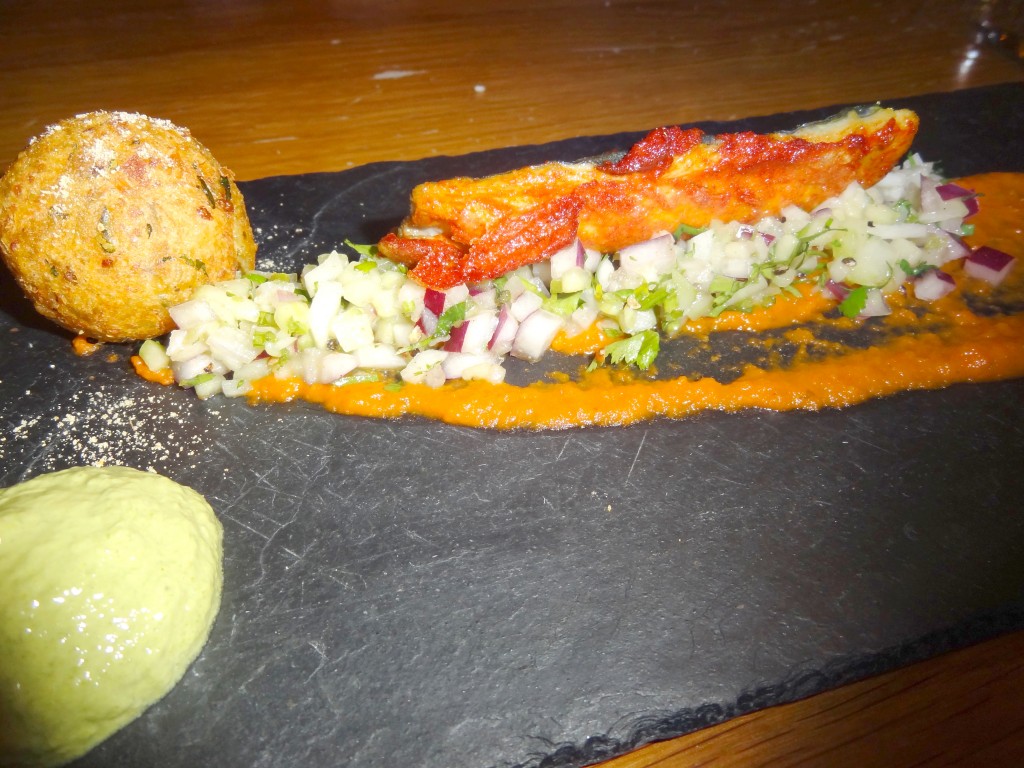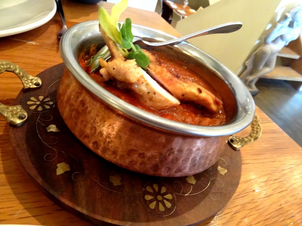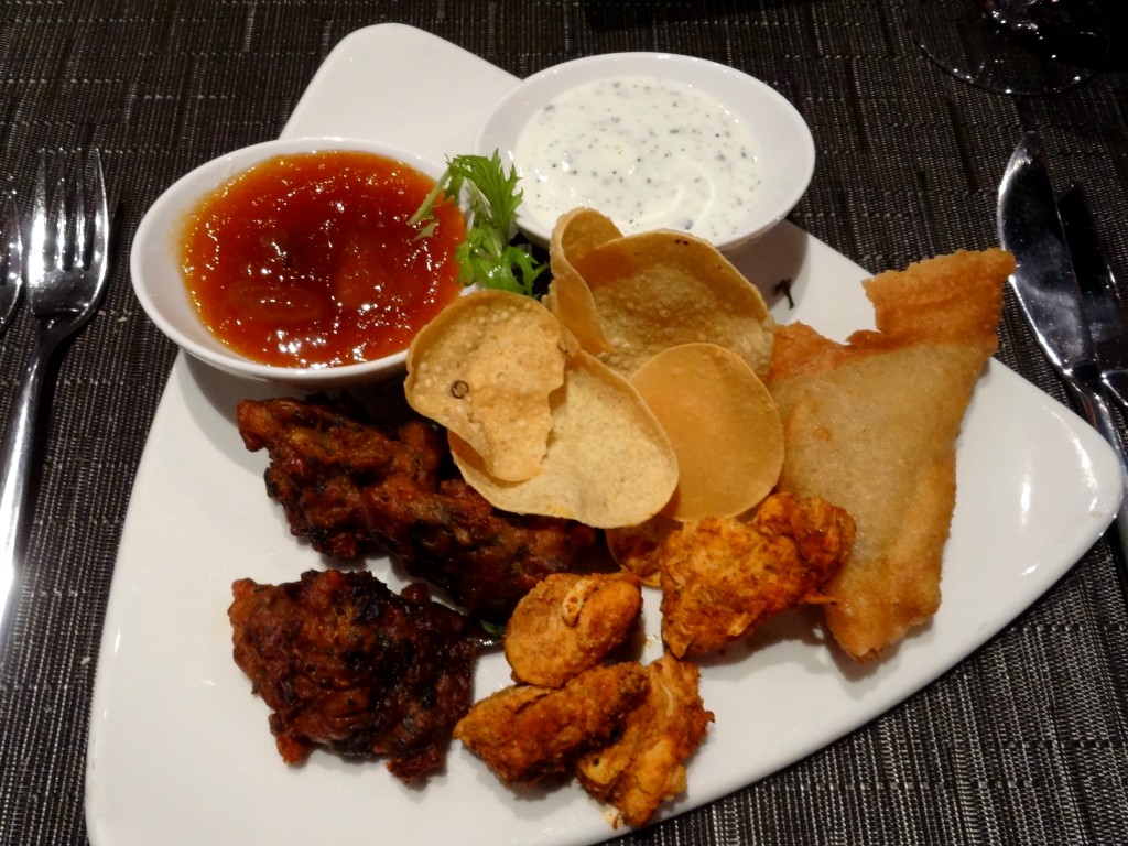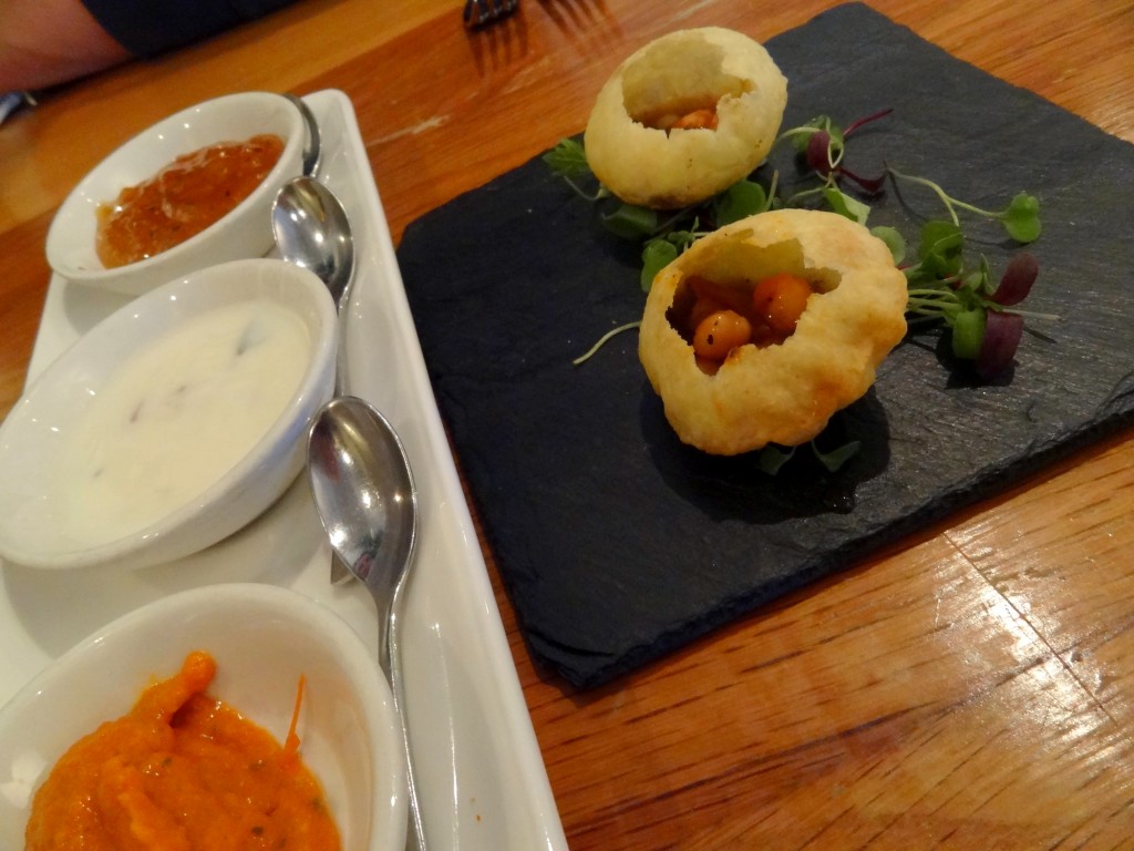 Nous avons choisi, comme entrées, des « pakora » aux oignons et maïs doux, servi avec un chutney de tomate et de lentilles, ainsi qu’un « recheado » de maquereau écossais, avec un masala de chilli et ail. En plat, nous avons goûté deux plats de poulet: le Murgh jalfrezi (poulet des Cotswold dans une sauce épicée à l’oignon, tomate et poivre), et le Kukkar makhani (poulet de style Punjabi, sauce tikka). Pour le dessert, nous avons choisi un assortiment à partager, délicieux, avec de la glace à la fraise et à la pistache ainsi que de délicates pâtisseries indiennes.