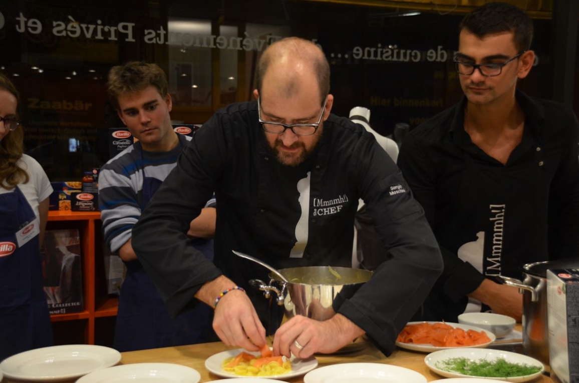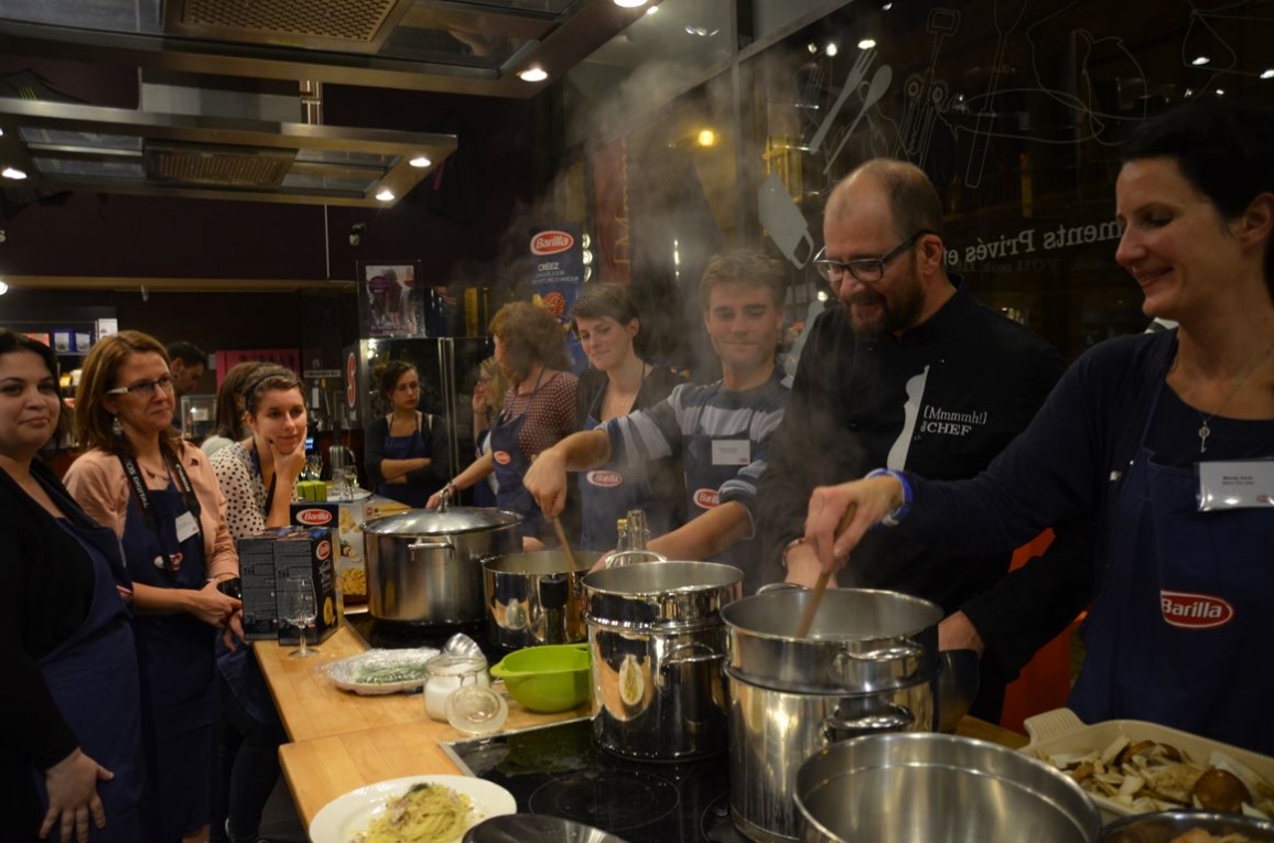 Des recettes à base de pâtes pour les fêtes de fin d’année? Une drôle d’idée? Pas tant que ça ! Mariées à quelques ingrédients nobles et de saison, les pâtes peuvent être une entrée à la fois simple et raffinée (et oui, les vraies pâtes, on ne les mange qu’en entrée, comme en Italie !). C’est chez Mmmmh ! que Sergio Moschini nous a proposé il y a quelques semaines de cela 4 idées de recettes à base de pâtes assez simples à réaliser mais ayant tout à fait leur place dans une assiette de fête, en collaboration avec Barilla. Fred et moi avons pu mettre la « main à la pâte » pour les réaliser, et avons au passage appris quelques petites astuces (serez-vous aussi étonnés que nous?) pour réaliser des pâtes parfaites, dans le respect de la tradition italienne…