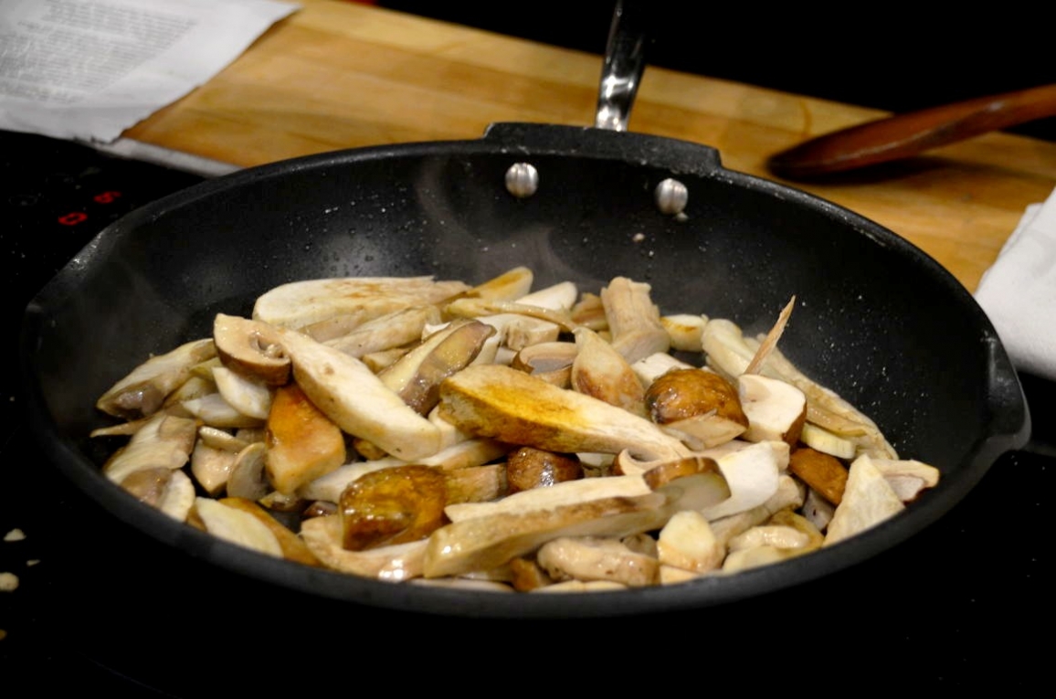 - Dans une sauteuse, verser l’huile d’olive restante, y faire colorer les cèpes avec l’ail.