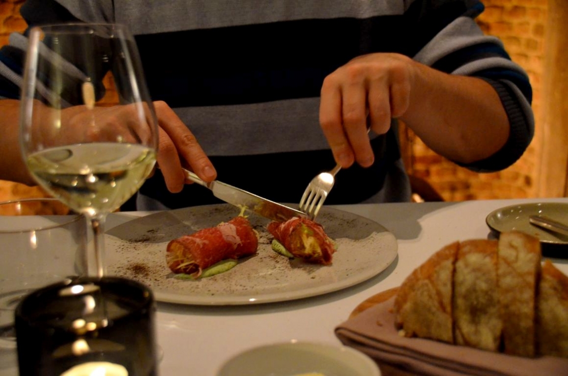 Sur notre table, le menu du jour nous attend. Après quelques mises en bouche, nous commencerons en entrée par un produit très local, le « West-Vlaams Rood », une race de boeuf élevée en Flandre Occidentale, accompagné de pommes de terre, estragon et oignon. Un plat très bien pensé, goûteux, un vrai plaisir.
