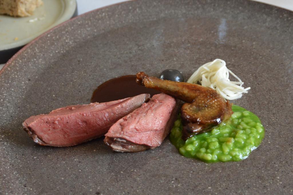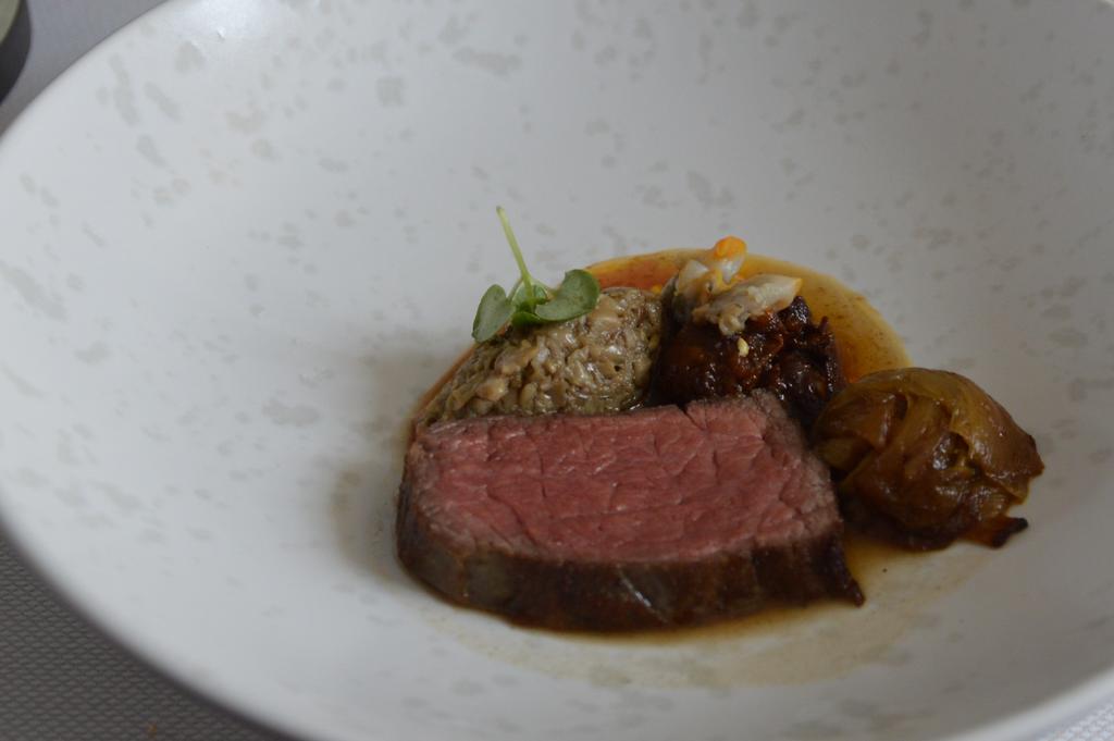 Vous en voulez encore? Tant mieux, nous n’en sommes qu’à la moitié ! On continue donc avec le cabillaud sauce au chorizo (De Jager), le sublimissime choux brûlé-kimchi-navet (Benoît Blairvacq), et le pigeonneau (deuxième coup de coeur, quelle tendresse cette viande !) – ail noir et citron confit hommage à Jean-Yves Bruyerre. On retrouve ensuite Filip Rondou qui fait décidemment de la bonne viande avec un Angus Beef 60 jours de maturation, furikaké et coques. Dernier plat salé, le chèvre frais – scarole, lard, façon tarte al’djote (Père Françis – Ciplet).
