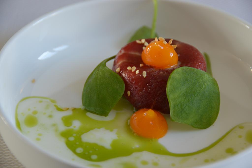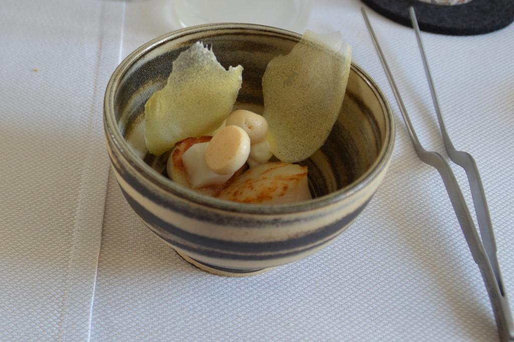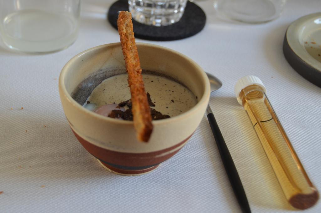 La danse des plats (ou des oeuvres d’art, c’est comme on veut… ) commence avec le BBB en salaison du boucher Filip Rondou, accompagné de fromage frais, suivi par l’anguille fumée-Kalamansi et poudre de foie gras mettant à l’honneur la Ferme de la Tour et Joël de Schrevel. Eh toi, fidèle lecteur qui me connais bien, je te vois déjà un peu interloqué: moi, anti-foie gras qui mange du foie gras?! Il faut dire que Sang Hoon voulait tellement nous surprendre que nous n’avons lu le menu qu’à la fin du repas ! Et pour le coup, il m’a donc bien surpris, mais il est tout pardonné, car je suis sure que Monsieur le producteur ne gave pas ses oies ou canards à la chaîne, et (j’espère) qu’il les traite quand même bien. Fin de la parenthèse, mais je me devais de le préciser car vous savez que c’est un sujet qui me tient à coeur ! Nous avons poursuivi la dégustation avec un petit gris et ses petits légumes, un plat assez traditionnel pour une fois, tout droit venu de chez Corinne Flamend et de la Ferme du Vieux Tilleul. Viens maintenant le tour du petit hommage à la Corée, avec un délicieux plat à base de Saint-Jacques blanches et de topinambour. Ensuite, mon gros coup de coeur du jour, un plat qui rappelle les petits soldats que nos mamans nous faisaient pour accompagner nos oeufs quand on était petits (dommage que nos mamans n’avaient pas deux étoiles elles aussi… ): l’oeuf oméga 3 accompagné de truffes de Carpentras, le plat dédié à la Ferme de Frocourt. Accompagné de vin blanc à boire dans un petit tube style éprouvette de chimie: quelle bonne idée ! Un hommage bien placé à cette cuisine moléculaire que Sang Hoon apprécie tant.