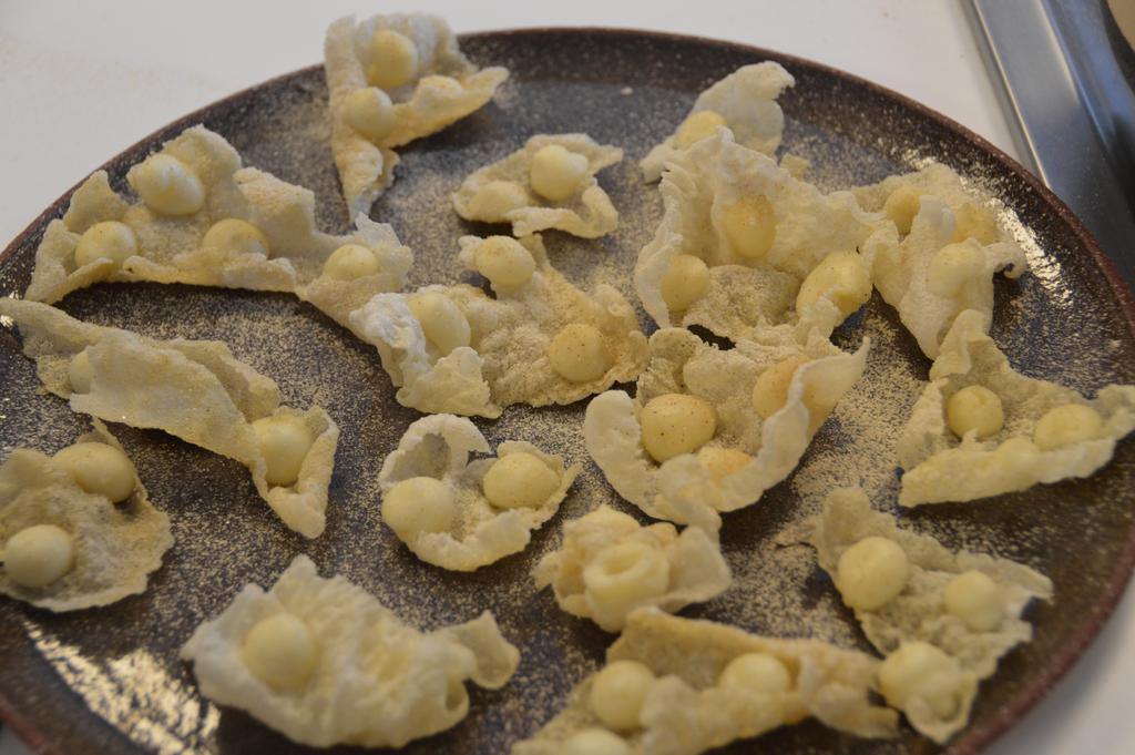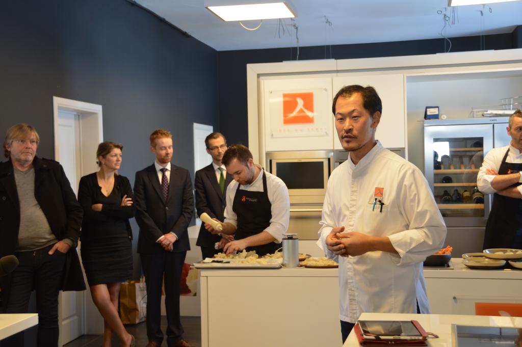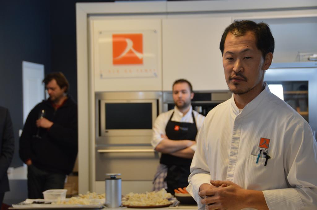 Viens maintenant le temps de la dégustation… Ou plutôt des nombreuses dégustations, car Sang Hoon nous a encore une fois gâtés et épatés, en transformant le « petit lunch » prévu au programme en une après-midi de découvertes culinaires avec des plats plus grandioses les uns que les autres (pour notre plus grand plaisir, bien entendu!). Comme je vous l’ai déjà dit, ce sont ses producteurs qui étaient aujourd’hui à l’honneur dans le menu. Chaque dégustation mettait donc en valeur des produits de l’un de ses fidèles producteurs. Avec, comme accompagnement et en alternance, de très bons vins blancs (et un rouge, ne l’oublions quand même pas) et ses traditionnelles eaux aromatisées (mention spéciale pour le millésime 2010 « Les Creisses », vin de Pays d’Oc, et pour l’eau Topinambour – citron vert).
