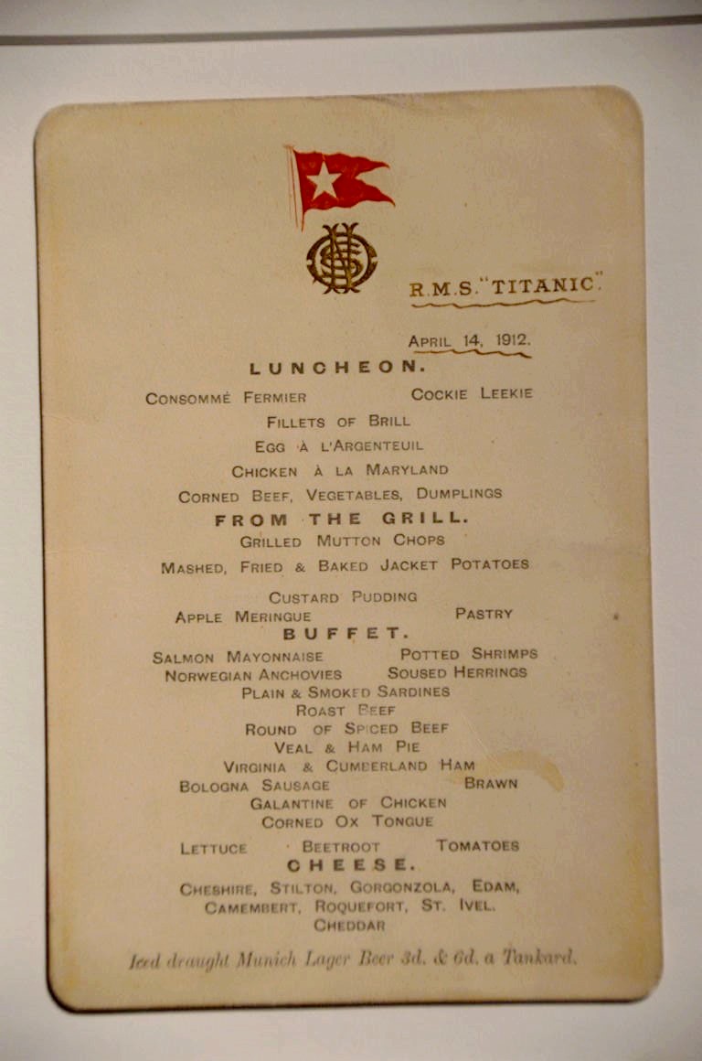 Ce menu est l’une des reliques les plus intéressantes du Titanic. Il s’agit du dernier repas servi aux passagers de première classe !