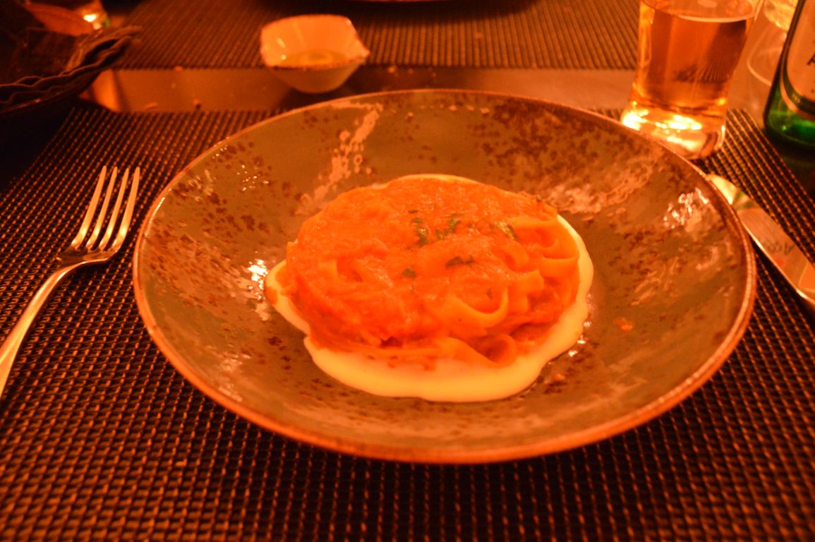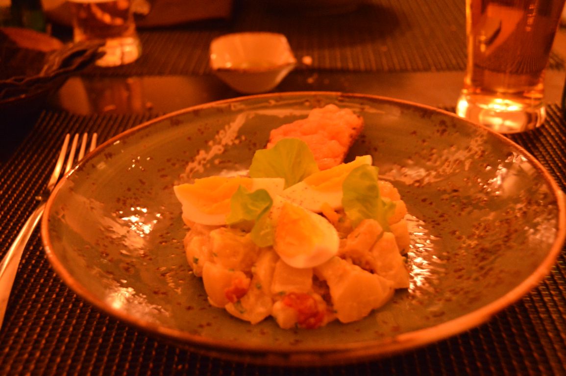Nous y rencontrons notre guide pour la durée de notre séjour grec, Giorgios, un grec à l’accent parisien, qui connait son pays par coeur ! Après avoir planifié avec lui les 3 jours à venir, nous réceptionnons notre voiture de location, ça ça sera pour plus tard. Pour l’heure, il est l’heure d’aller manger (avec tout ça il est déjà 20:30). Direction donc le restaurant de l’hôtel, Bakù, qui propose une cuisine aux influences grecques mais très moderne et variée. Comme nous sommes en demi pension, nous avons droit au menu, qui comporte deux choix d’entrées, plats et desserts, que Fred et moi nous partageons pour nous faire une idée de chaque. Salade à l’huile de truffe, salade de patates chaudes avec tomates confites et oeufs, poulet croquant et son taboulé, tagiatelles fraiches aux tomates et à la mozzarella du Bufala, crème de pistache et sorbet vanille, et enfin cheesecake à la fraise.