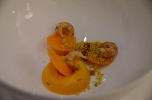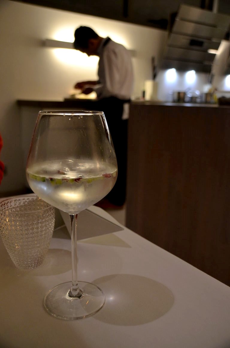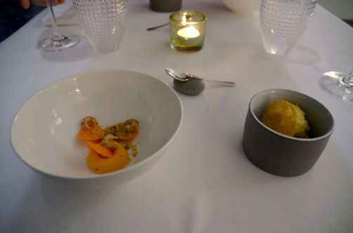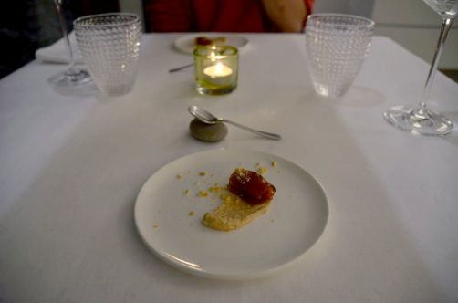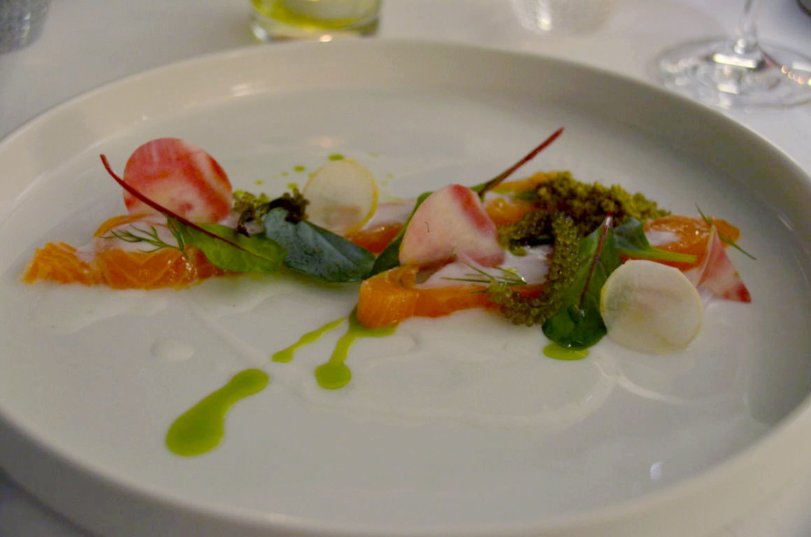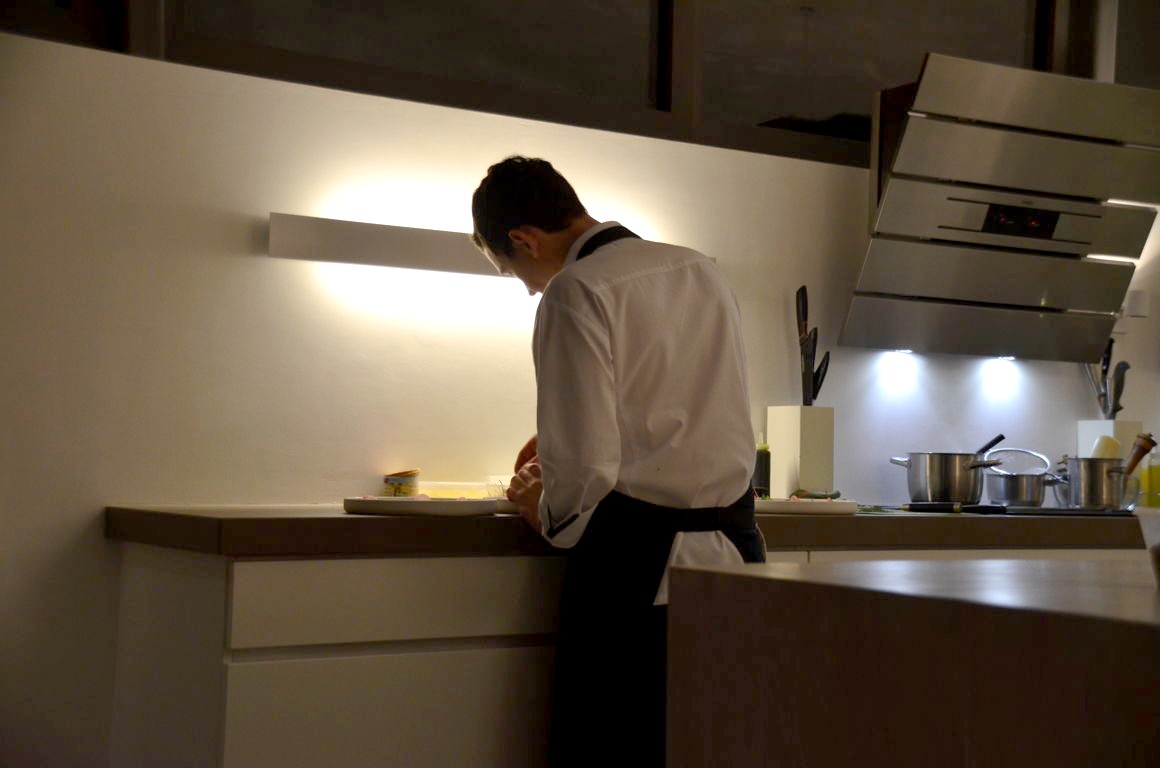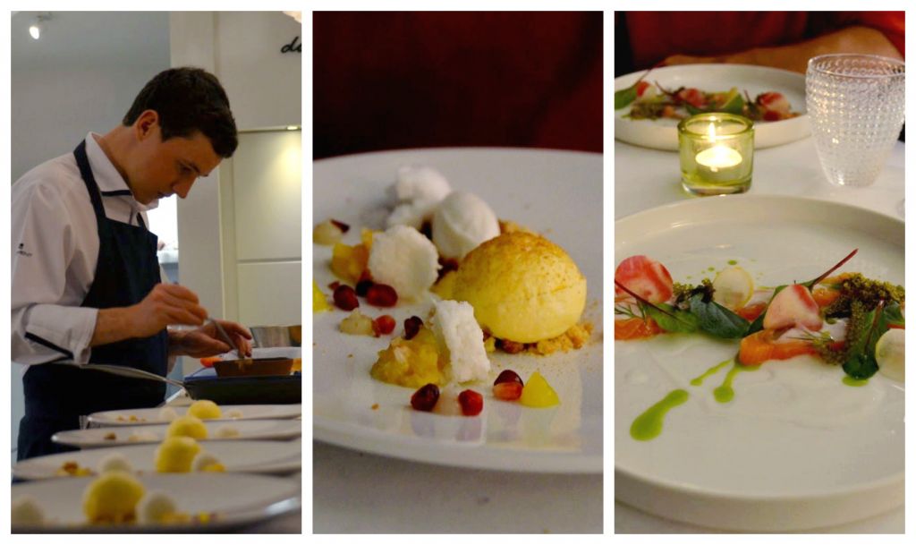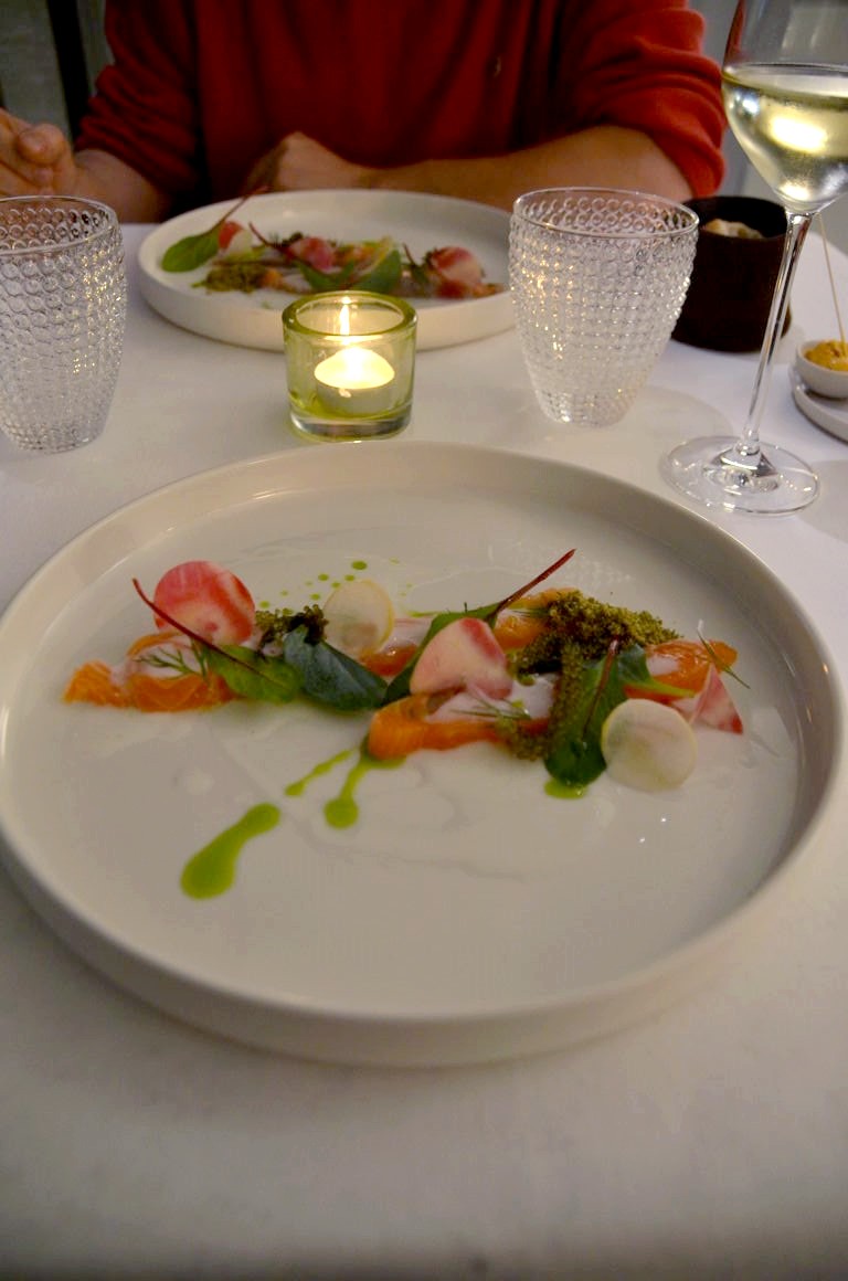 La première entrée, le saumon – aneth – épices, est le chef d’oeuvre du menu, préparée par Martin que nous pouvons voir travailler en cuisine. Un régal aussi bien pour les papilles que pour les pupilles !