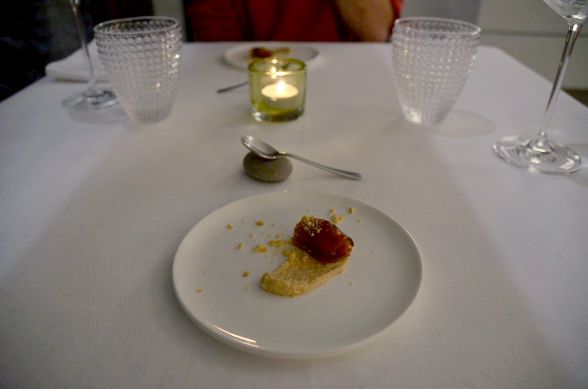 Après un délicieux gin tonic floral en apéritif et quelques mises en bouche prometteuses, nous nous laissons tenter par le « Menu Quintessence », le menu dégustation de L’Amandier (7 services), en harmonie avec les vins (prix total par personne : 102€). Et c’est parti pour une soirée très gourmande !