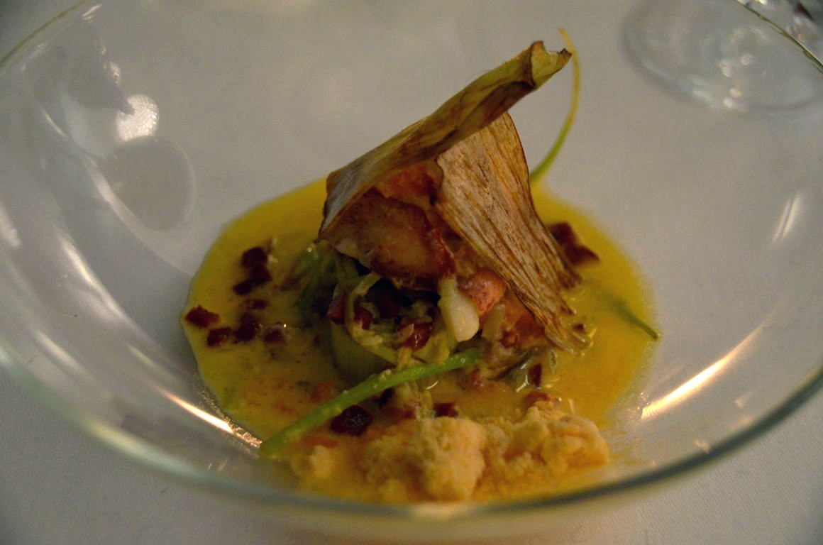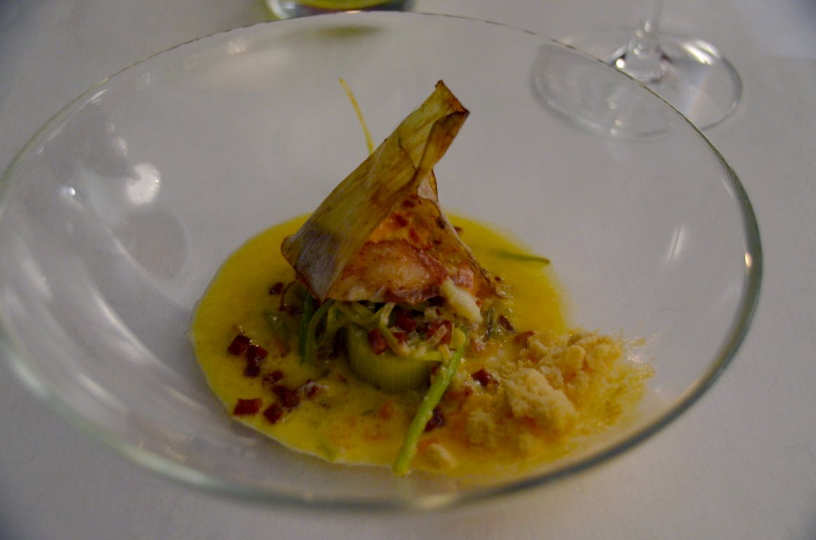 Vient ensuite un autre plat assez original à la fois dans sa présentation et dans ses mélanges de saveurs : le homard, poireau, chorizo. Le côté « cuisine du monde » et les influences diverses et variées des plats de L’Amandier sont décidément très intéressantes.