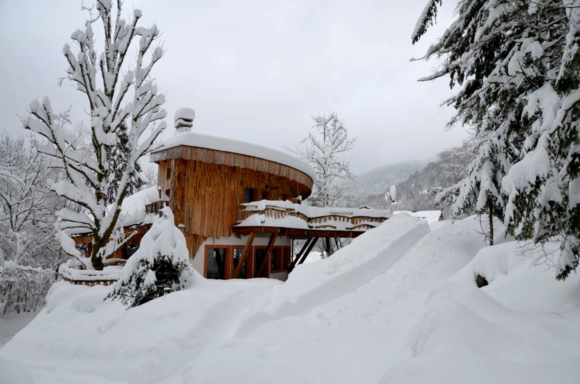 Cette impressionnante construction en forme d’escargot, construite en matériaux locaux et naturels, est la cabane d’accueil de la Clairière aux Cabanes.