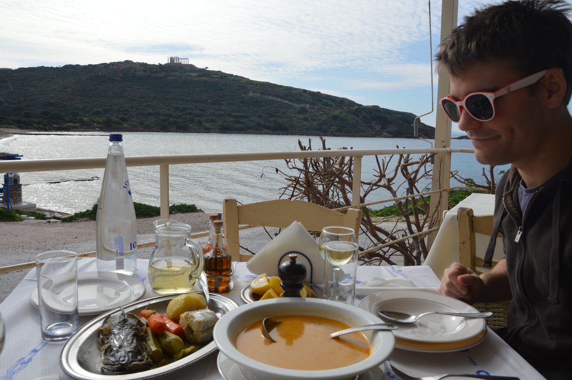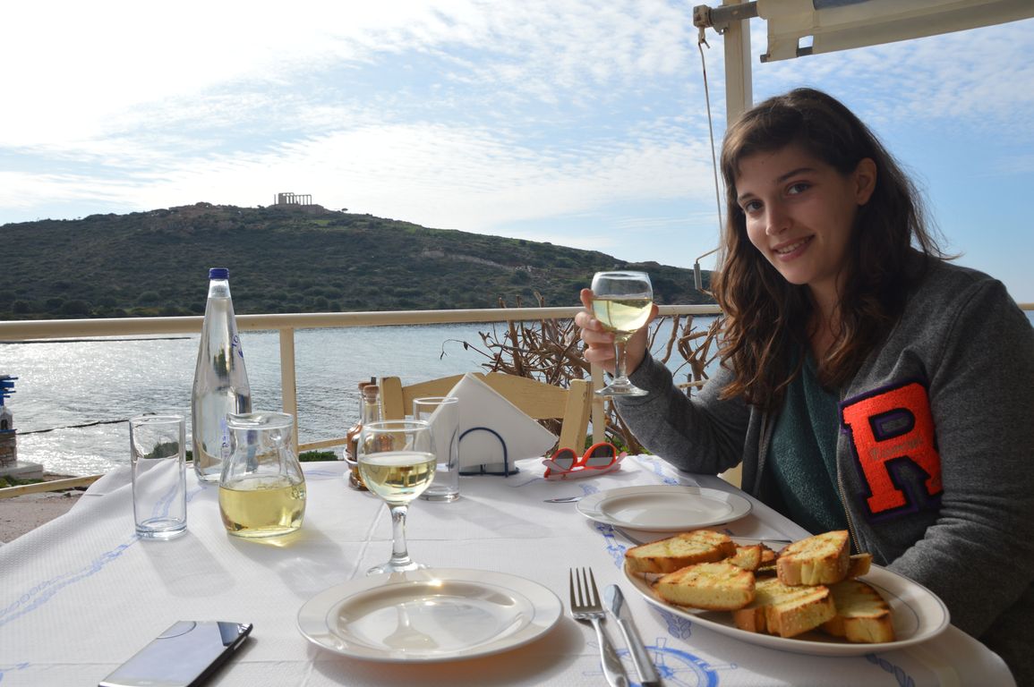 11:30 direction la petite taverne sur la plage en contrebas du temple, pour manger en terrasse, avec une vue sublime, avant de repartir vers l’aéroport d’Athènes. Le tour du monde des plus belles terrasses, on y est là! On y apprécie une dernière fois un bon verre de retsina et du poisson grillé ultra frais (il fait un peu peur, non?!).